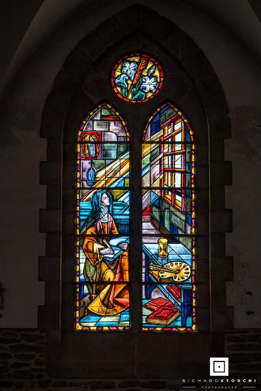 Découvrez 8 magnifiques vitraux qui retracent des moments forts de la vie de Ste-Thérèse : son enfance, sa vie au carmel, sa guérison par la Vierge….