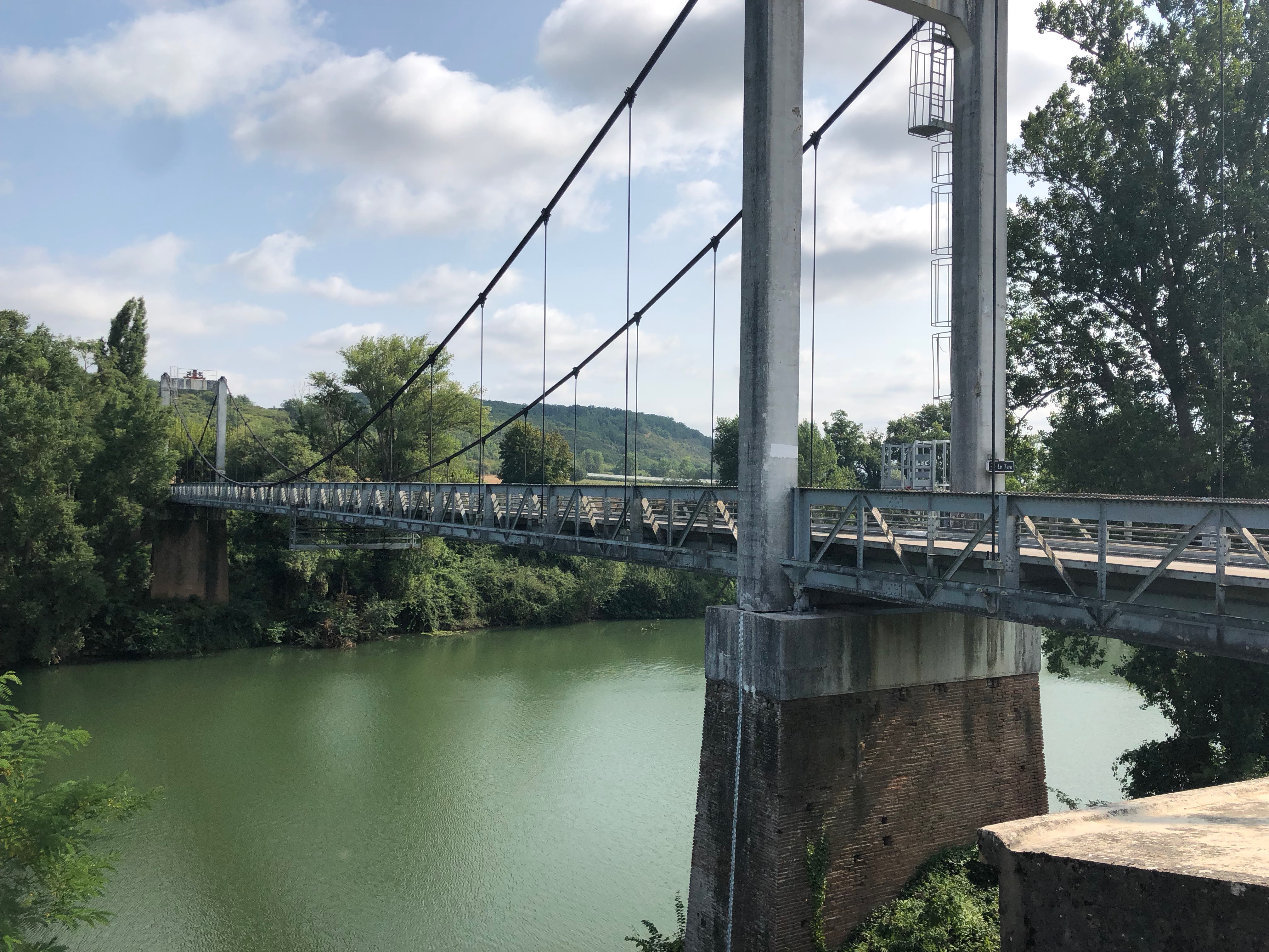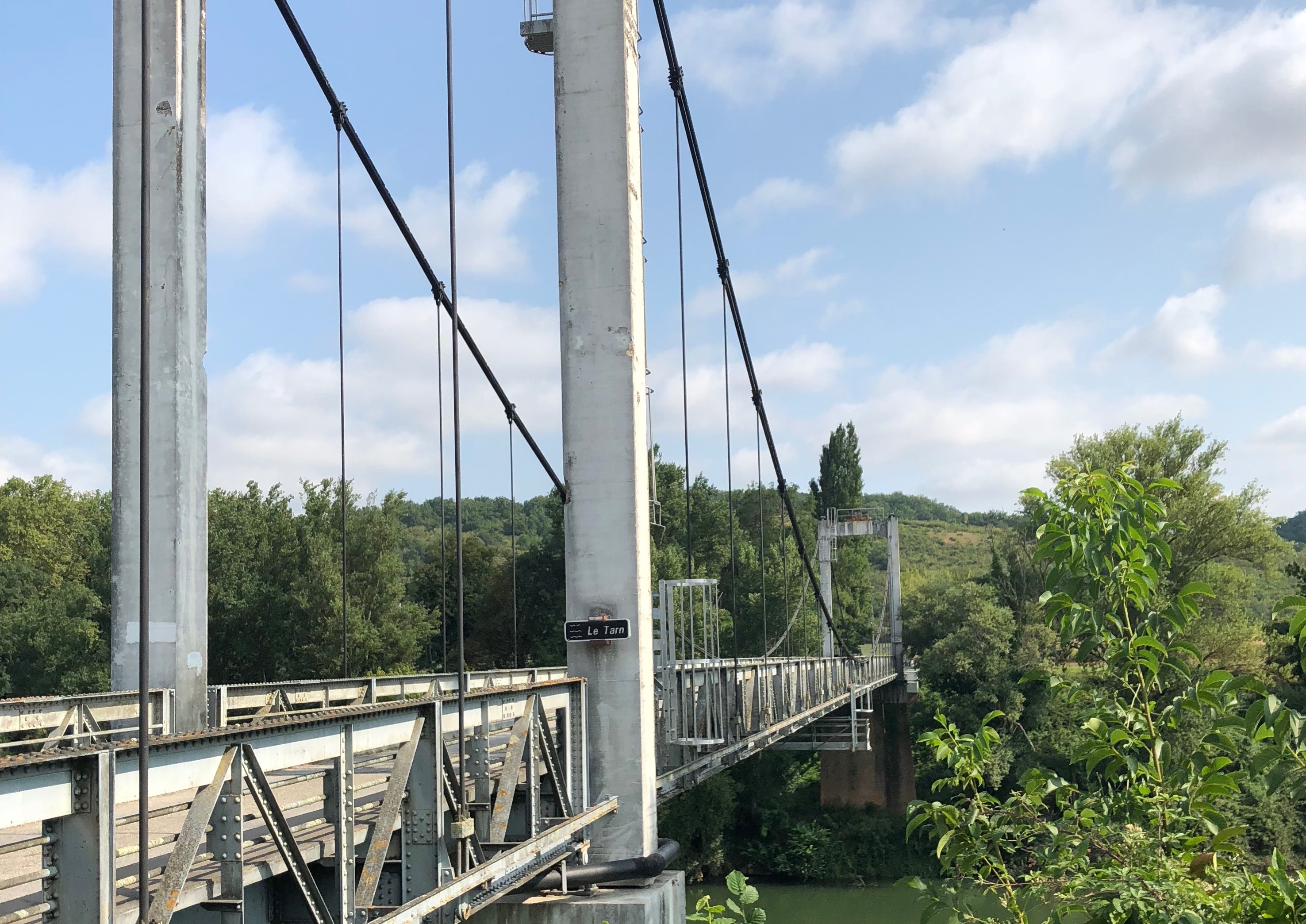 This bridge became more fragile over time, and was even partially or completely destroyed and rebuilt several times. It finally collapsed in 1718, and its remains can still be seen today. In the mid-18th century, the Languedoc government recognised that the bridge was in a state of disrepair and useless, and preferred the Saint-Sulpice-la-Pointe bridge on the Toulouse-Albi route. Between 1738 and 1839, the inhabitants of Buzet, who had benefited from the five-century-old bridge, had to resign themselves to taking a ferry across the Tarn to go and cultivate their land on the hillsides on the right bank… Oral tradition tells of many shipwrecks. The bridge was finally raised in 1872, but it was no longer able to cope with the increasing traffic as factories were built along the Tarn. It was replaced in 1924, but was swept away by the flood of 1930. The Buzet-sur-Tarn bridge crosses the Tarn to link the village to its hillsides. It has just one lane for traffic. Construction of the suspension bridge began in 1954 and was completed in May 1955. It was designed by engineer Georges Imbault of the Baudin Chateauneuf company, which specialises in metal constructions. It is made of red bricks, with reinforced concrete and steel foundations. The bridge is 150 metres long, 16 metres high above the Tarn and weighs 220 tonnes. The bridge was inaugurated on 15 August 1955 in the presence of Joseph Constant, former mayor of Buzet-sur-Tarn.