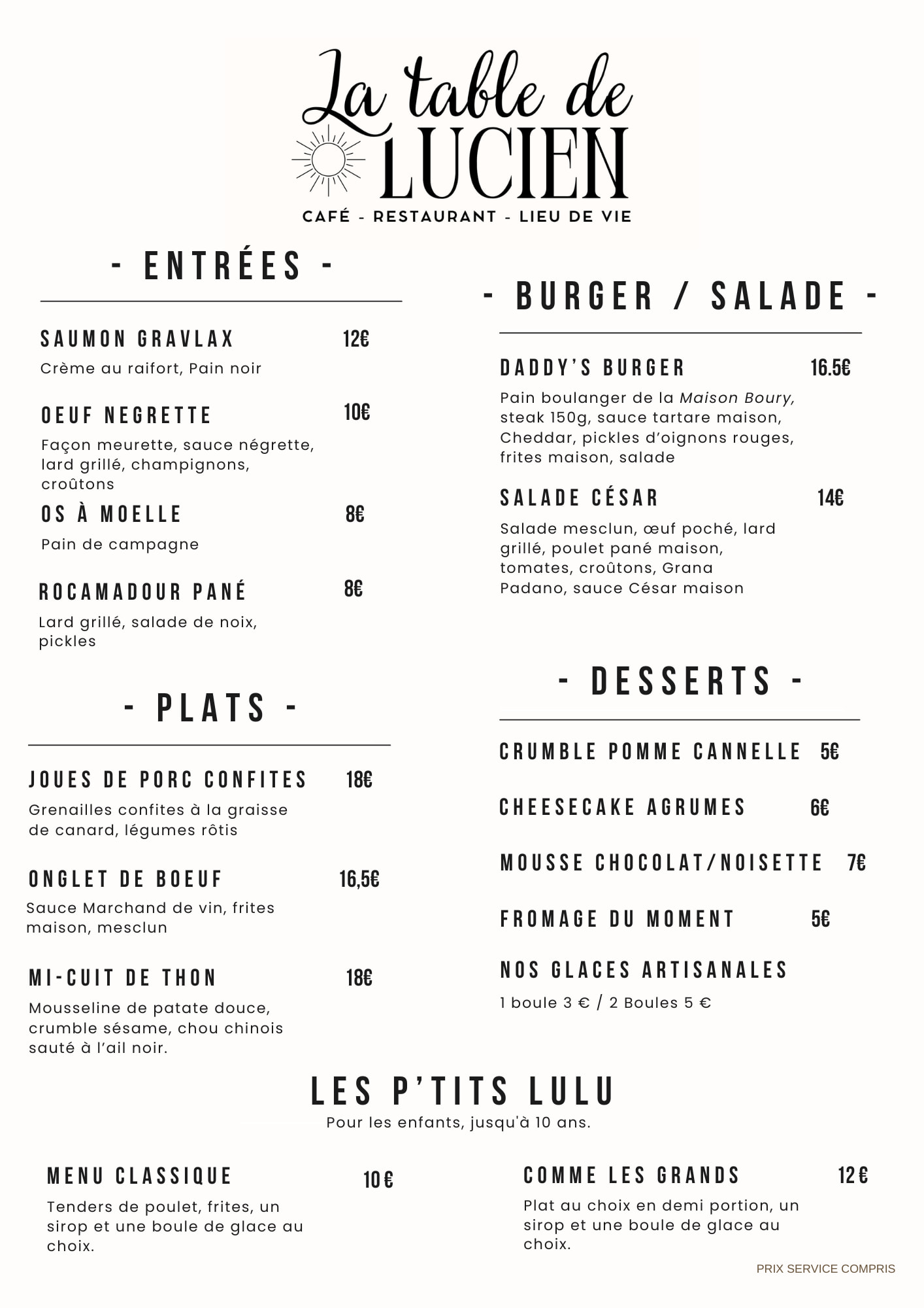 La Table de Lucien is above all the desire to bring people together in a friendly and warm setting, around beautiful dishes prepared with fresh and local products.