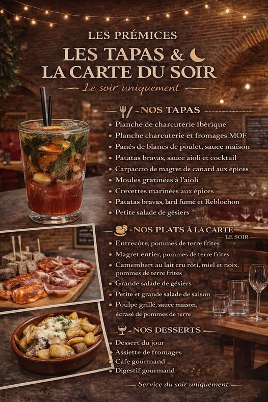 Located under the arcades opposite the town hall, the “Les Prémices” restaurant offers two unique menus, with a regularly changing slate, and tapas on weekends.
