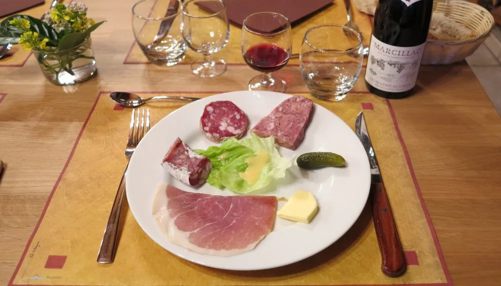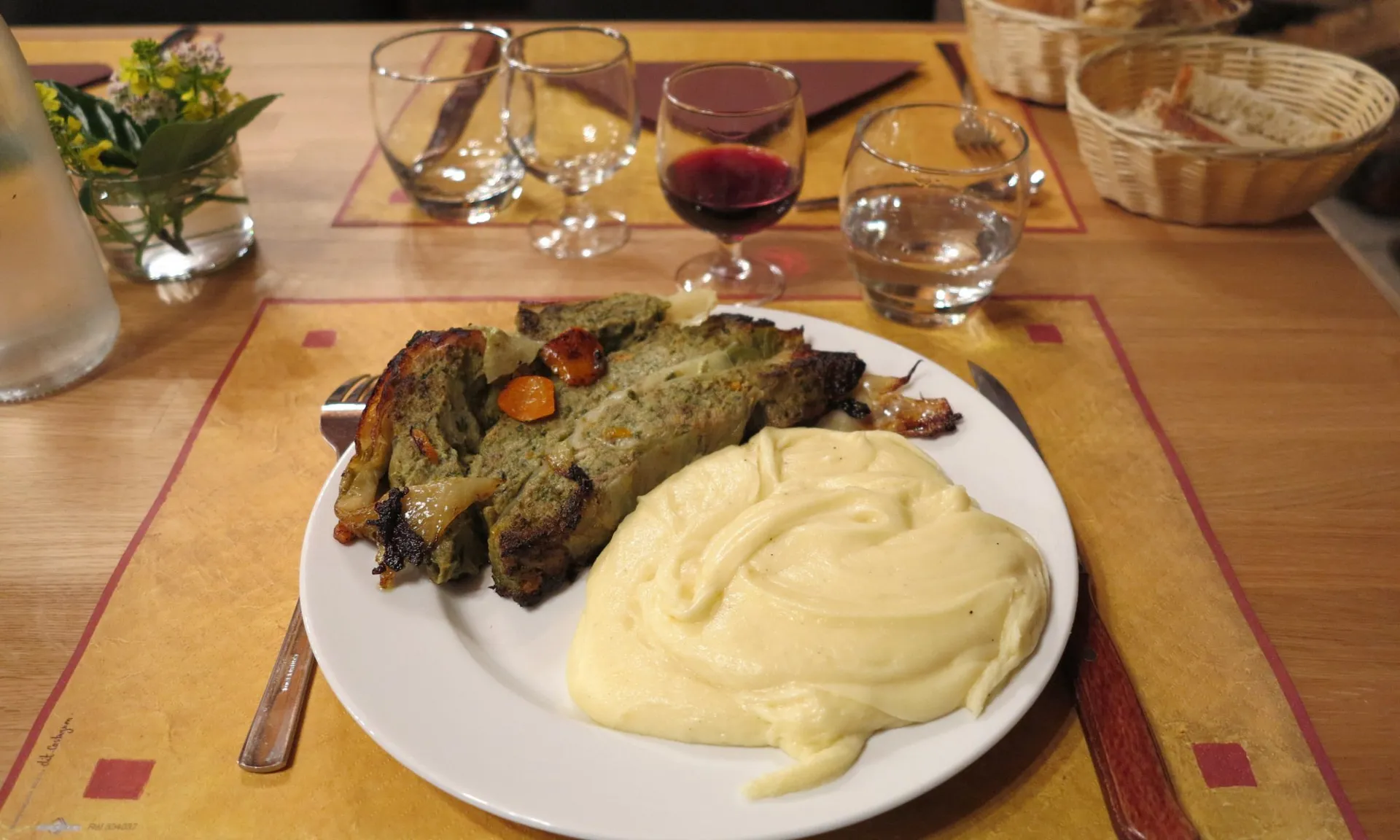 Meal at the Violette farm: regional products, homemade aligot or truffade, stuffed cabbage, Falette, Aubrac beef, homemade desserts.