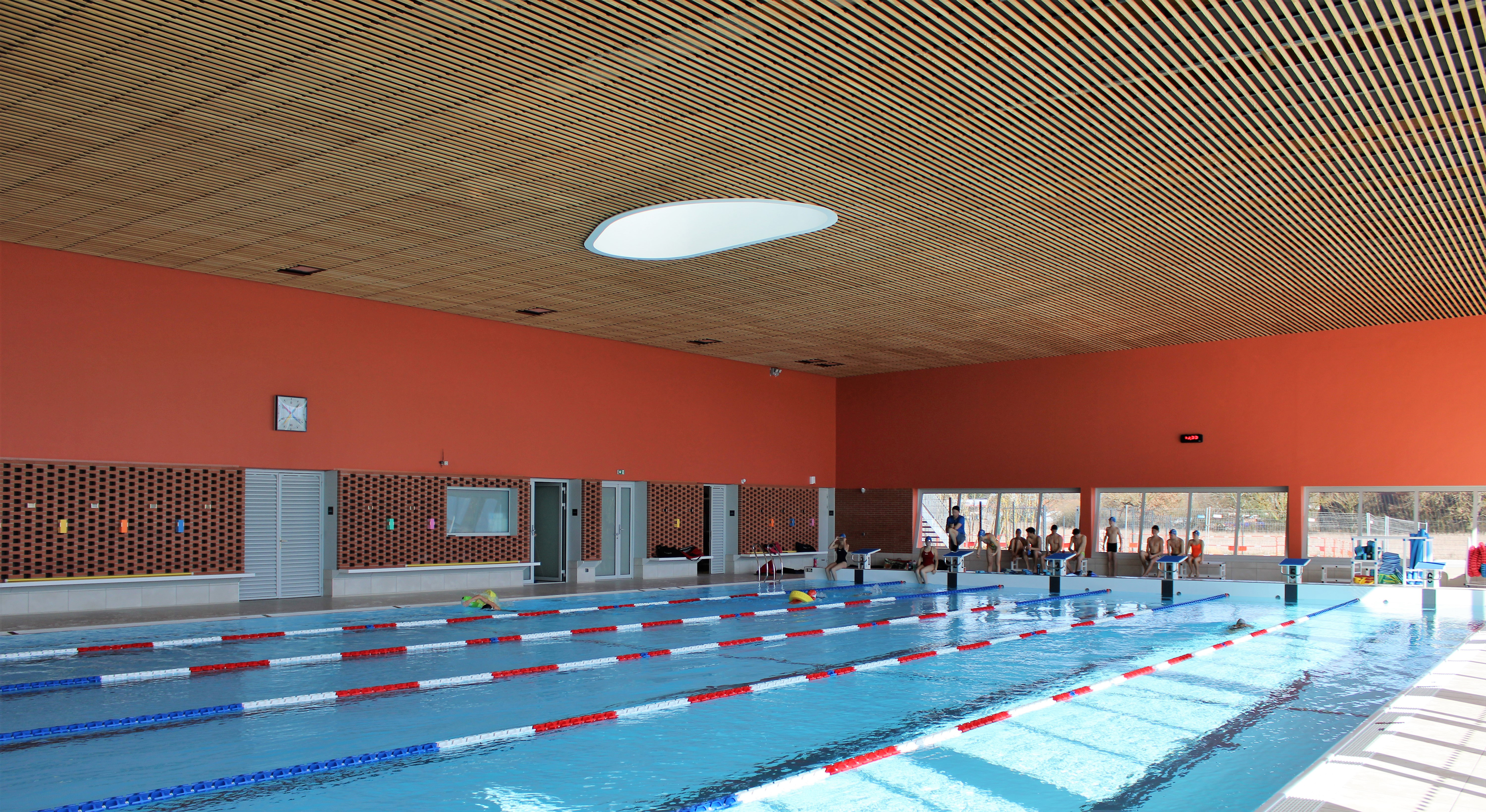 Bassin sportif de 25×15 mètres (6 lignes d’eau) et bassin d’apprentissage de 120m² à 3 niveaux d’eau (0,30m, 0,80m et 1, 20m) permettant les activités de type bébé nageur, aquagym et autres, plages avec baies vitrées ouvrantes donnant sur les espaces extérieurs.