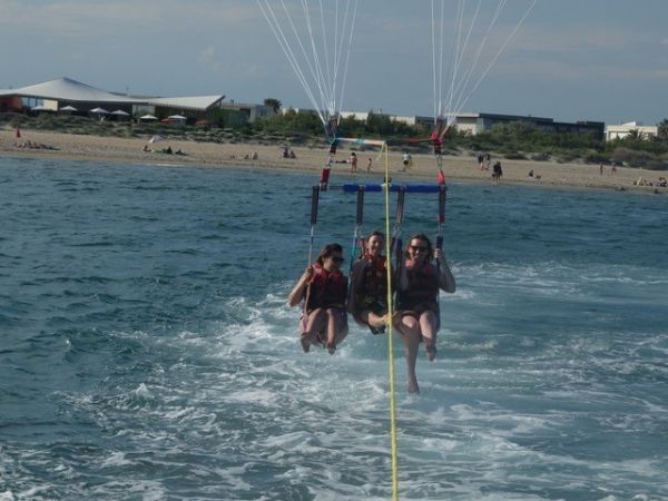 Discover water skydiving on board the Mercan Parasailing 32. Alone, in pairs or in threes under the same parachute, take off for a 360° aerial trip. Fly safely in your harness and discover a breathtaking view of the Mont Clair and Marseillan Plage.