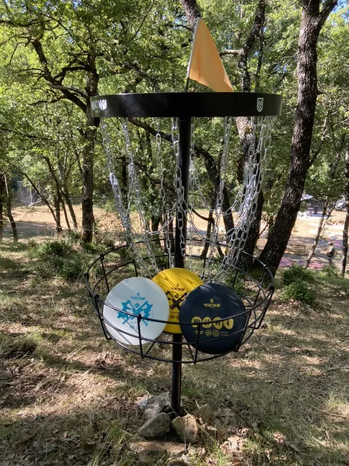 Un recorrido de 9 cestas de Disc Golf. El Disc Golf combina Frisbee y Golf, el objetivo del juego es alcanzar la canasta en un número mínimo de lanzamientos.
