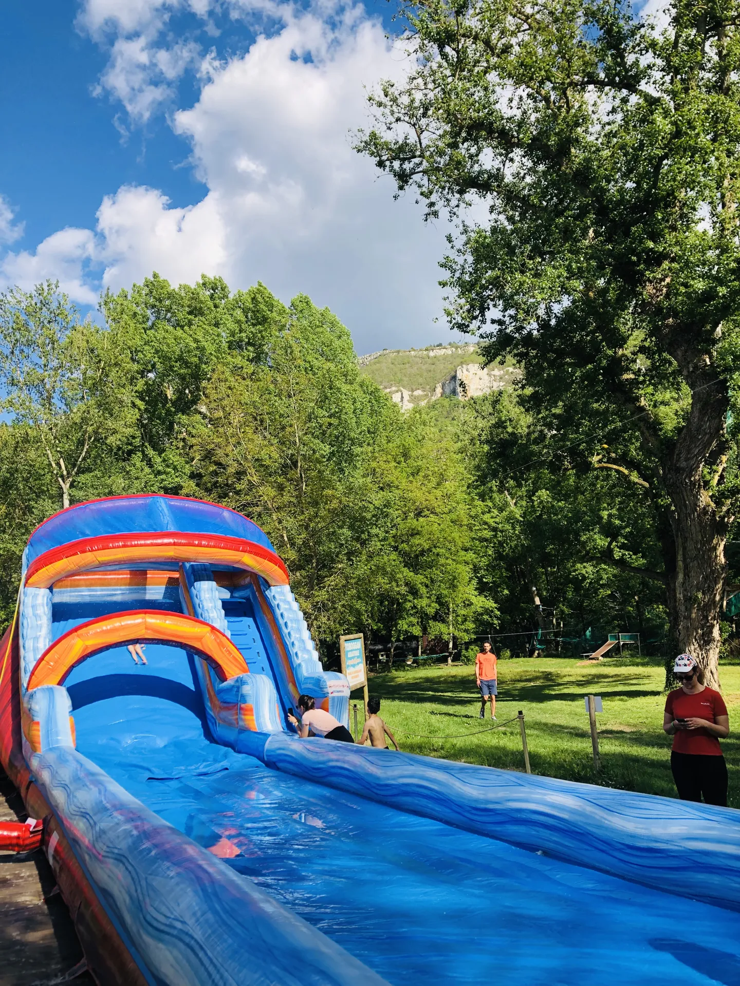 CHILDREN’S AREA from 3 years old : a giant net, a water slide with 31 m of vertiginous slide, inflatable structures, and go-karts. But also, the “Bambino”: a course like the grown-ups! Equipped with a harness, everyone can test their acrobatic abilities and challenge the laws of balance. With the help of their parents on the ground, this course climbs up to 2 meters high and offers various games of balance and climbing.