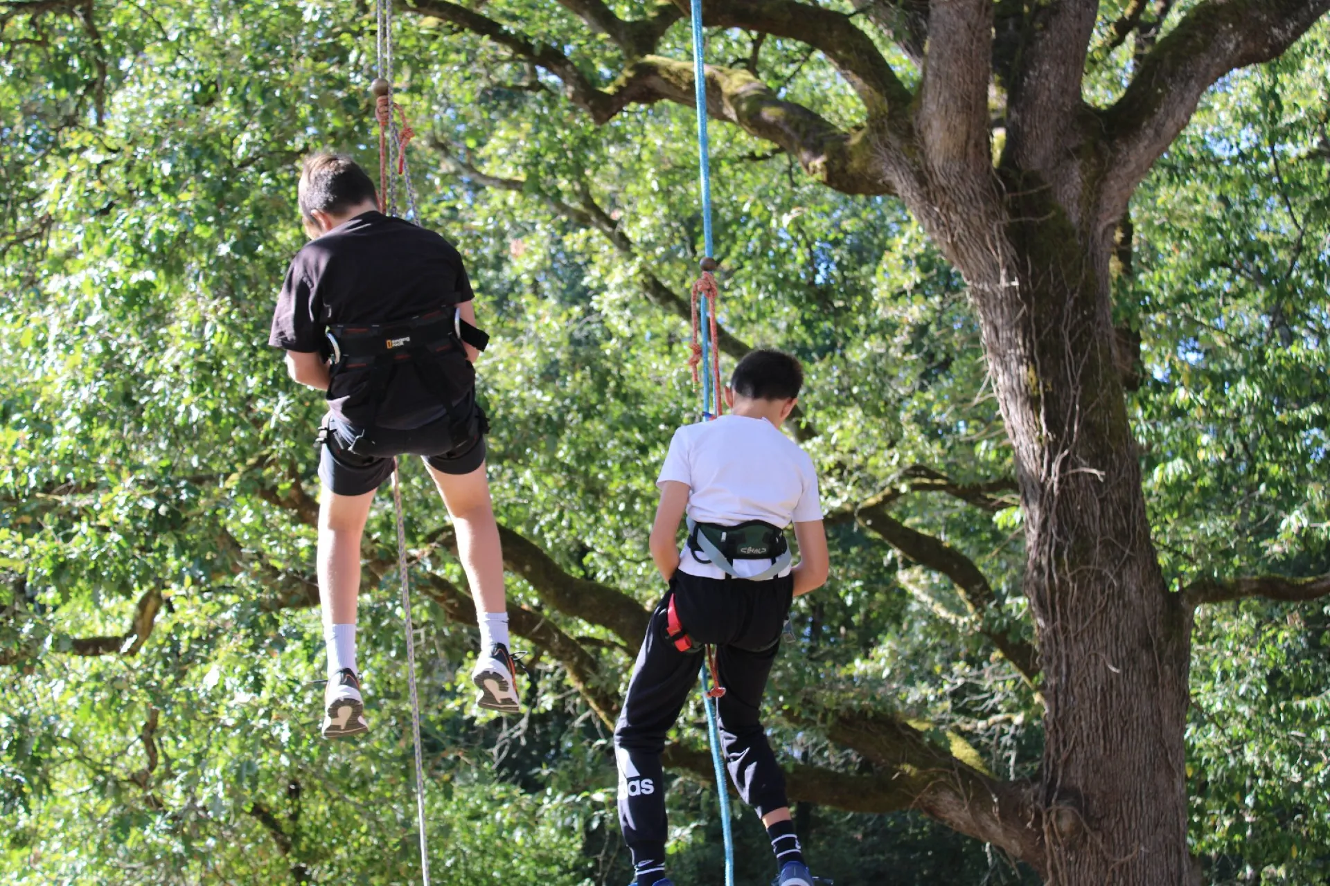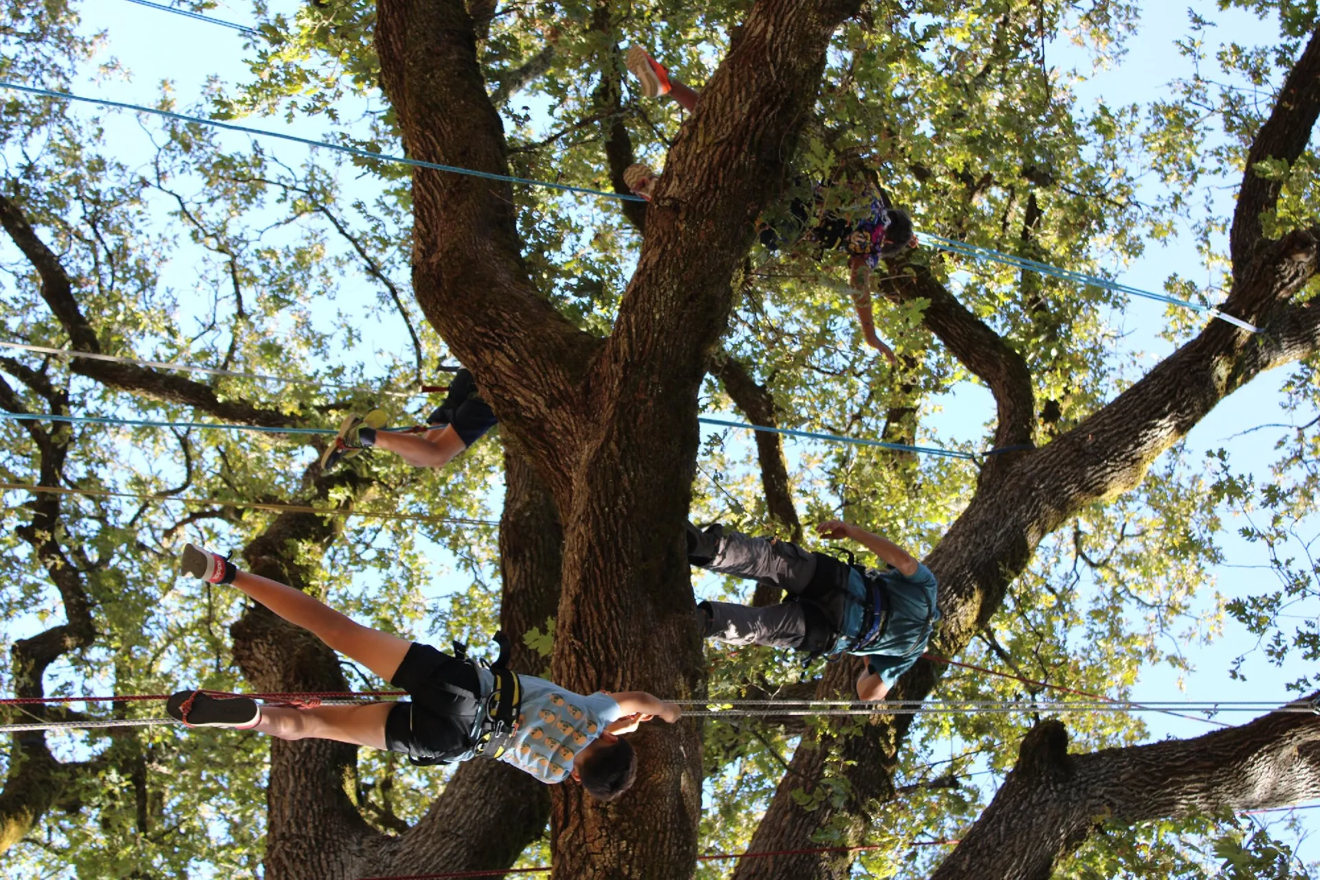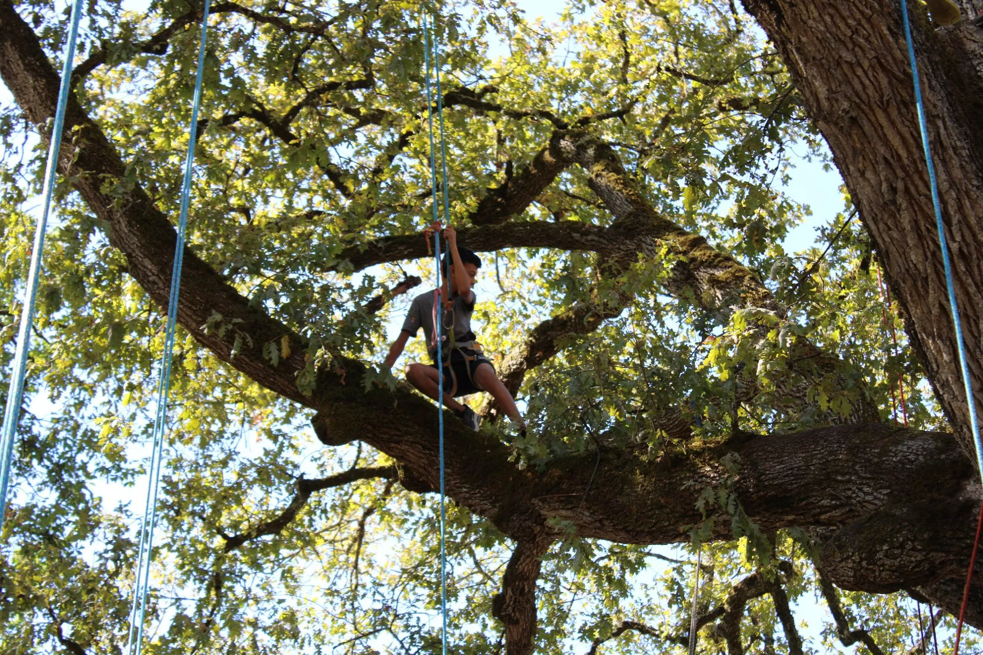 On peut escalader sur les branches de l’arbre quand il nous le permet, ou bien sinon, on se déplace verticalement sur notre corde pour aller explorer le milieu arboré.