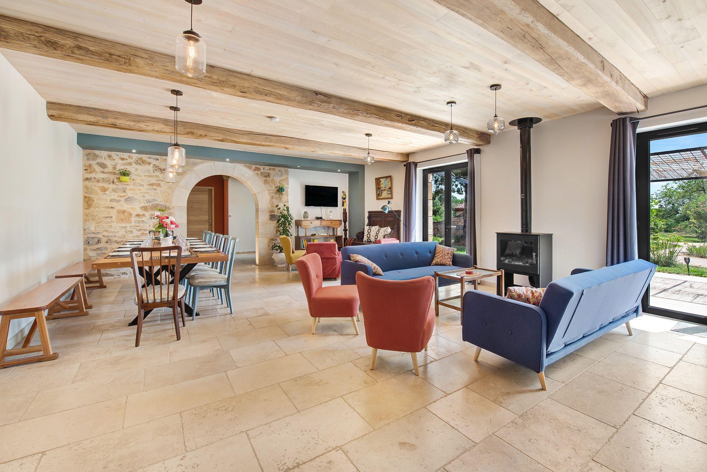 Beautiful, fully renovated stone house with, on the ground floor, an entrance hall giving access to a living room with sitting area (2 3-seater sofas on either side of a wood-burning stove, 4 armchairs, coffee table, TV, DVD player, Satellite TV), kitchen area (fitted units LV, MO, fridge, 1 additional fridge, 1 freezer), dining area. 1 ground-floor toilet with hand-washer and heated towel rail. 2 bedrooms accessible to people with reduced mobility (1 double bed each with en-suite shower room and toilet). Storage space under the stairs. Large terrace in front of the property with shade arbour. Enclosed swimming pool (secure gate) 10 x 4 with steps and paddling pool area. Pretty lawned grounds surrounding the gîte. Parking spaces in front of the building and electric charging point.