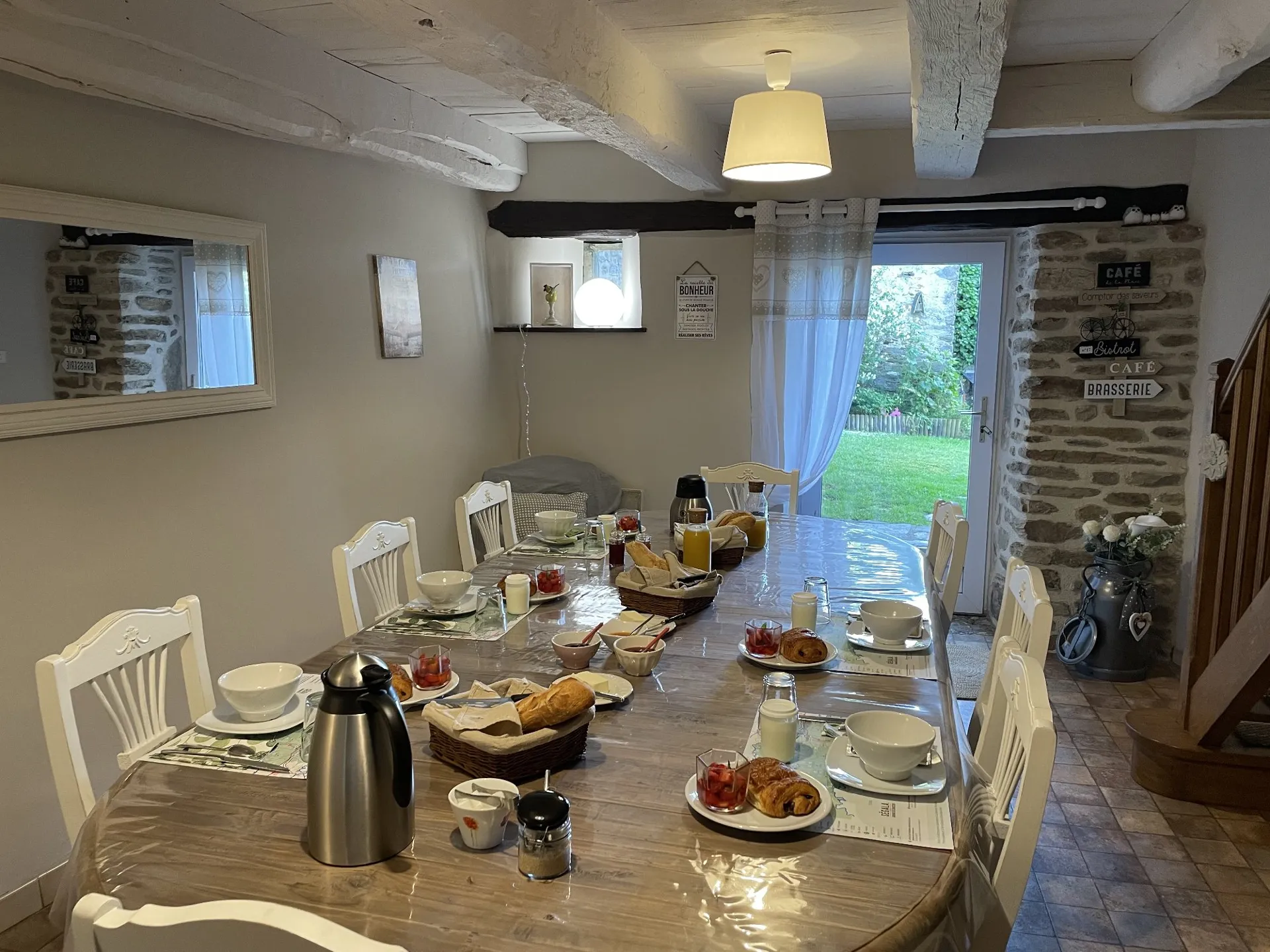 Por la mañana, le espera un desayuno casero, entre delicias dulces y frescura de productos orgánicos o locales. Un momento privilegiado para preparar un hermoso día de descubrimiento. Estaremos encantados, si lo desea, de aconsejarle para sus escapadas en el corazón de Aveyron.