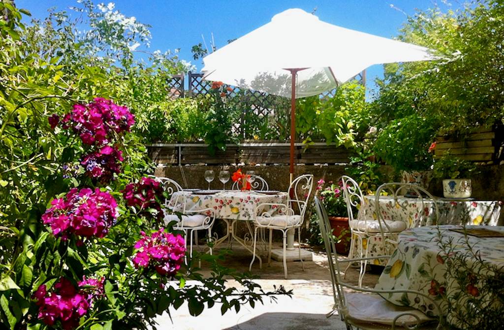 La terraza llena de flores para cenar y desayunar – © Corinne de Royer