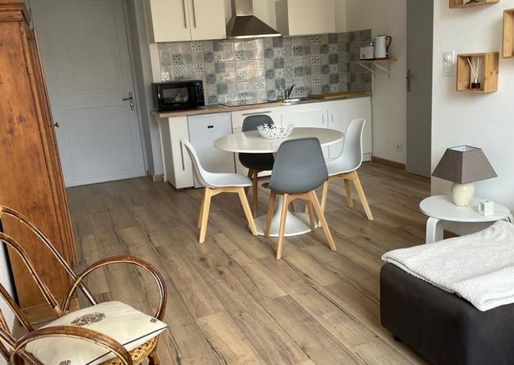 El alojamiento incluye una sala de estar luminosa con una cocina americana, elementos integrados (microondas, horno, nevera, placas), una zona de comedor (mesa y sillas) y sala de estar con sofá cama para 2 personas. 1 dormitorio (1 cama 140 x 200), 1 cuarto de baño (lavadora) y 1 aseo independiente. Acceso a una sala de lectura en el 1er piso. Wifi en la vivienda. Sábanas y toallas incluidas en el precio. Posibilidad de un paquete de secadora opcional.