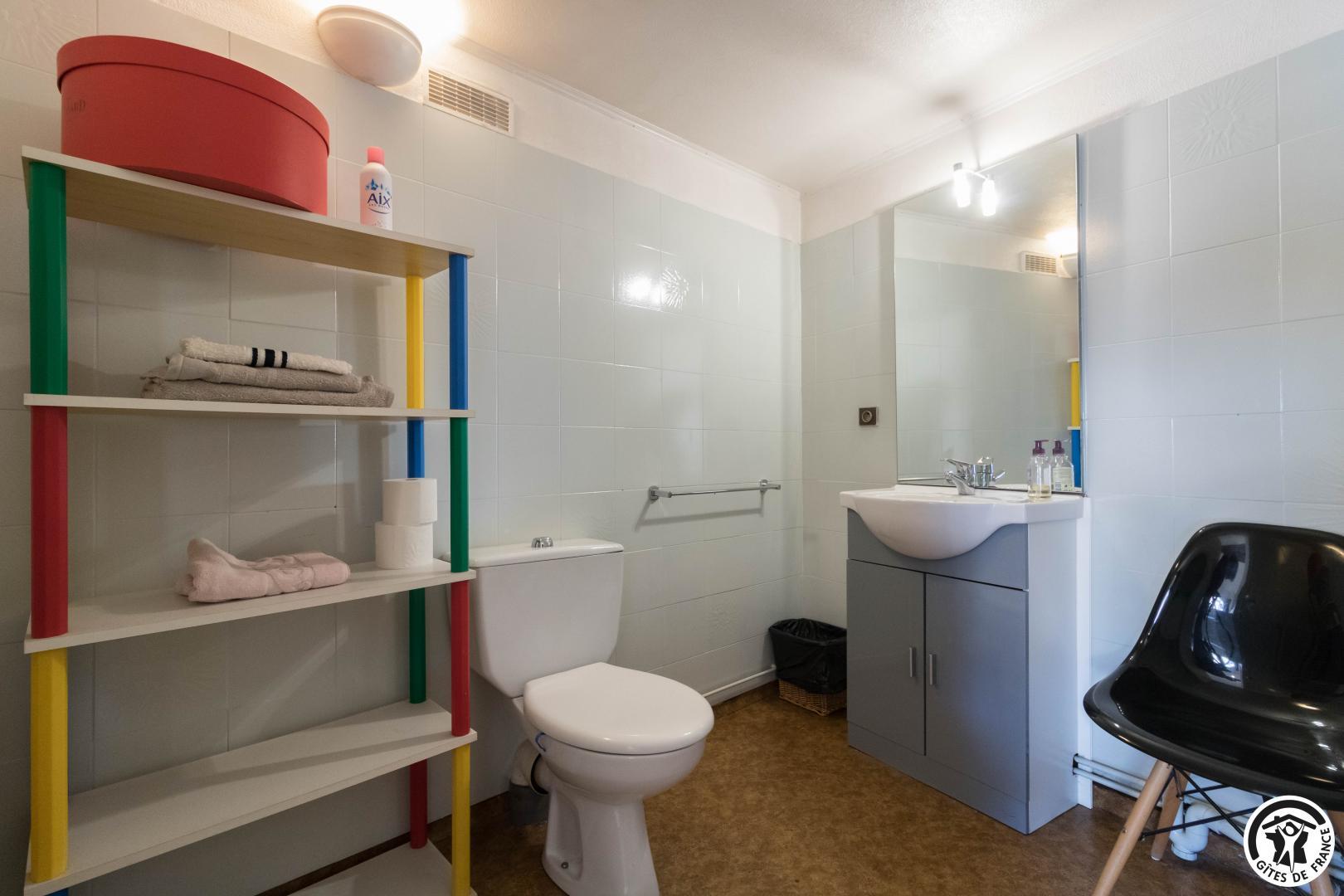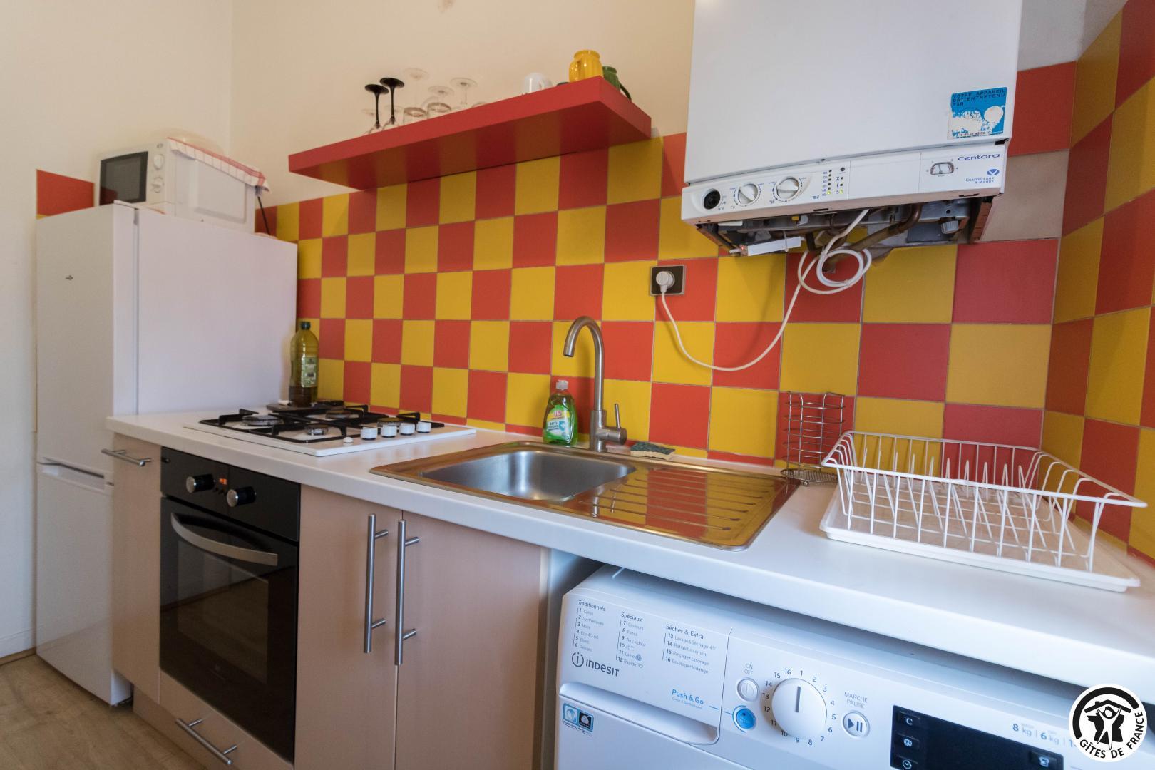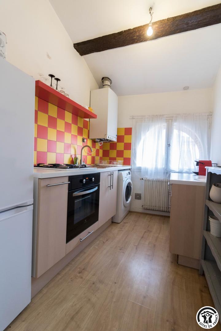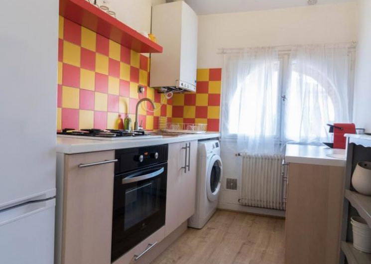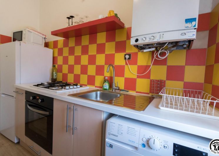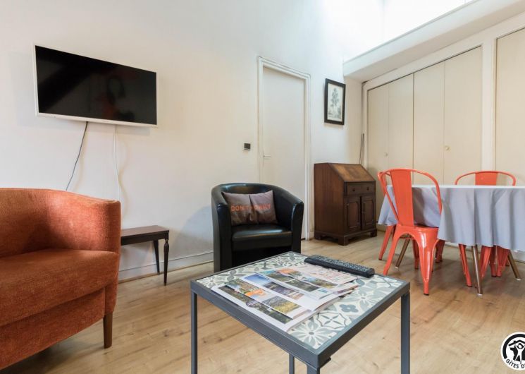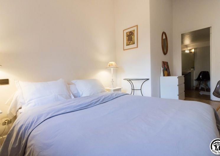 Descripción de las habitaciones: entrada, cocina equipada (placa de gas de 4 fuegos, horno, microondas, frigorífico-congelador), salón con rincón comedor y rincón salón (TV, escritorio, sofá cama para 1 persona), dormitorio (1 cama doble 140*190cm), cuarto de baño/WC (bañera y lavabo). Sin lavavajillas. Aparcamiento público en Les Carmes