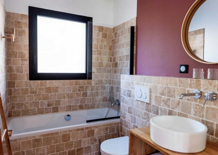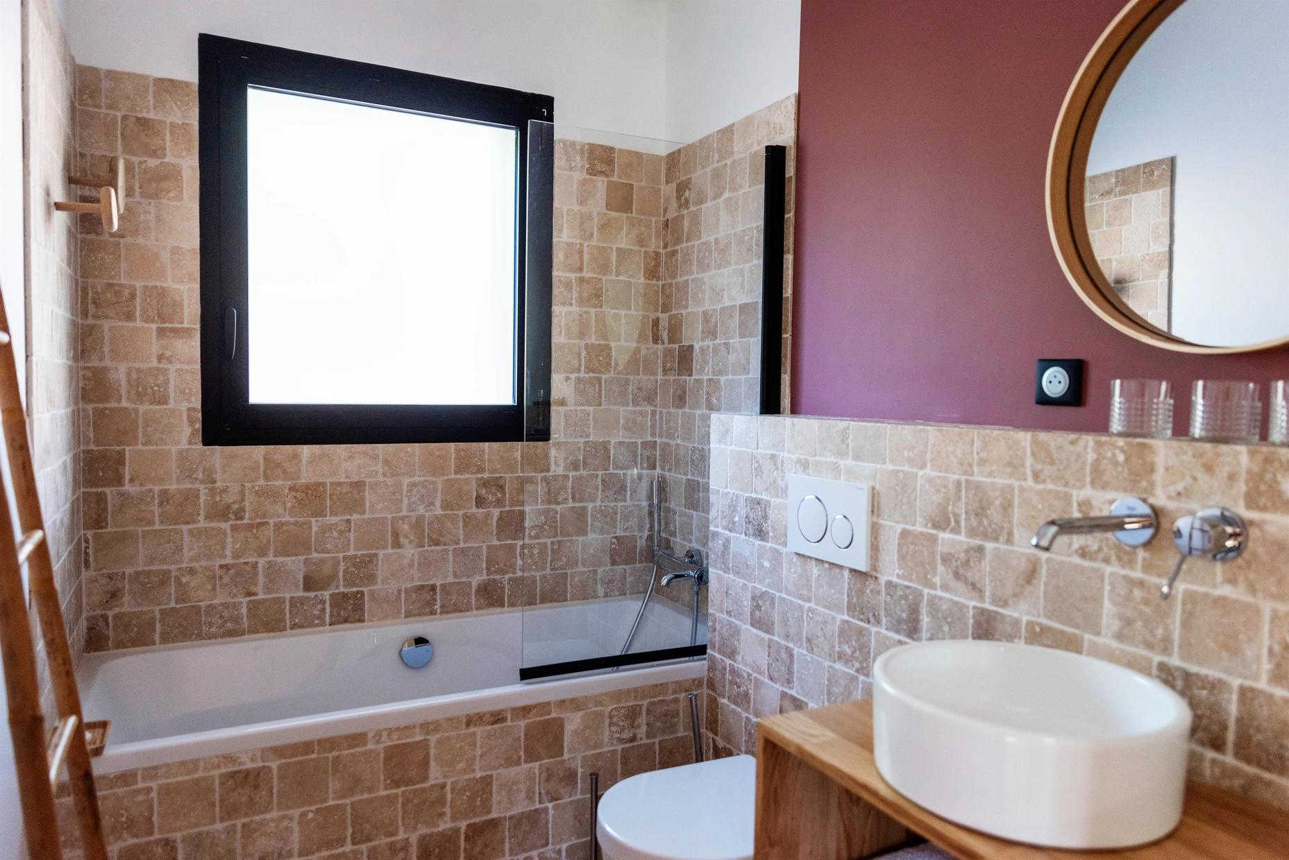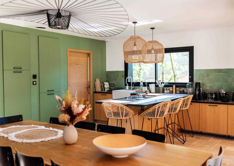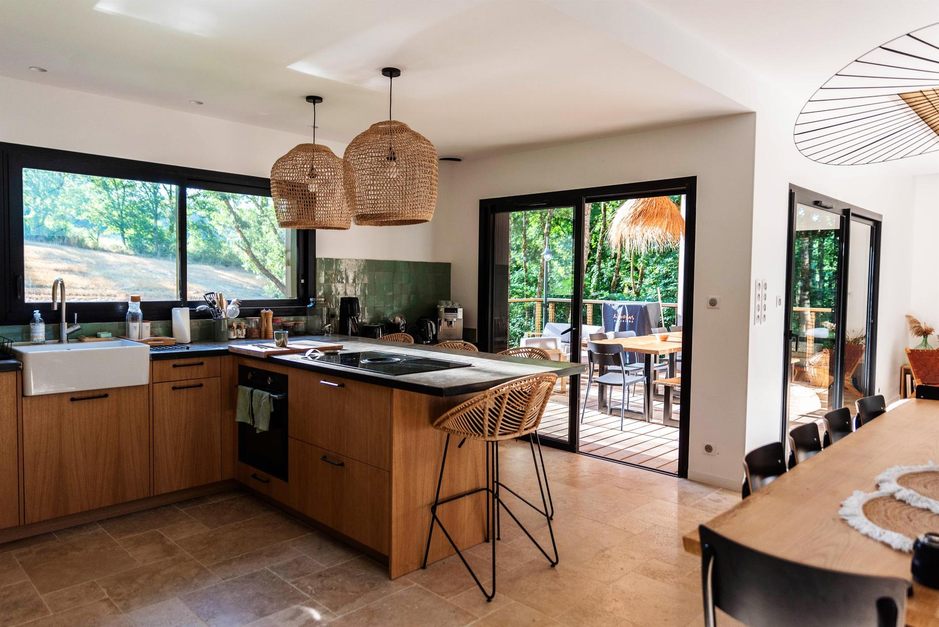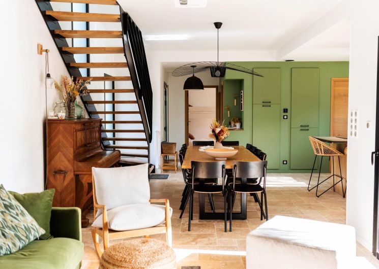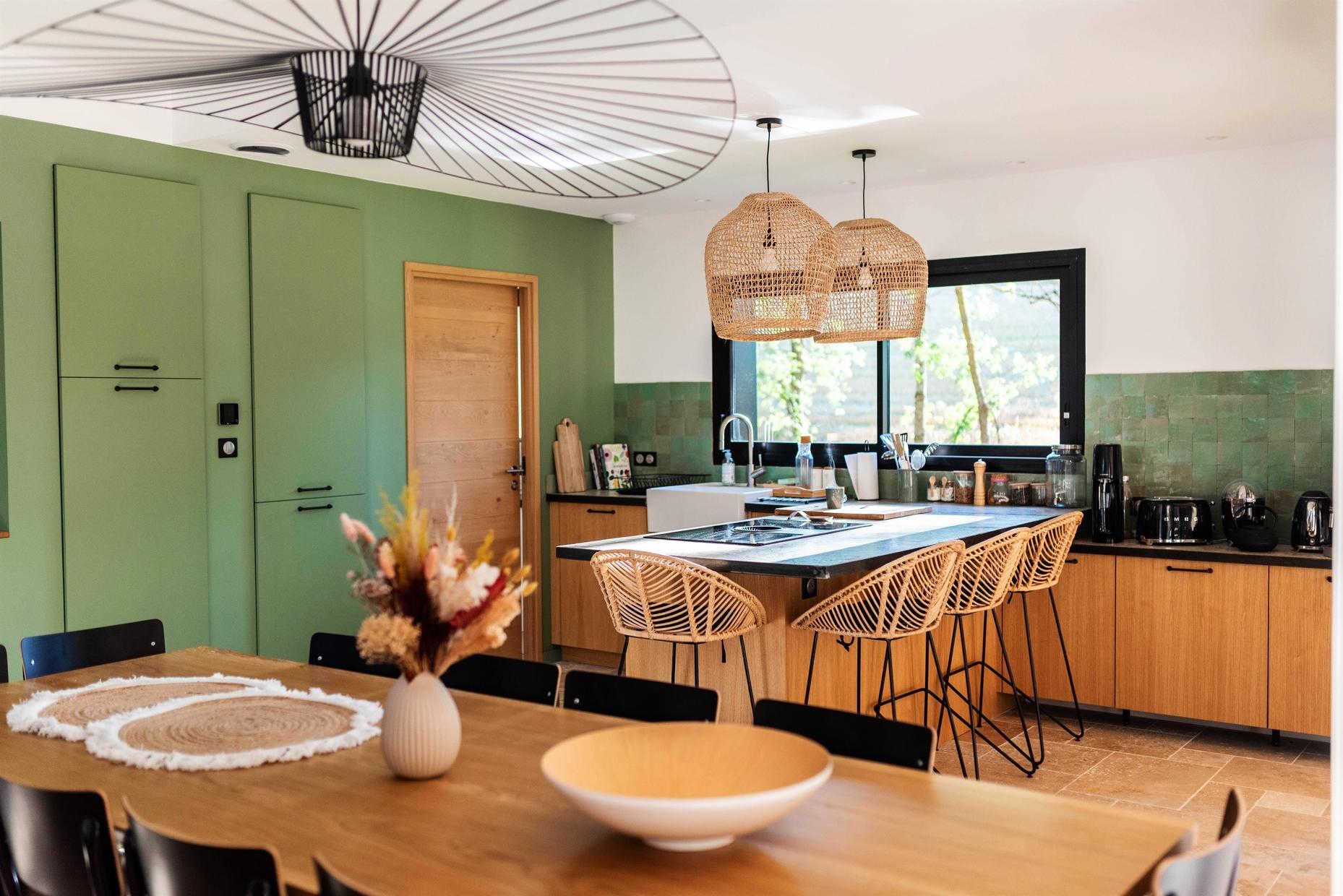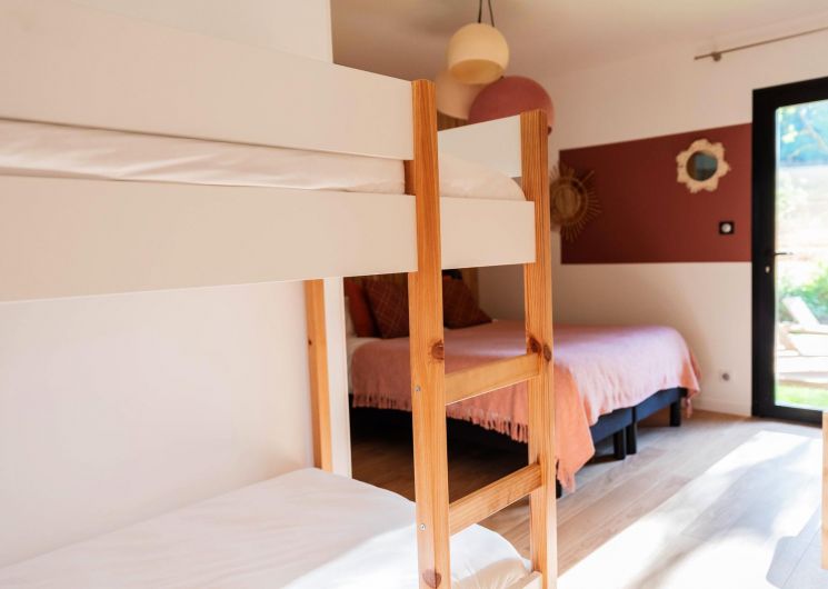 Planta baja: amplio salón con cocina equipada y lavadero, lavadero, sala de estar con estufa de leña, piano, pantalla gigante y equipo de sonido. Una habitación familiar (1 cama doble o 2 camas individuales + 2 literas), cuarto de baño privado con bañera y WC, TV. Vistas a la piscina.