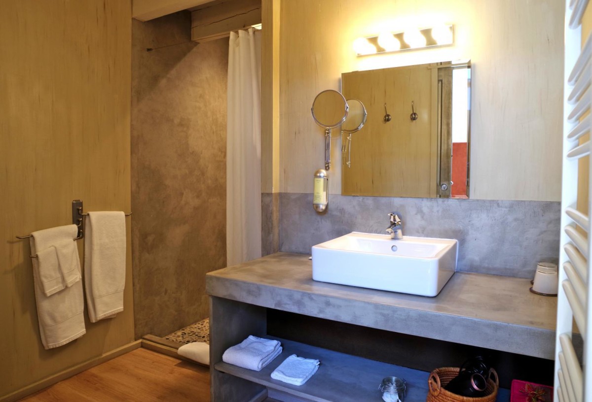 Podrá disfrutar de los desayunos al sol en la terraza o en la sala común los demás días. Las habitaciones pueden alojar de dos a cuatro personas (las camas se pueden separar) y disponemos de camas para niños menores de dos años. TV, WIFI con fibra, aire acondicionado en 4 de las habitaciones. En el lugar, nuestro restaurante que sirve productos locales frescos (Maître Restaurateur) le da la bienvenida por la noche de lunes a sábado. ATRACCIONES TURÍSTICAS: Voie verte Passa Païs, enoturismo (viñedos de Faugères y St-Chinian), Parc Naturel du Haut-Languedoc, Massif du Caroux, Gorges d’Héric (vía ferrata, barranquismo), Lac du Salagou (parapente), Chemin de Saint-Jacques, Pézenas, Lodève (museo, festival), Viaducto de Millau (50 km). – Luminosa e independiente, la habitación Terre de pouzolle (climatizada) puede acoger hasta 4 personas. De 31 m², cuenta con una cama de 180×200 (separable) y otra de 90×200, colchones Bultex y sábanas y fundas nórdicas de puro algodón. Con acceso directo a la terraza, podrá disfrutar de la vista de las estribaciones durante todo el año. El cuarto de baño dispone de ducha a ras de suelo, WC separado, lavabo, jabón y champú sin parabenos y toallas de algodón 100% peinado. Las instalaciones se completan con un secador de pelo.