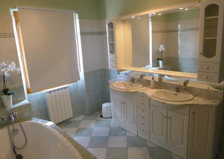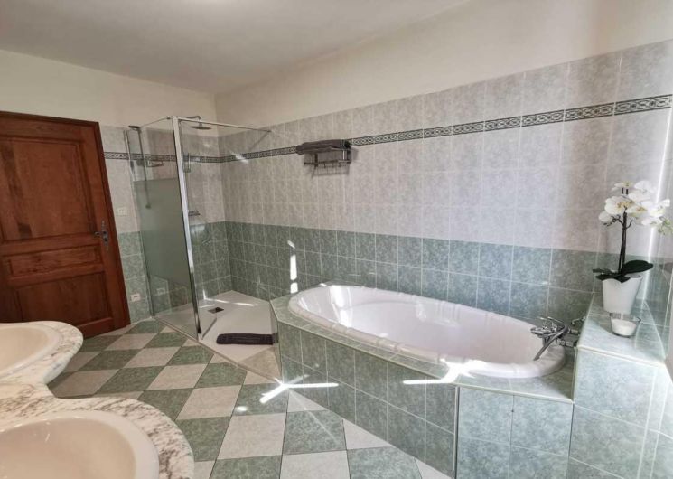 – Une salle de bain commune avec douche à l’italienne et baignoire,