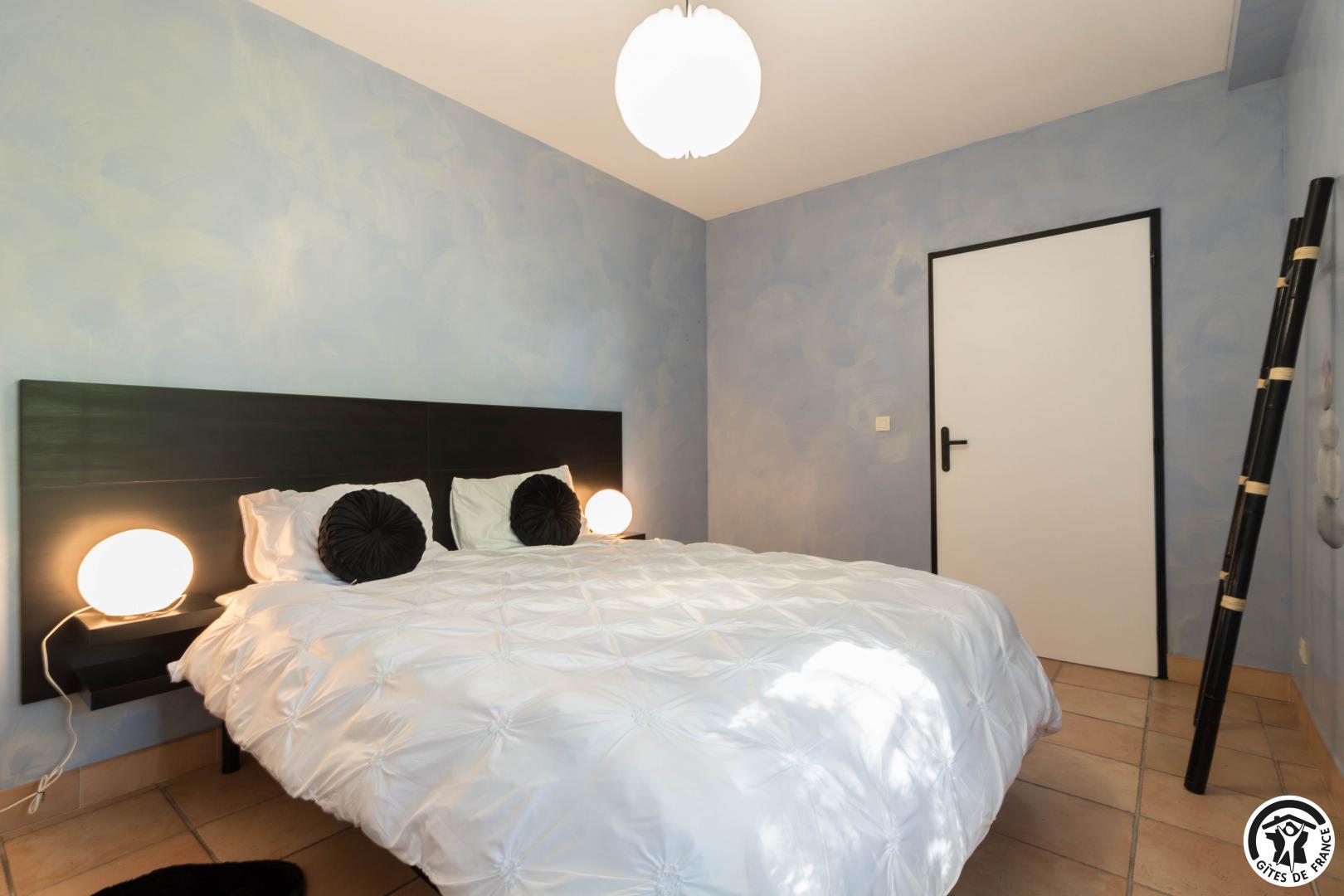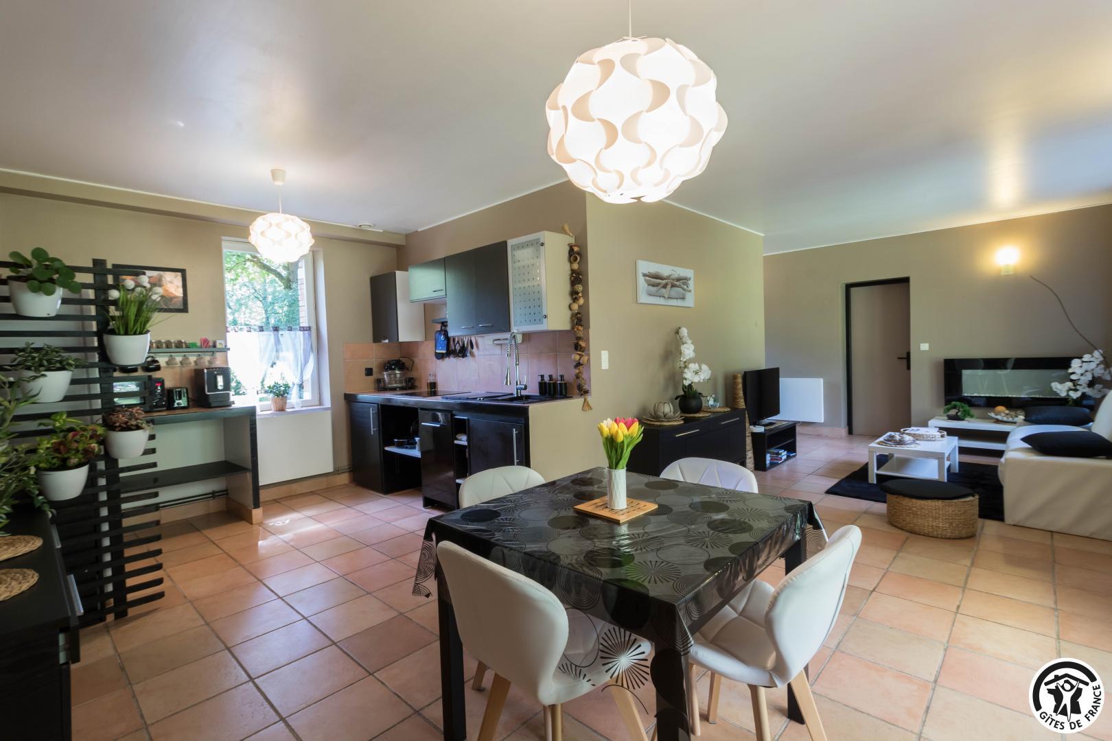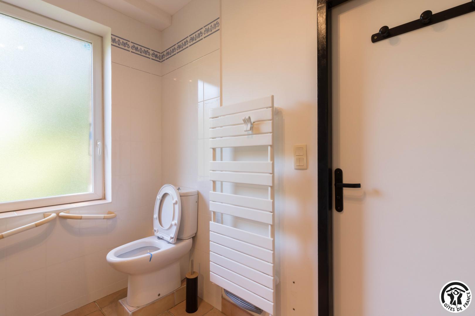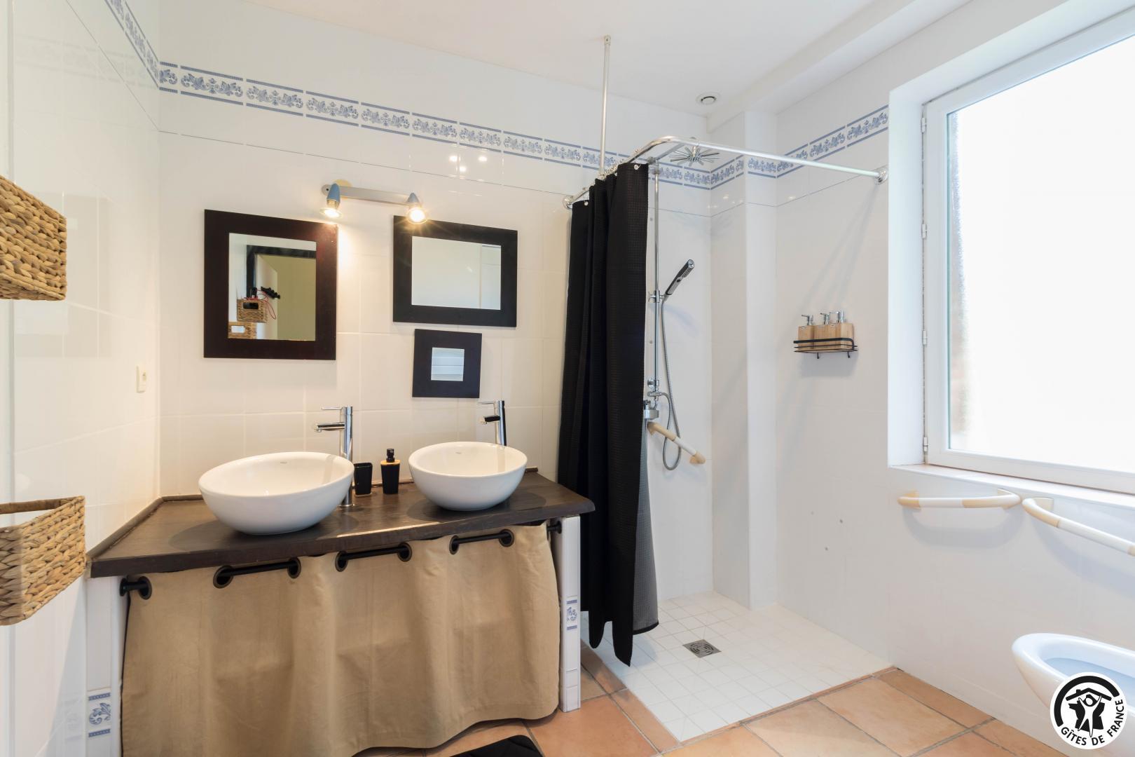 Alojamiento en una sola planta: sala de estar (cocina equipada con horno ciclónico, robot de cocina, puré, batidora y picadora, comedor y sala de estar), 2 dormitorios (1 cama doble 140*190cm y un escritorio)(1 cama doble 160*200cm, accesible a PMR), cuarto de ducha (ducha, WC y silla PMR disponibles) y WC separado.
