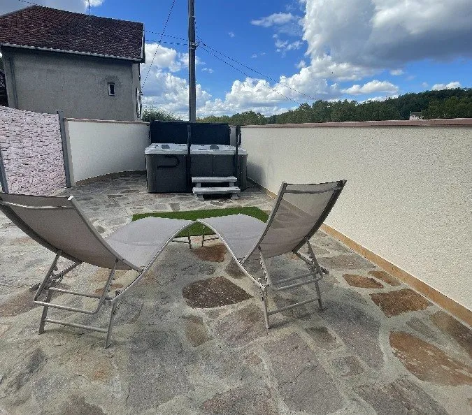 Casa rural situada en un chalet, muy soleado, cómodo y accesible por 5 pasos, con una terraza y un jacuzzi, un cobertizo y un aparcamiento para 3 vehículos. Está situado en un entorno tranquilo y abierto. Se compone de una cocina-salón con microondas, mini-horno, lavavajillas…, un dormitorio con cama de matrimonio, lavadora y un baño con ducha italiana; la calefacción es eléctrica. Acceso a Internet (limitado a 5GO). Tiendas, actividades deportivas, farmacia, autobús, casino, supermercado están cerca.