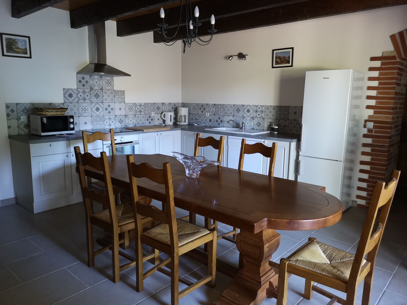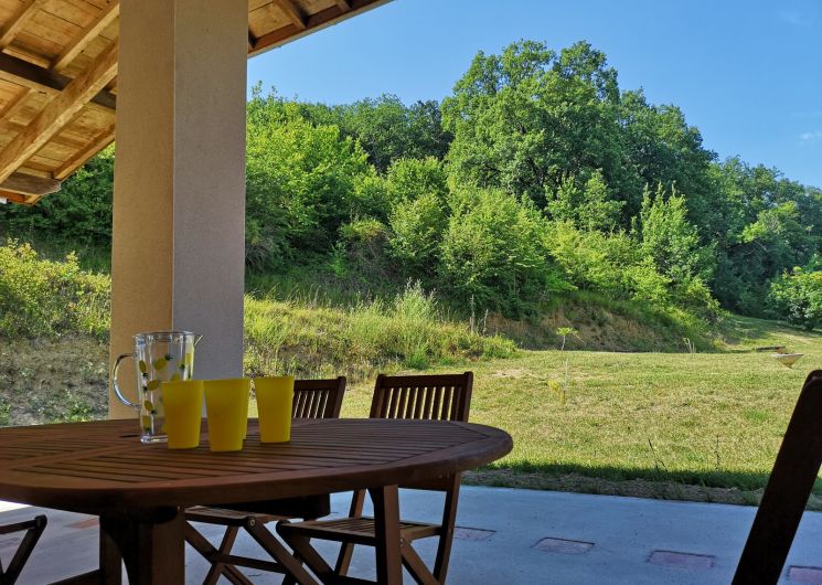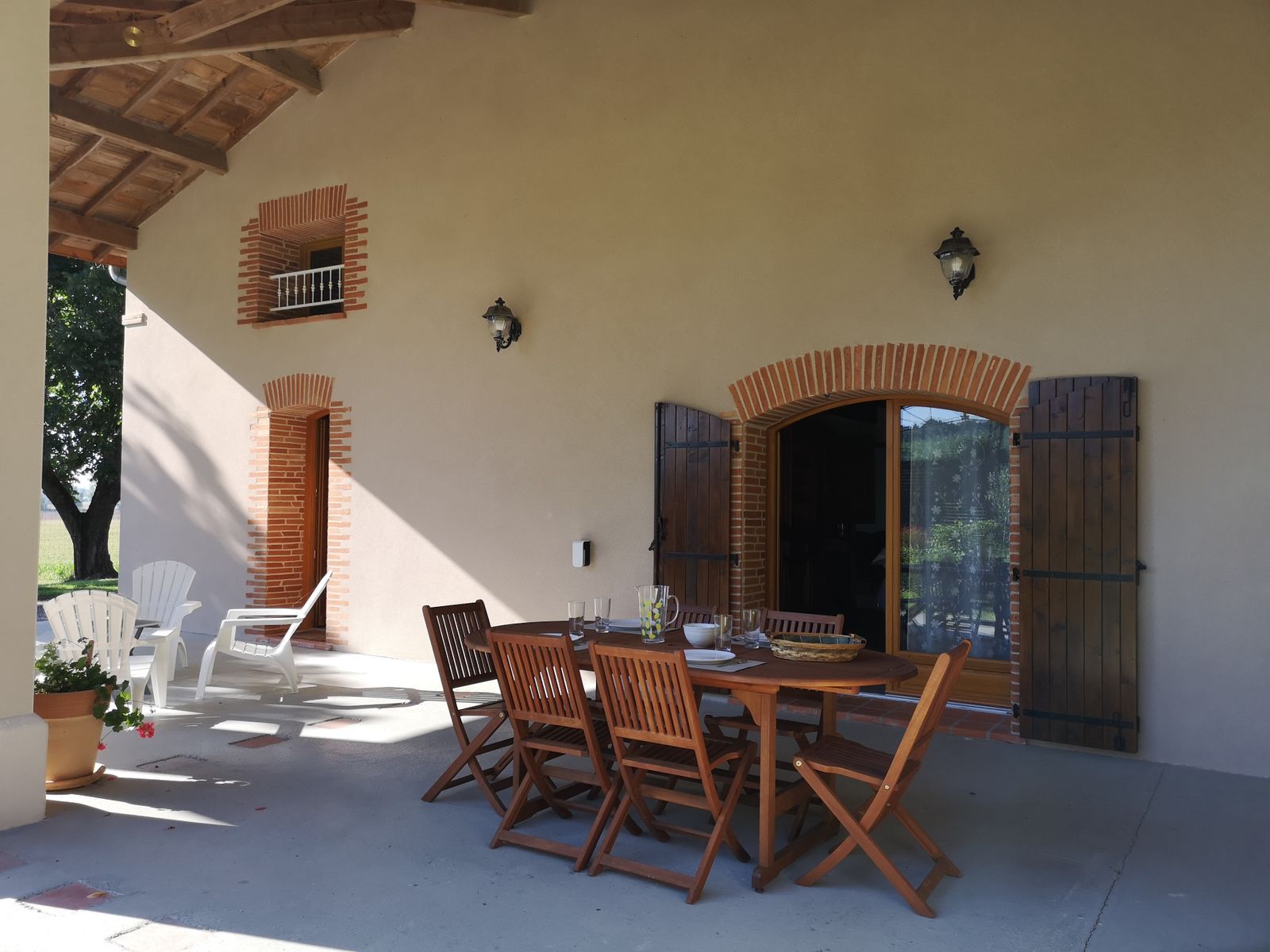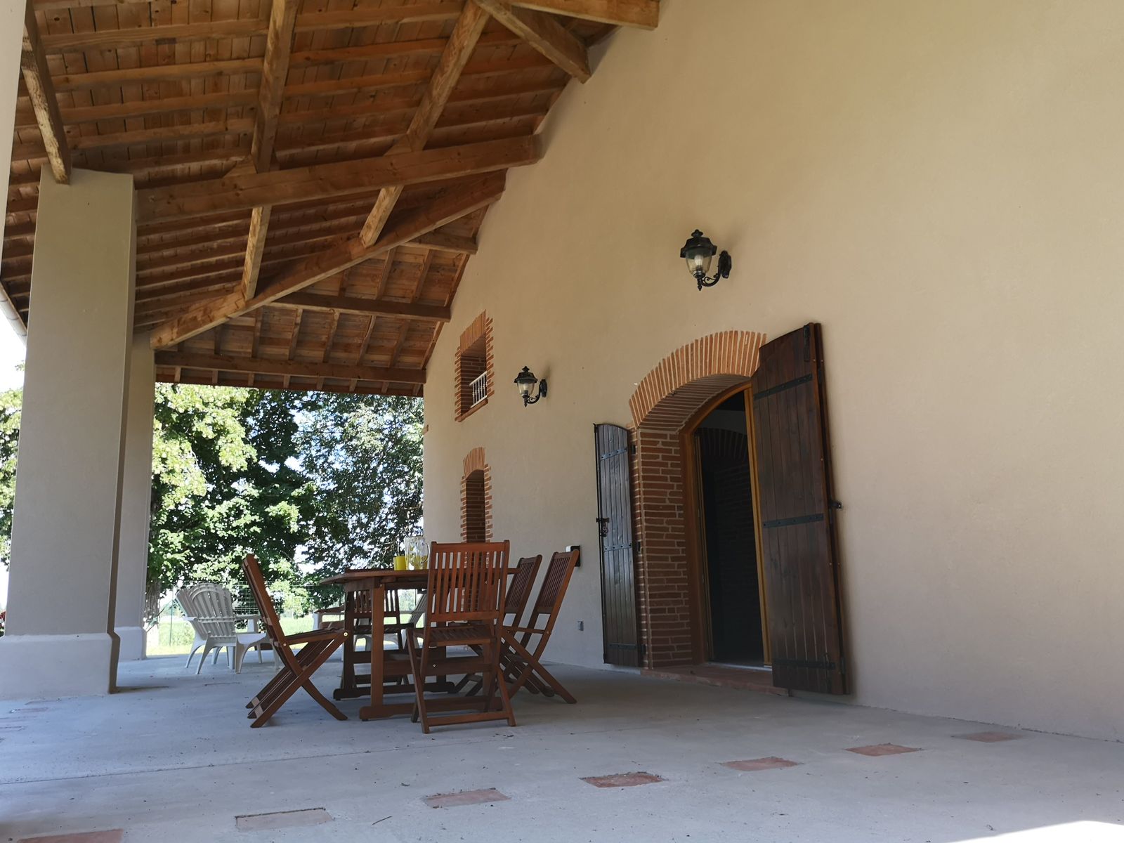La espaciosa cocina equipada se abre a una gran terraza privada cubierta con zona para tomar el sol, muebles de jardín de madera donde podrá disfrutar de una comida a la sombra.