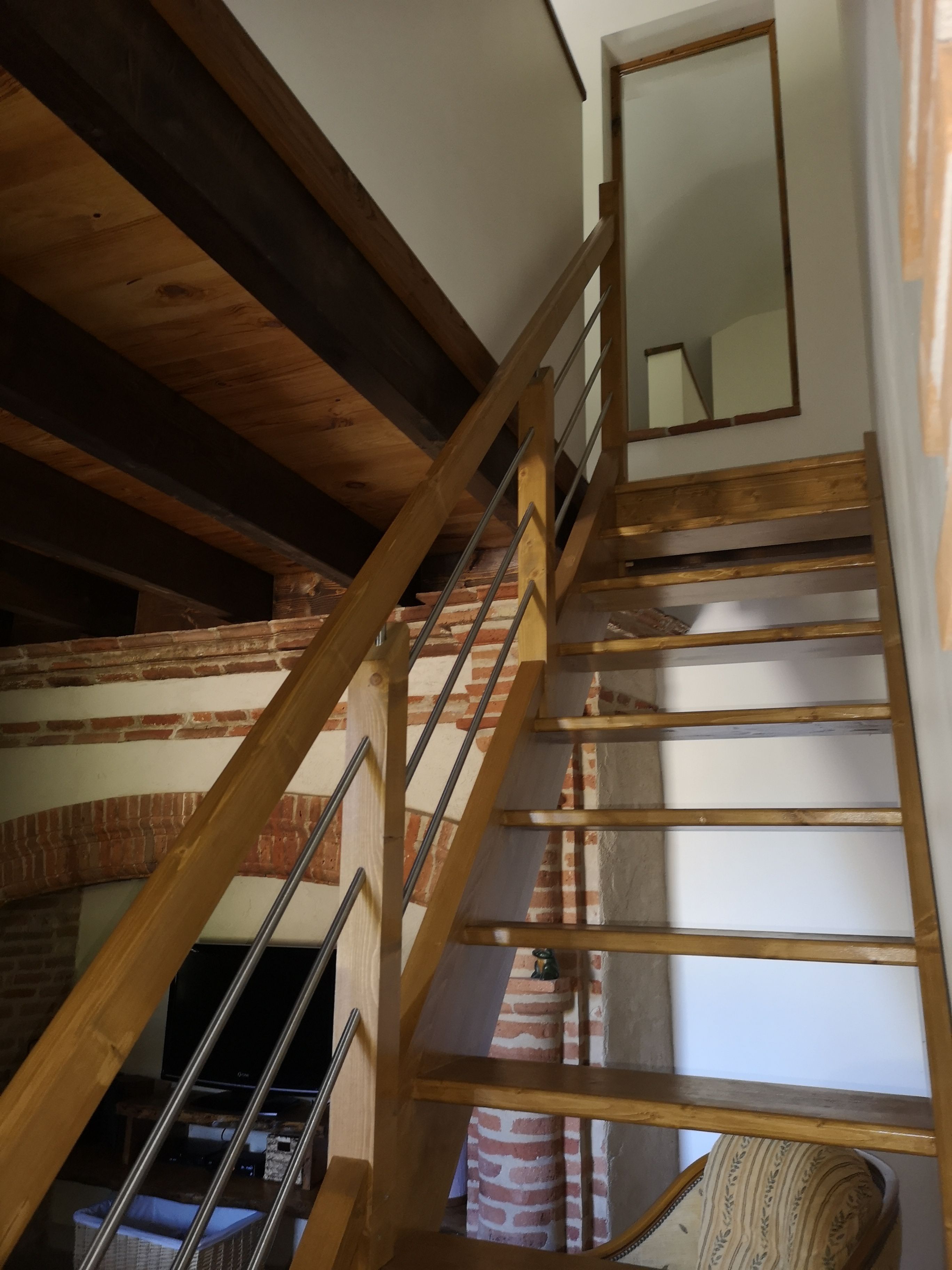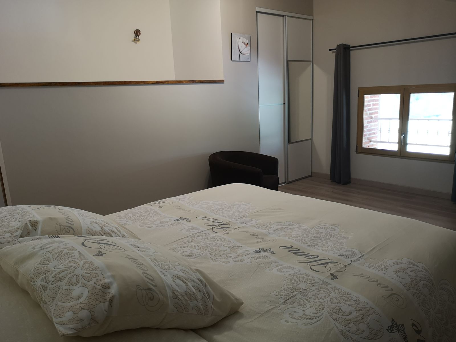 Arriba, un dormitorio abuhardillado con gran armario, cómoda y sillón permite admirar el campo y el bosque.