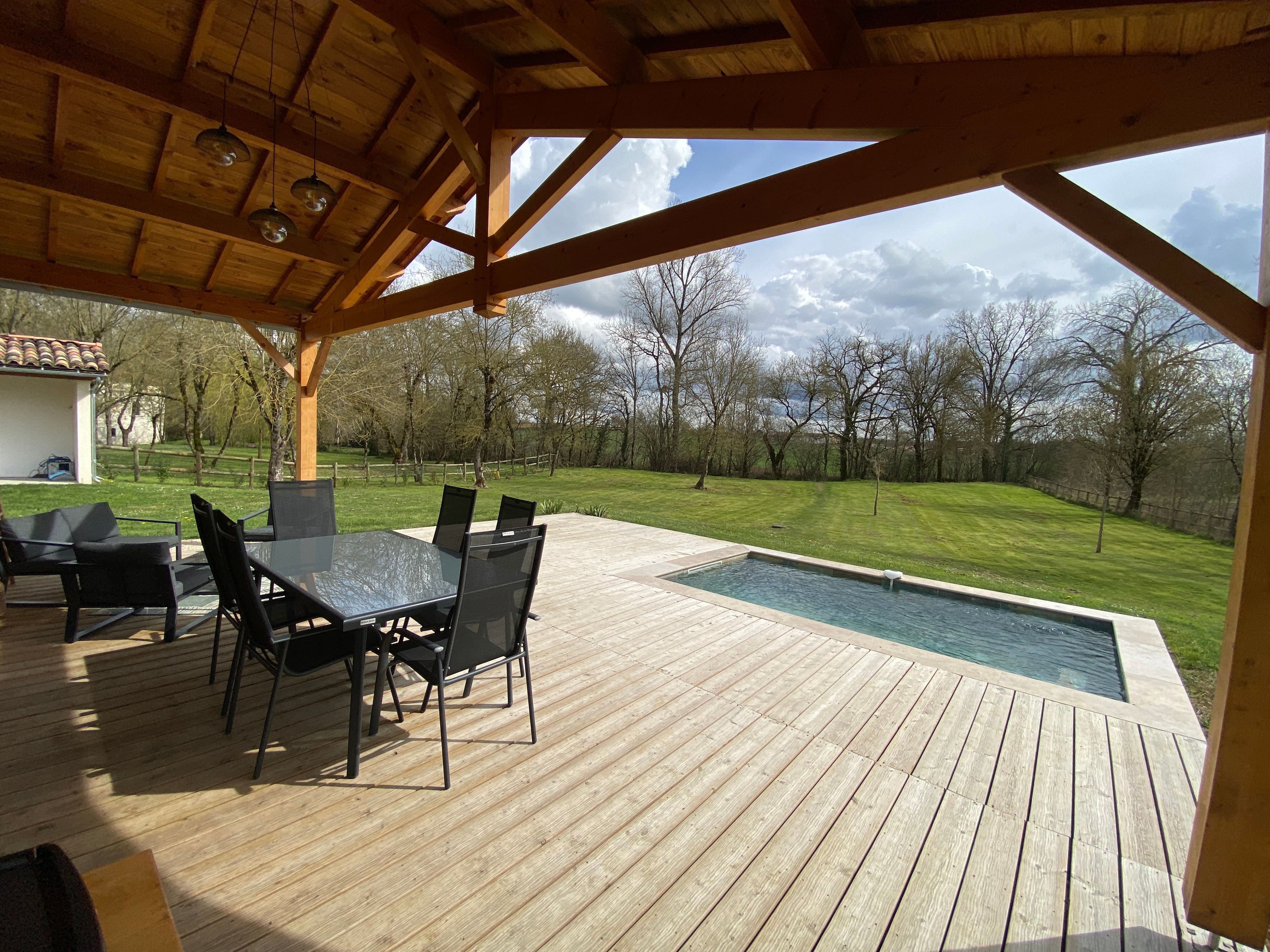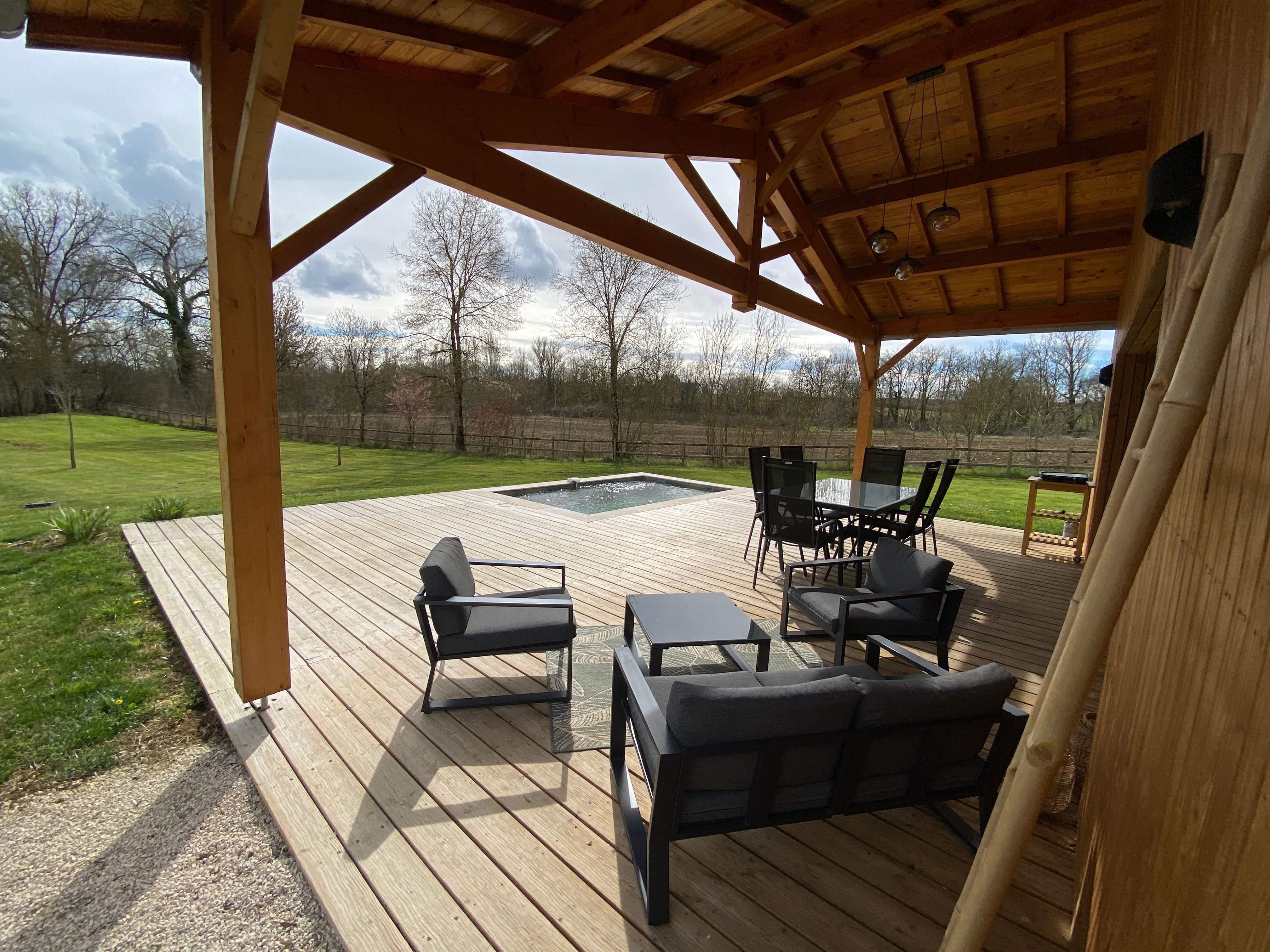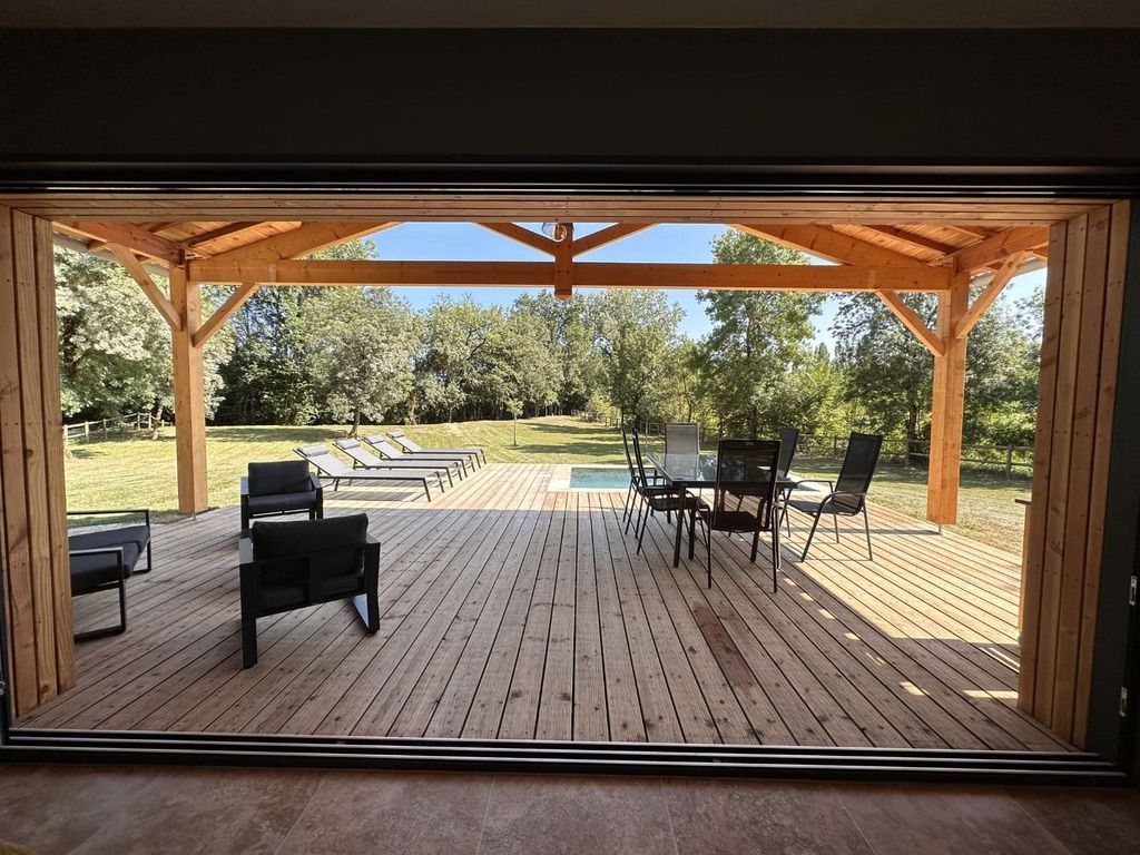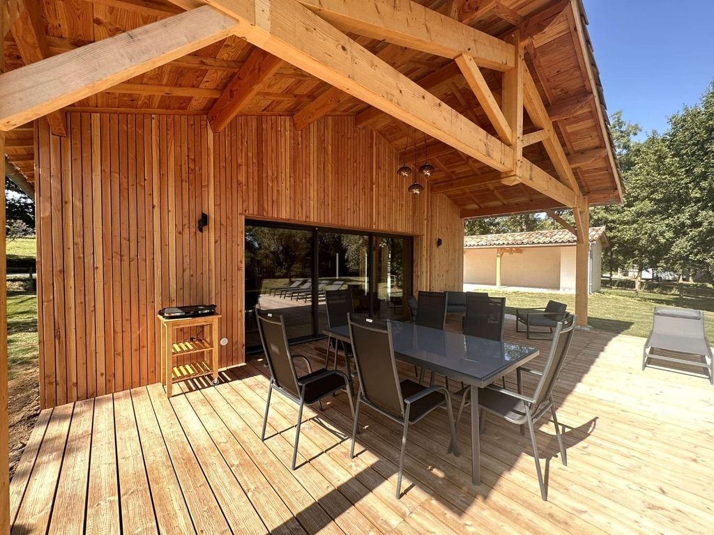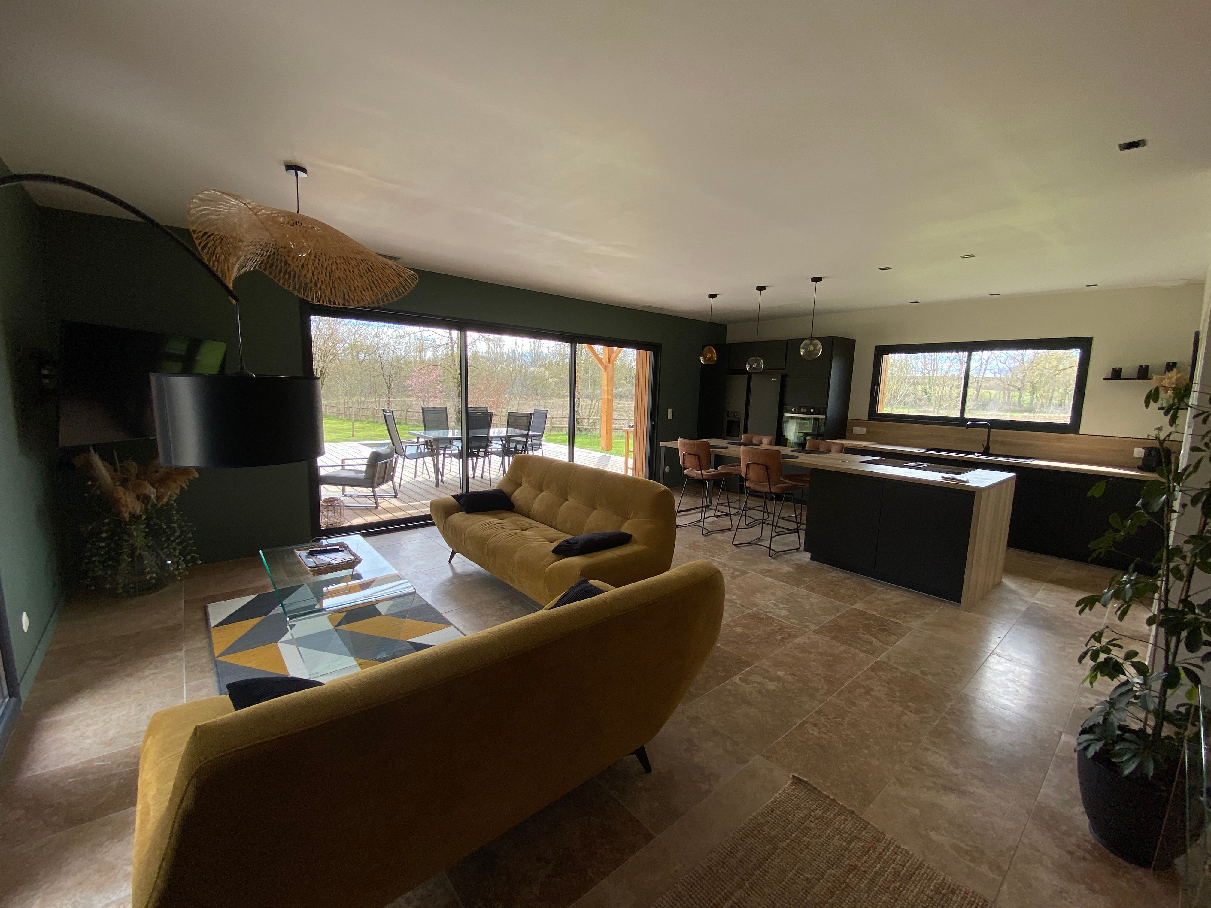 A few meters from a small stream winding the countryside “Candé”, then distanced by a pretty wooded meadow, discover this wooden house, with clean lines, revealing by its large bay with galandage an interior all in charm and elegance.