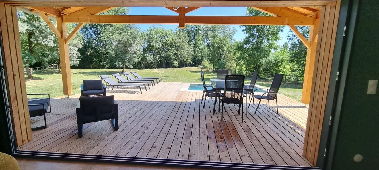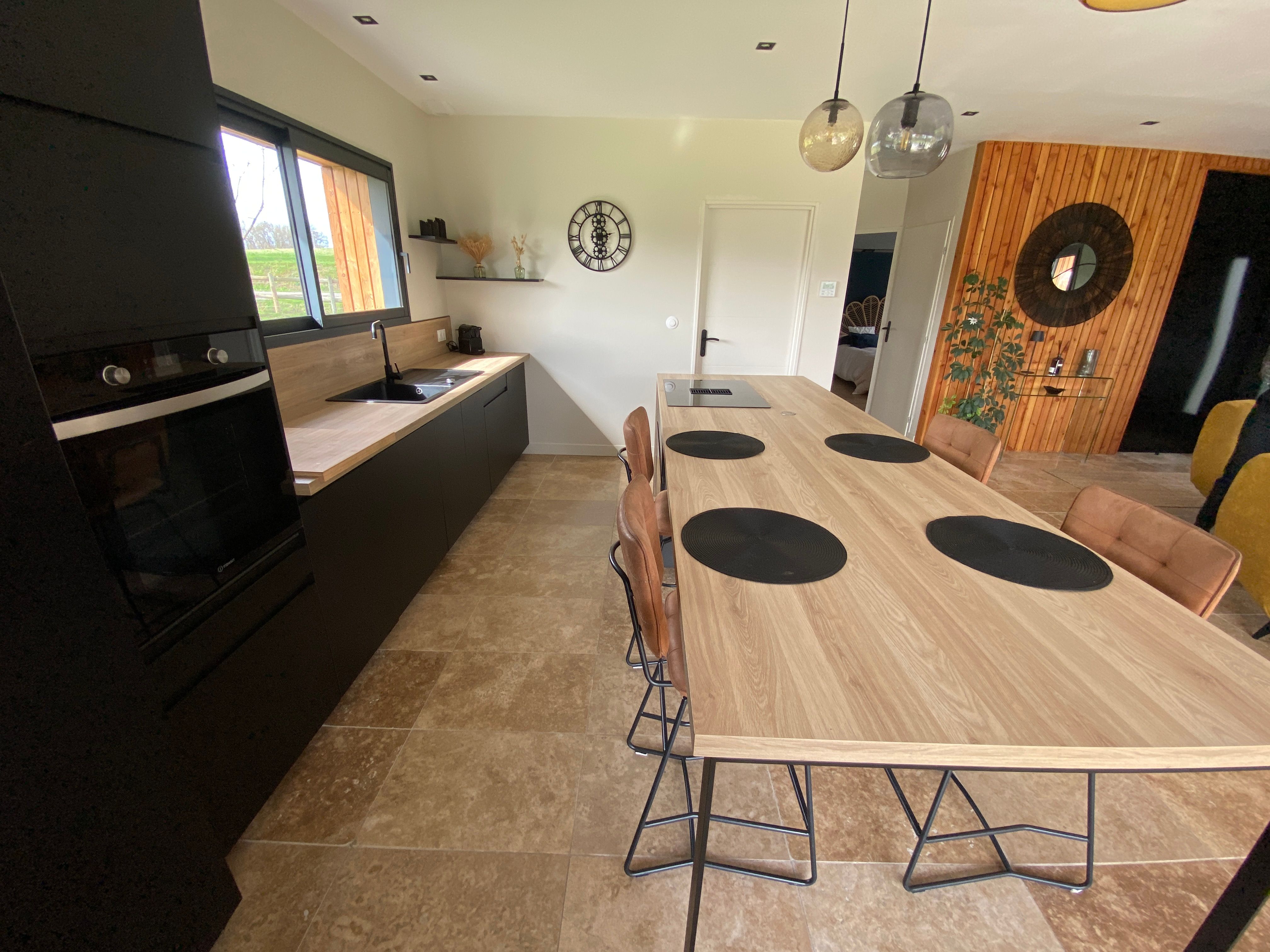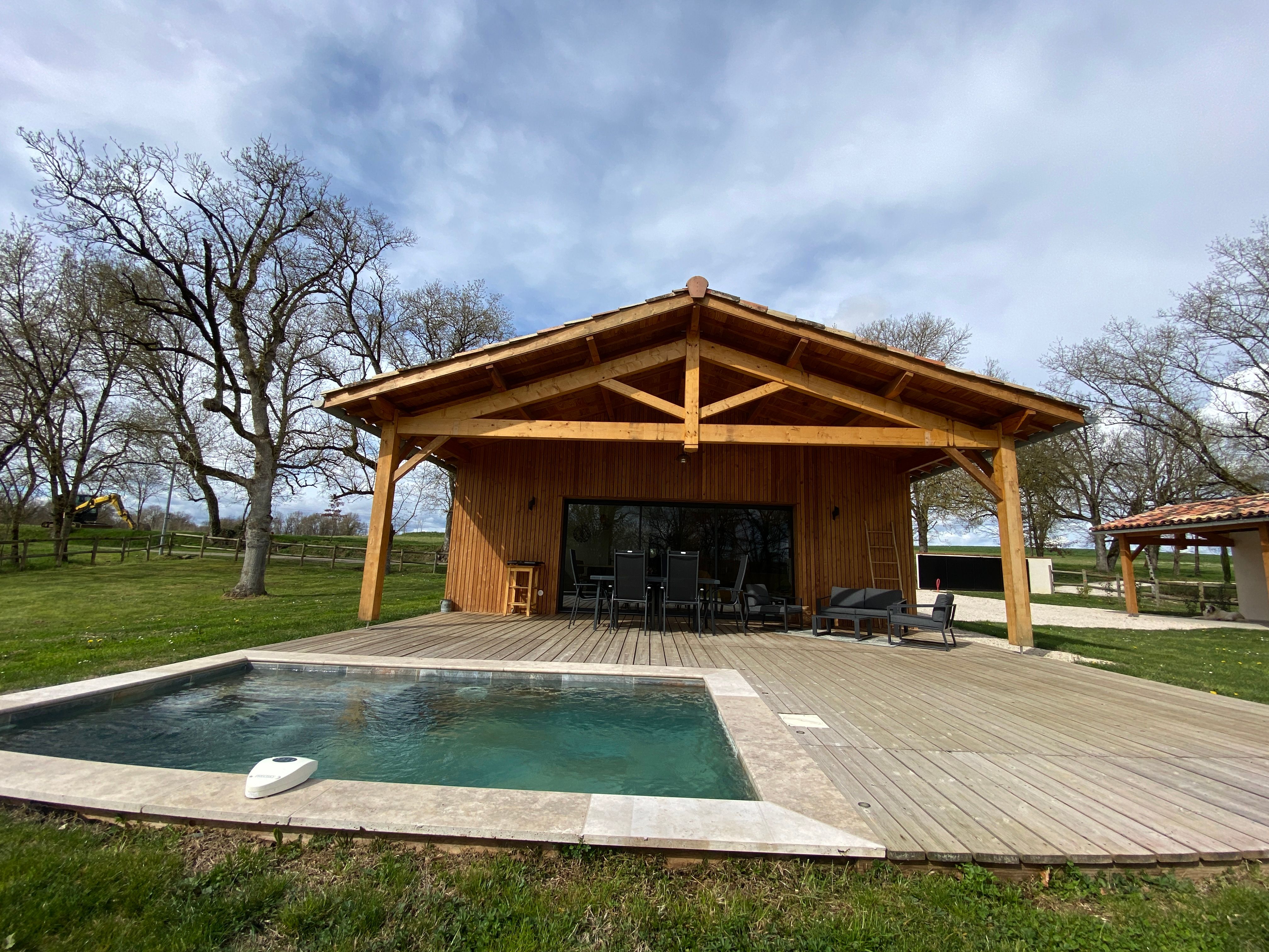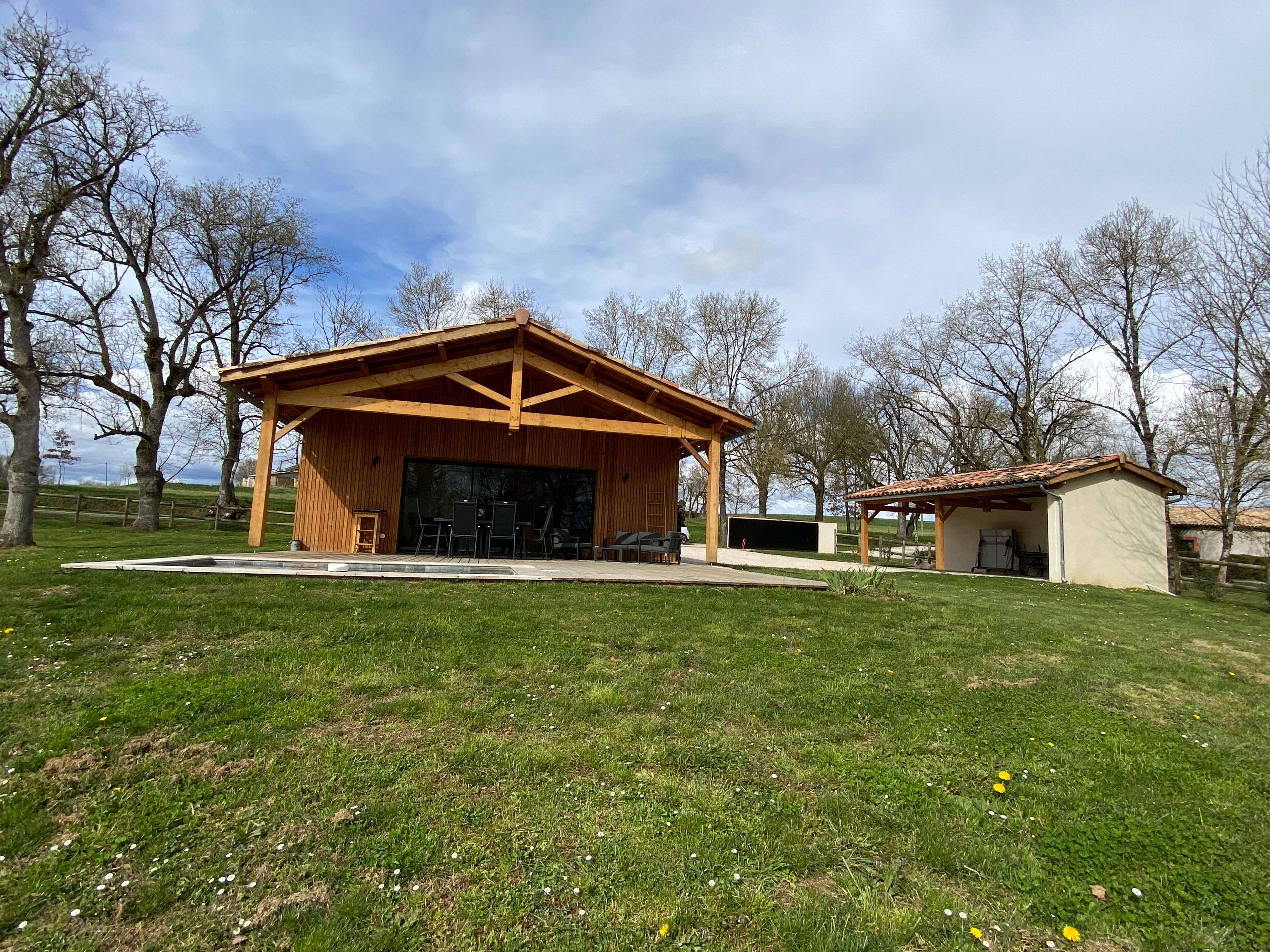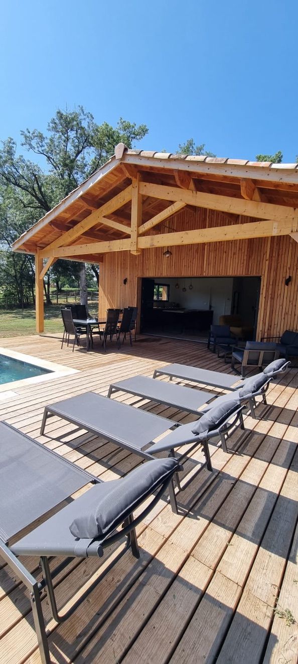 A few meters from a small stream winding the countryside “Candé”, then distanced by a pretty wooded meadow, discover this wooden house, with clean lines, revealing by its large bay with galandage an interior all in charm and elegance.
