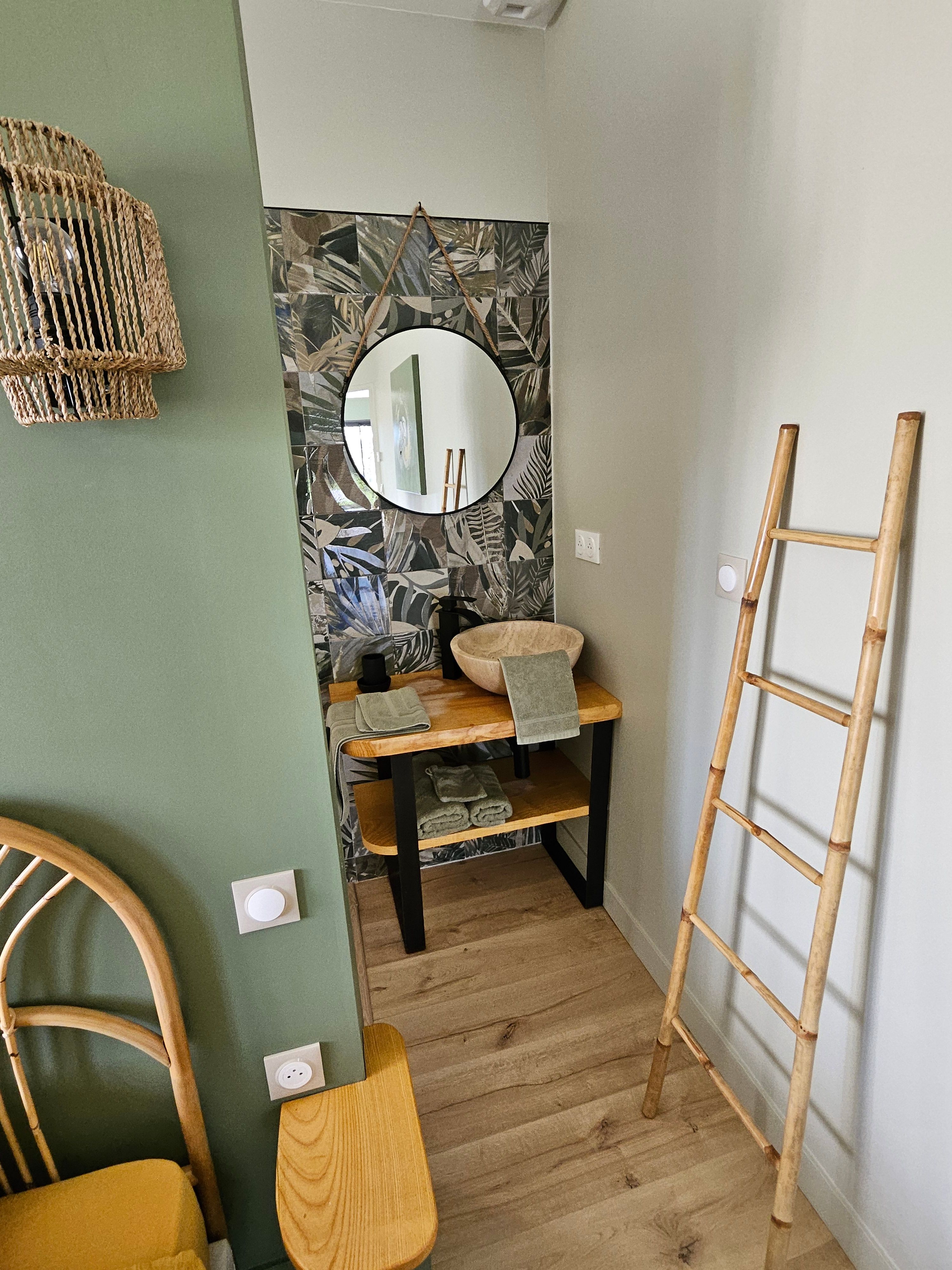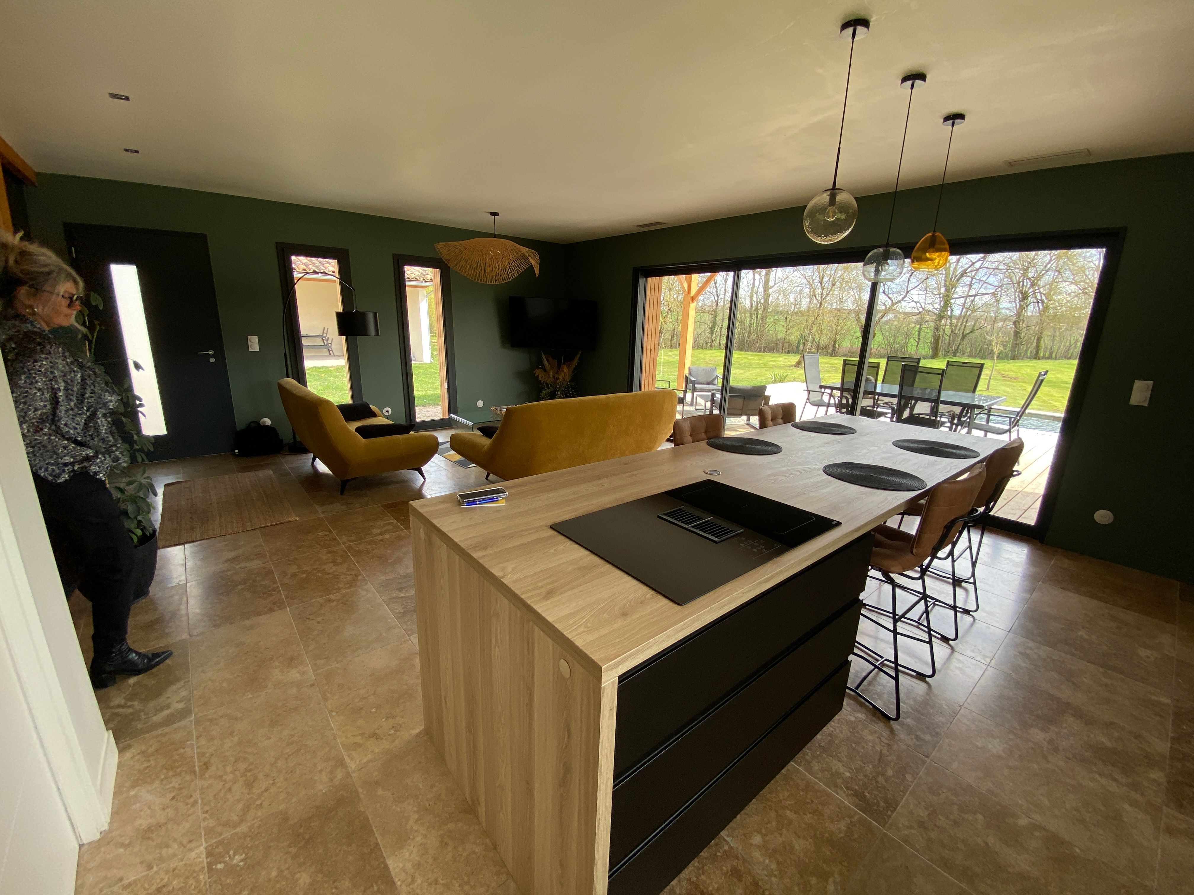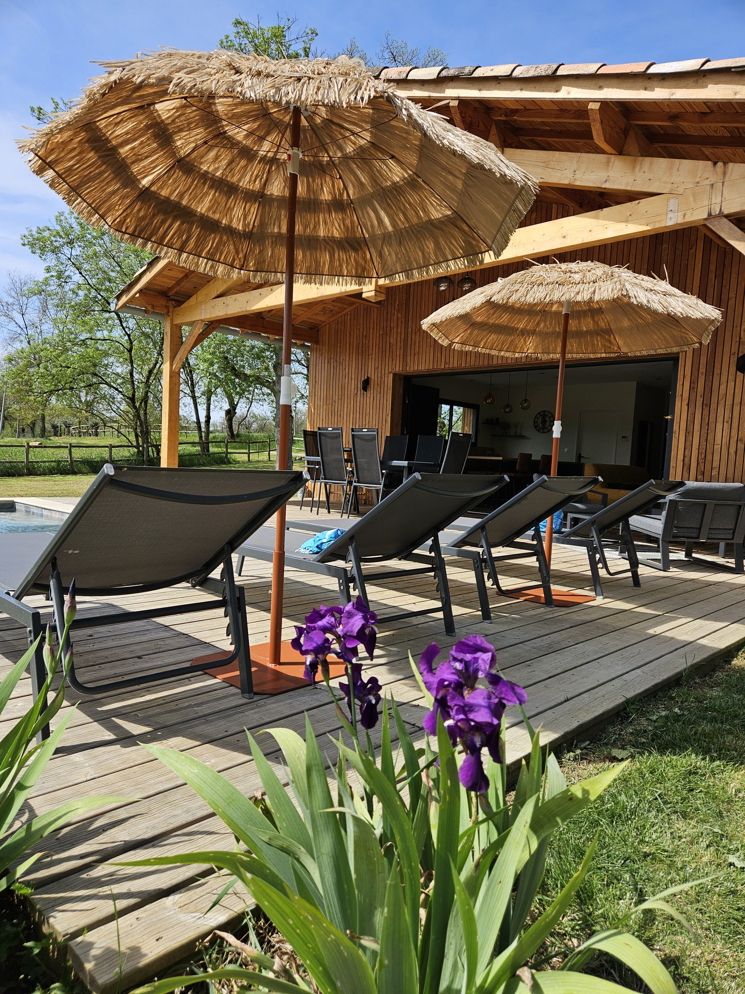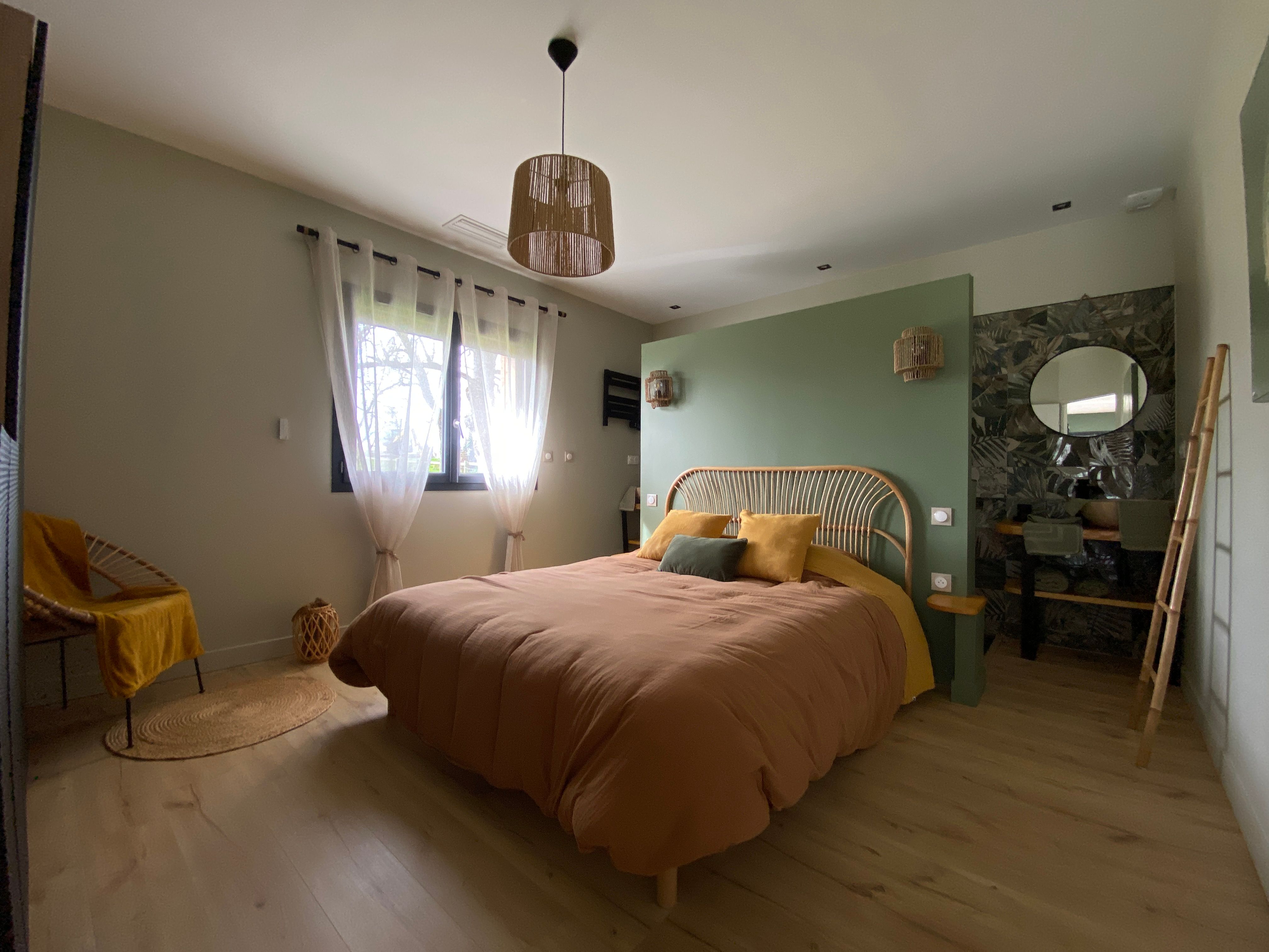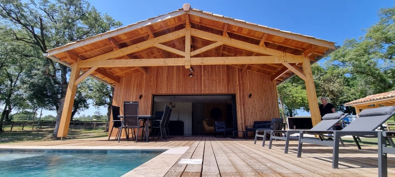 A few meters from a small stream winding the countryside “Candé”, then distanced by a pretty wooded meadow, discover this wooden house, with clean lines, revealing by its large bay with galandage an interior all in charm and elegance.