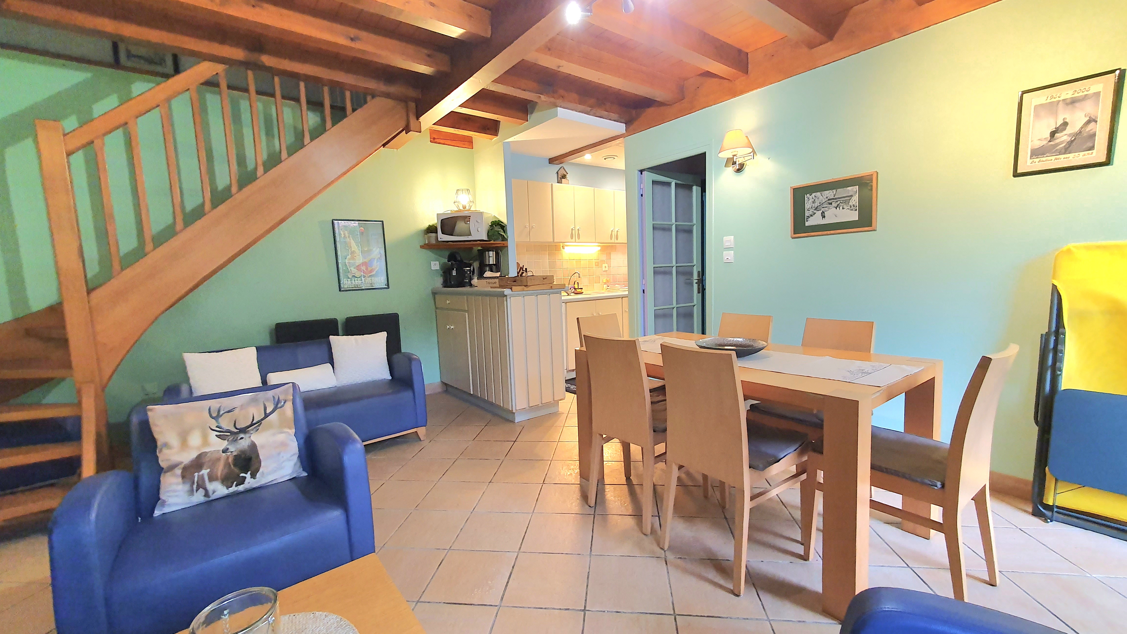 Planta baja: salón con zona de estar y TV frente a la chimenea, comedor y cocina americana, trastero, 1 dormitorio con 1 cama doble (140 cm), WC separado. Arriba: cuarto de ducha, 1 juego de muebles de jardín, barbacoa.
