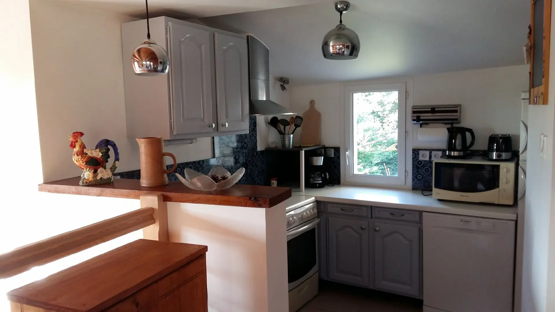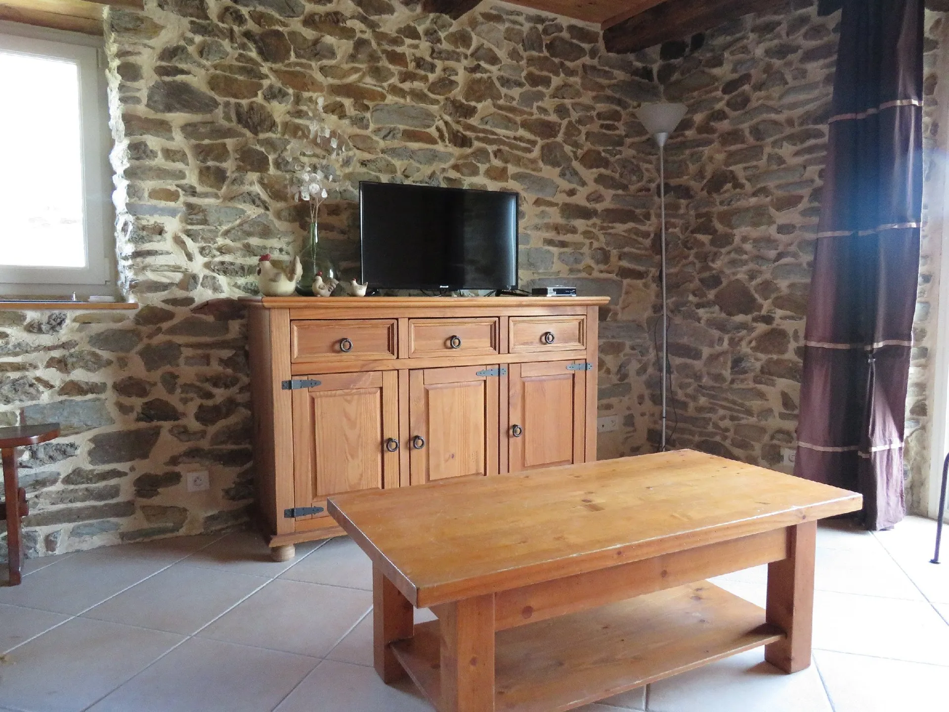 Rez-de-chaussée : salon – séjour (poêle à bois) avec un petit balcon exposé ouest et superbe vue sur la vallée de la Coussane ; petite cuisine équipée (gazinière, réfrigérateur avec partie congélateur, lave-vaisselle) ; WC.