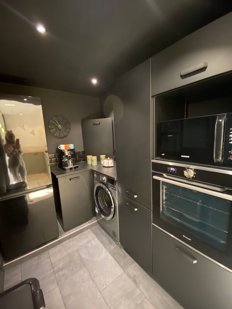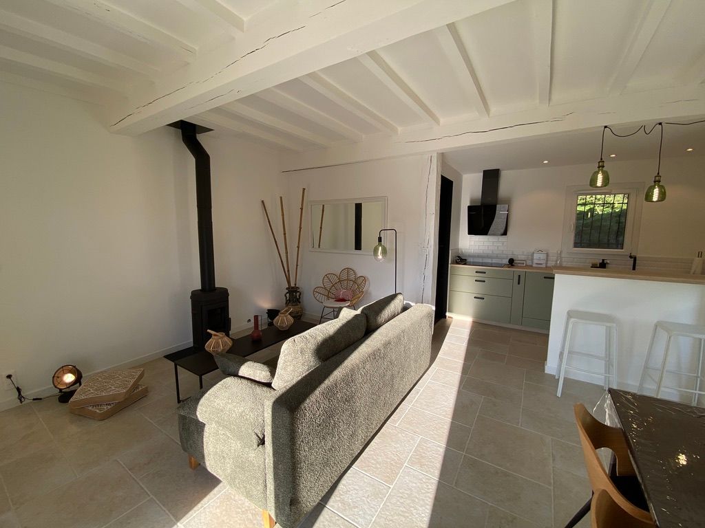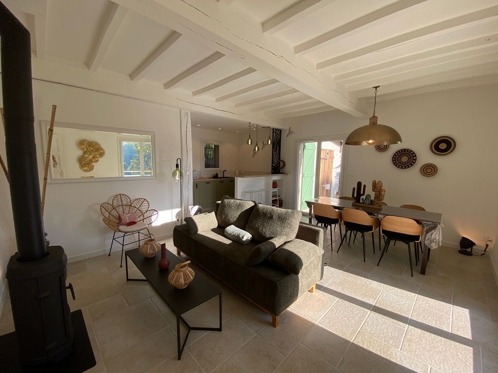 – a living room with lounge (sofa, coffee table, wood-burning stove (wood supplied included in the price), armchair, dining table with 6 chairs), fully-equipped open kitchen with bar and stools (integrated dishwasher, induction hob, extractor fan, food processors) and its technical area (oven, microwave, combined washing machine, tumble dryer, fridge, freezer),