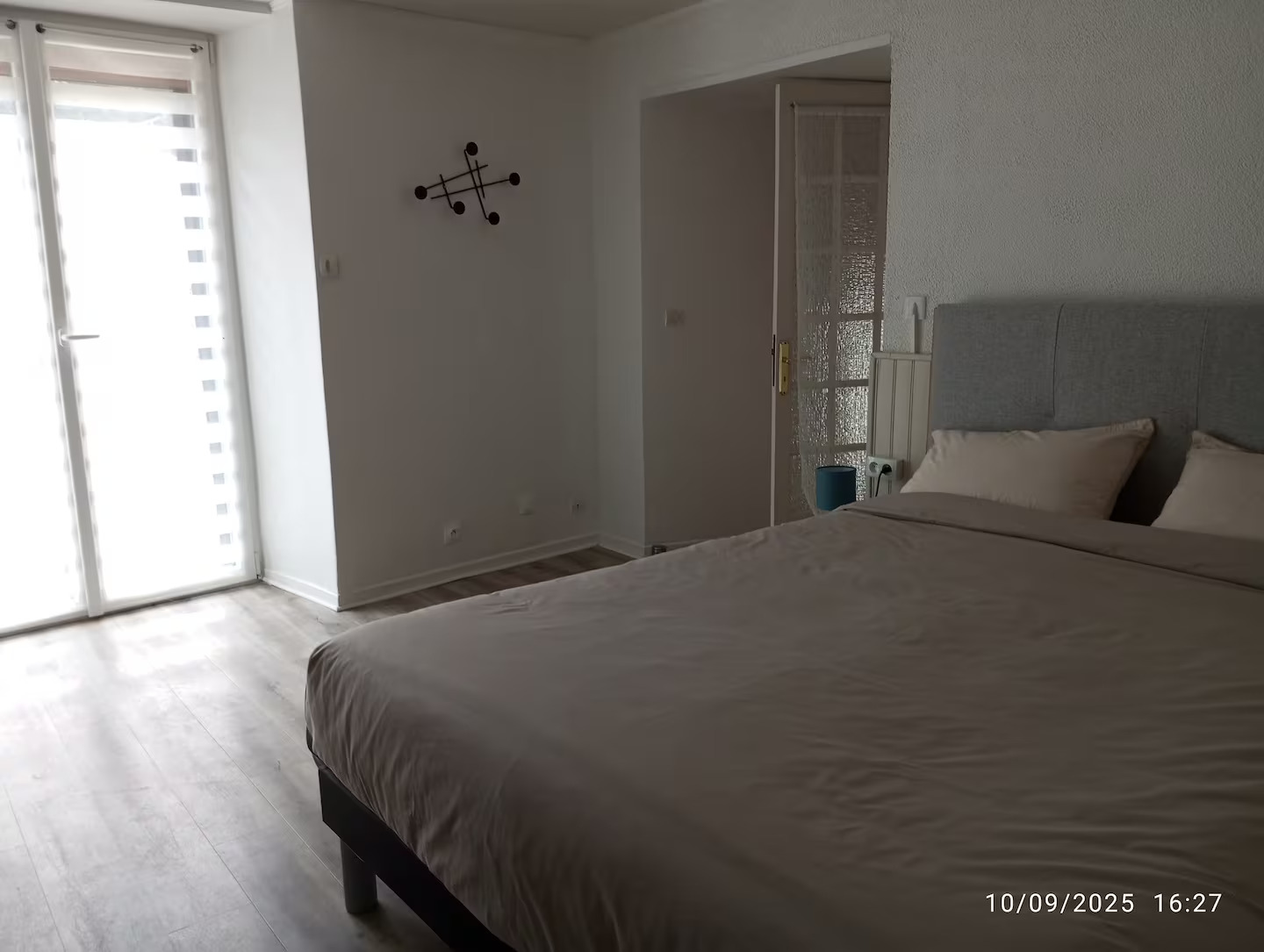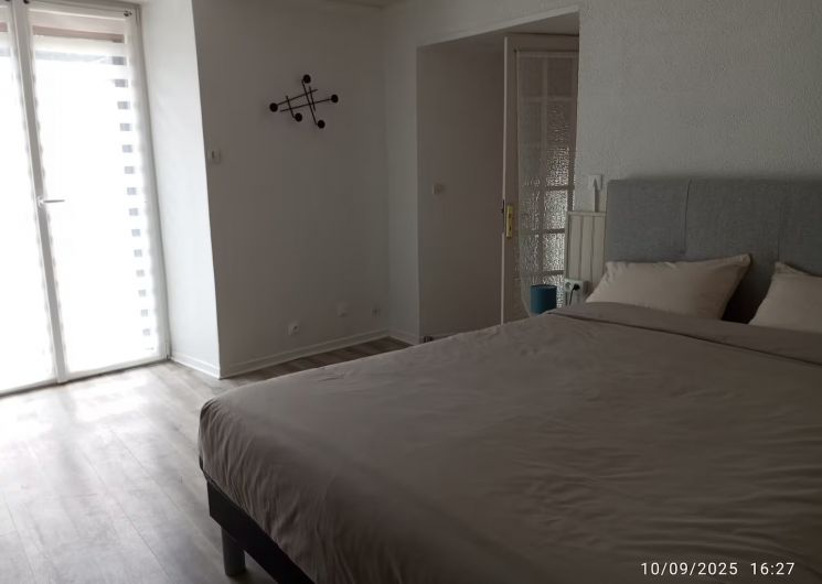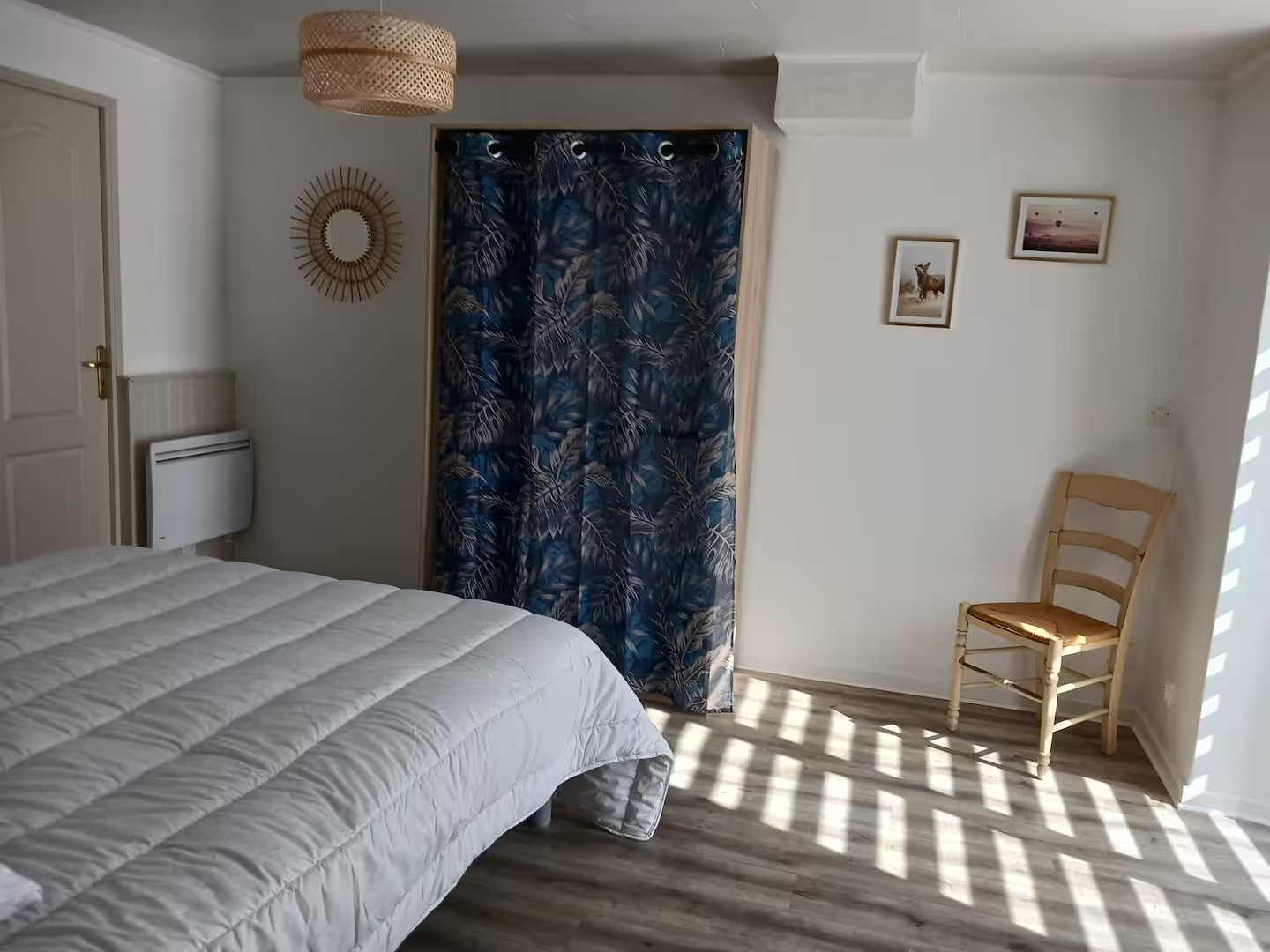 . un gran dormitorio con una cama de 160/200 y un edredón nórdico (240/260), 2 mesillas de noche y 2 lámparas de noche y una zona de almacenaje.