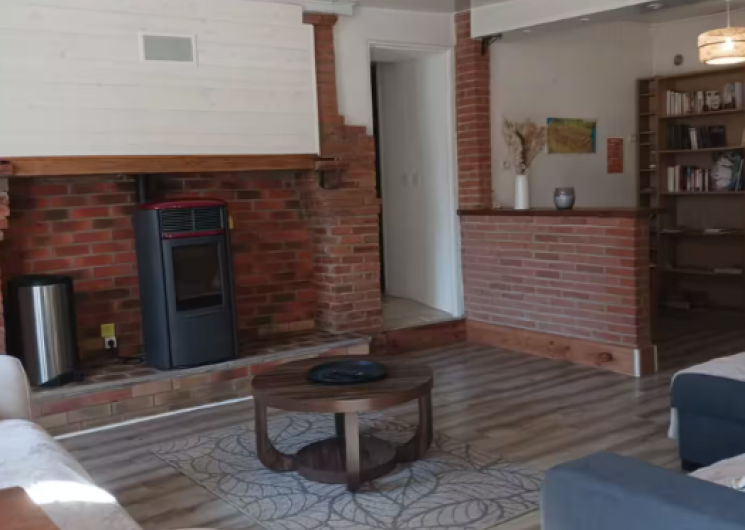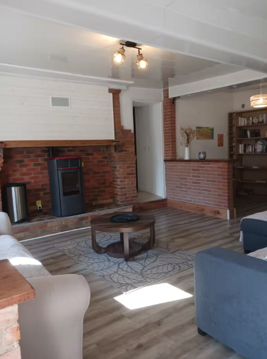 . Un gran salón con 2 sofás, un sillón, una mesa de centro, un televisor y una estufa de pellets. Proporcionamos pellets para su estancia.