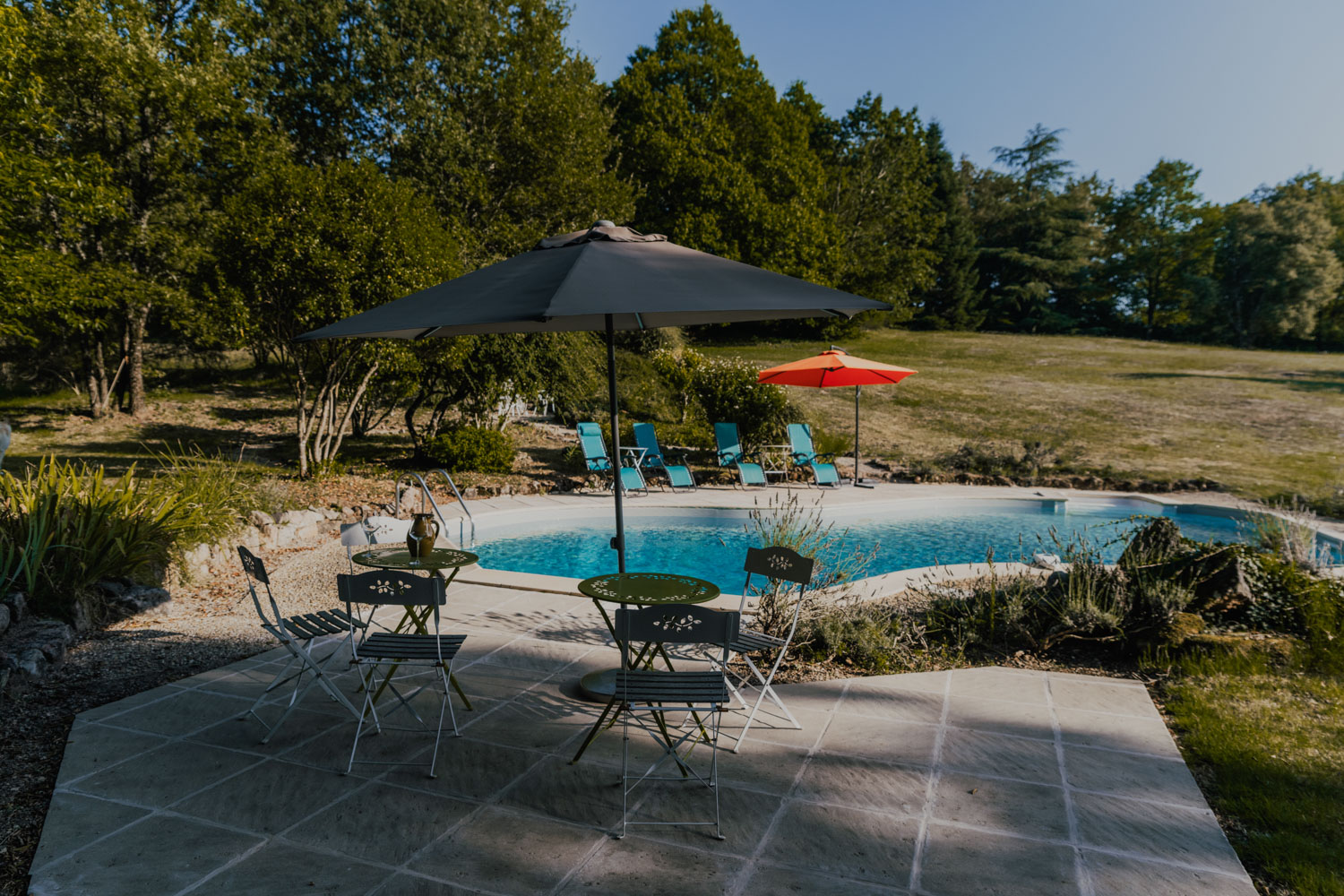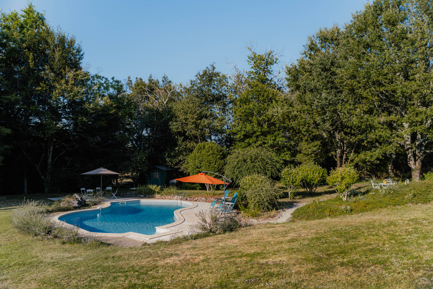 La piscine de 10m x6m est dotée d’un petit et d’un grand bassin pour plonger. Plancha , parasols, chaises longues à disposition ,petit coin ombragé sous les chênes pour les repas à coté de la piscine.
