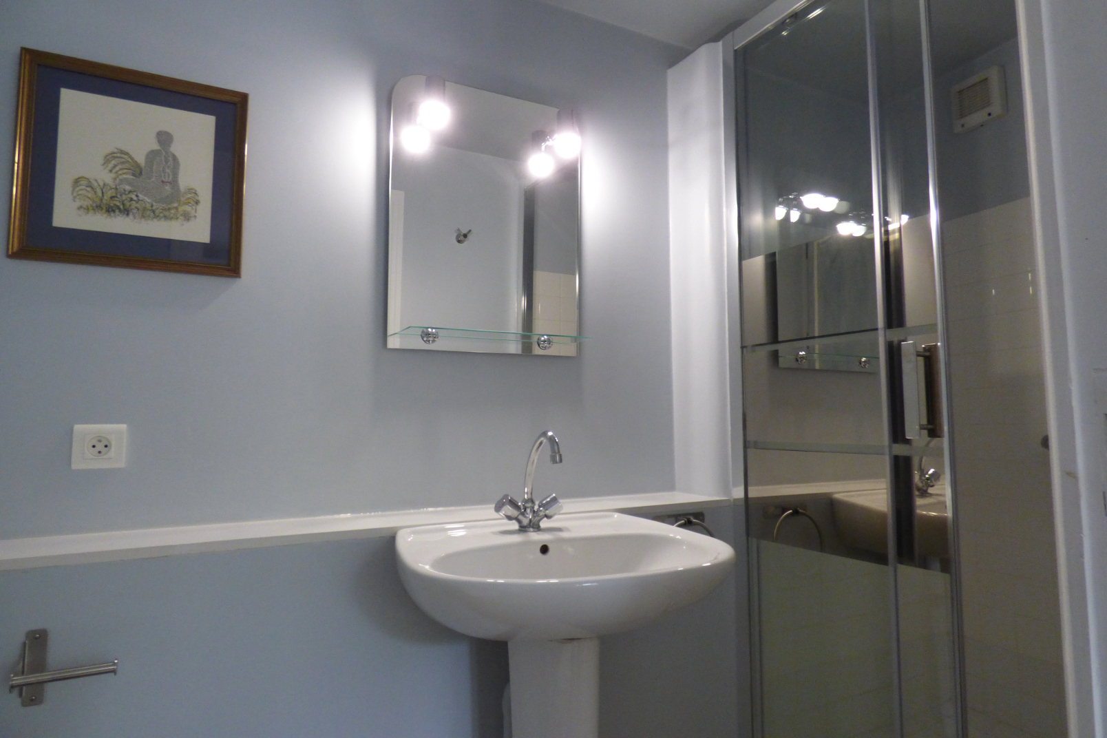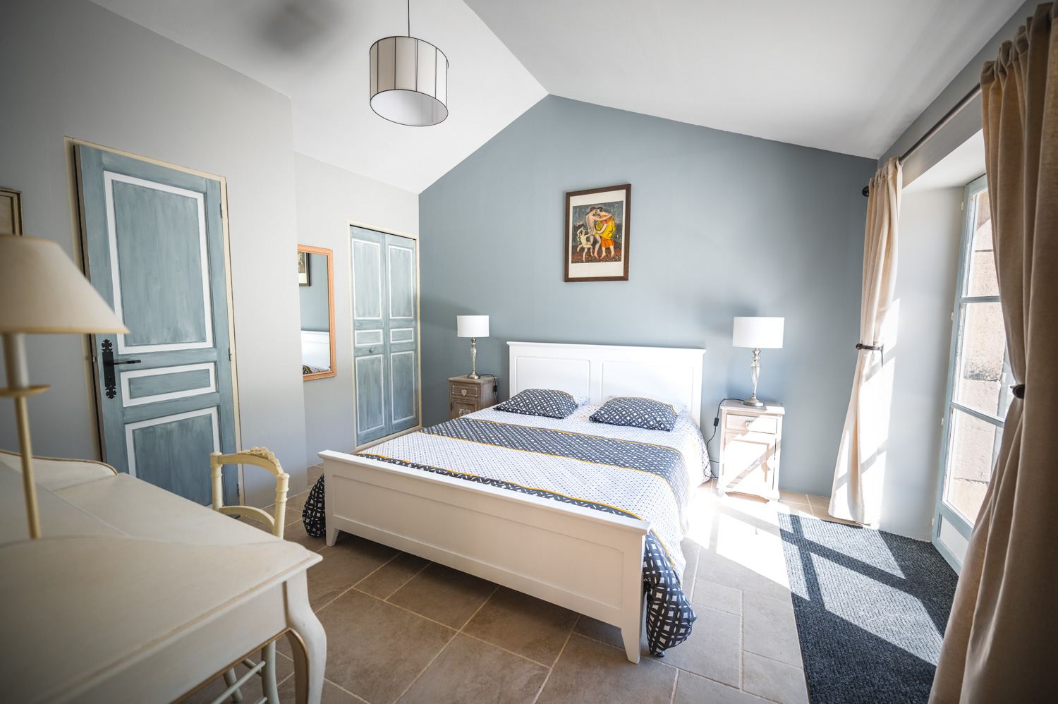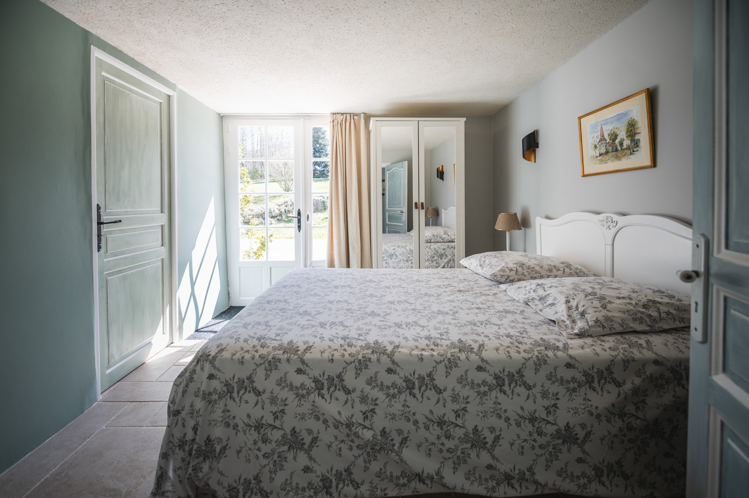 La chambre ”Aurore” dotée d’un grand lit 160×200, une salle de bain privative équipée d’une cabine de douche, lavabo et WC. (Serviettes et literie fournie)
