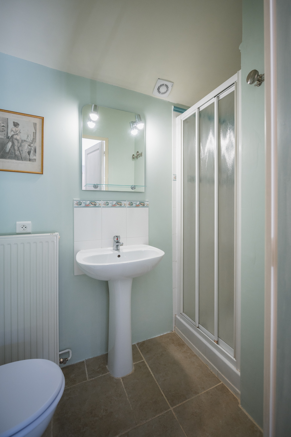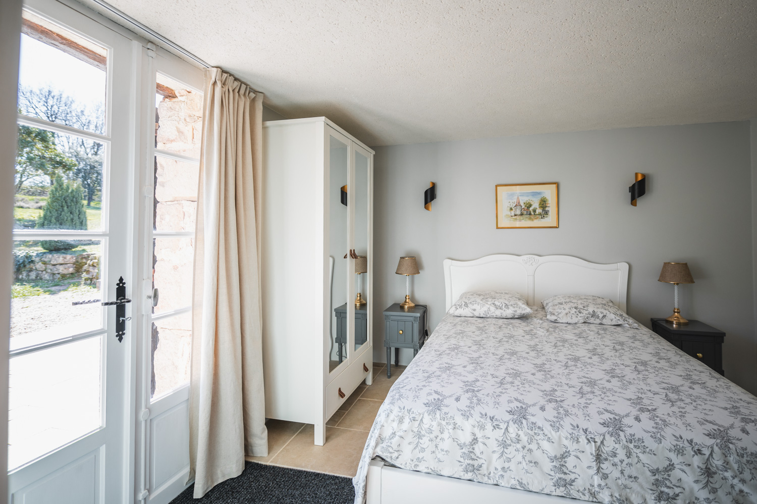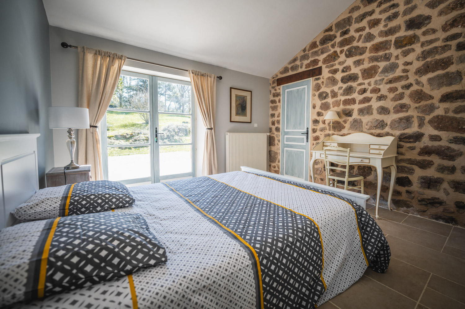 La chambre ”Crépuscule” dotée d’un grand lit 140×200, une salle de bain privative équipée d’une cabine de douche, lavabo et WC. (Serviettes et literie fournie)