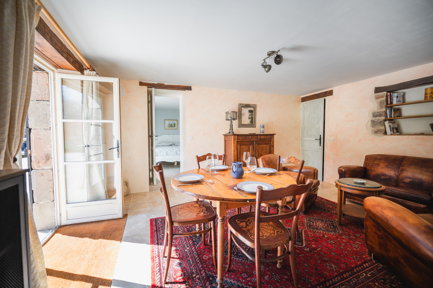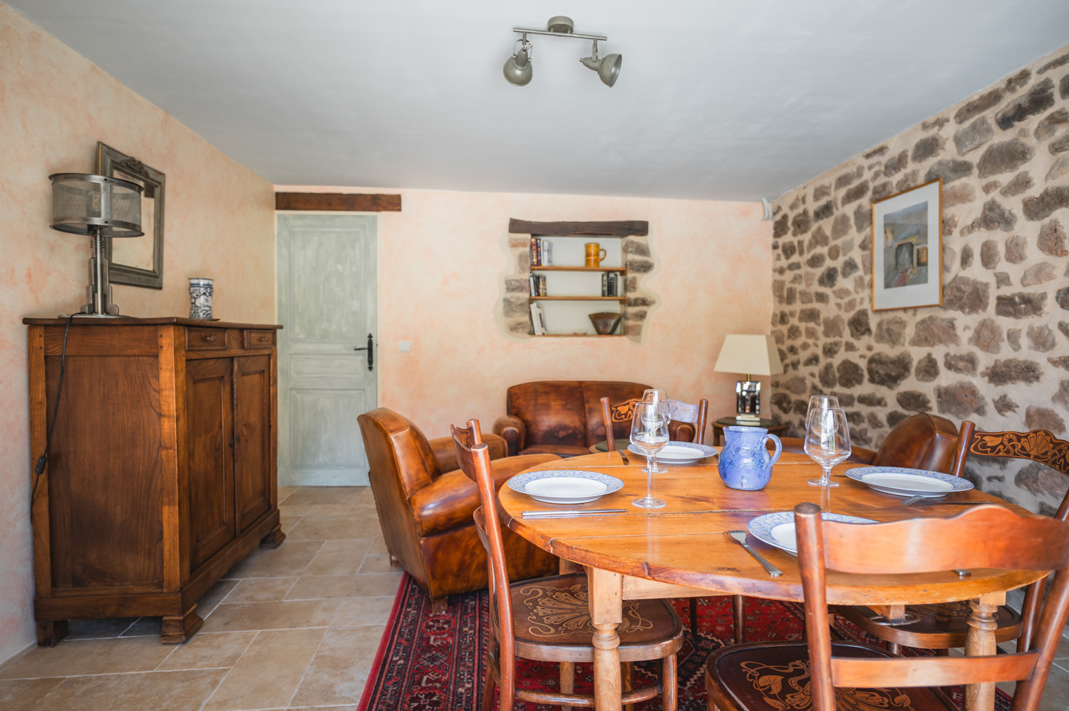 Le salon salle à manger au charme vintage, club en cuir patinés, chaises de bistrot année 30, luminaires industriels, Smart TV connectée, enceinte Marshall Bluetooth à votre disposition. Les repas ou petit déjeuners peuvent être pris à l’extérieur en terrasse