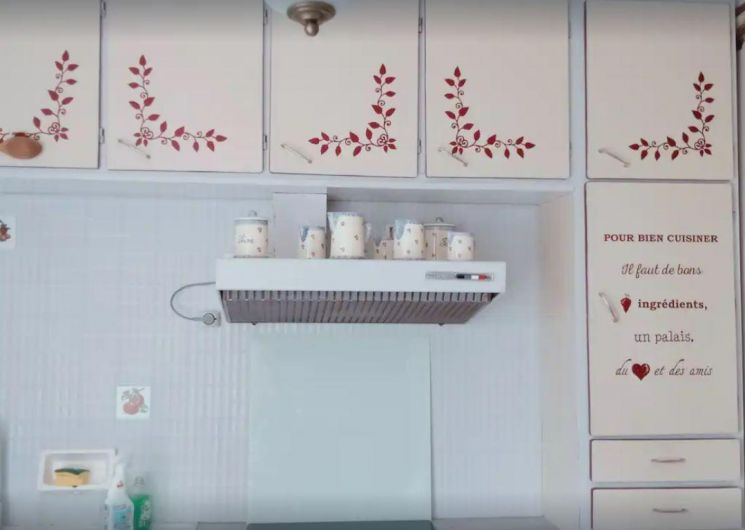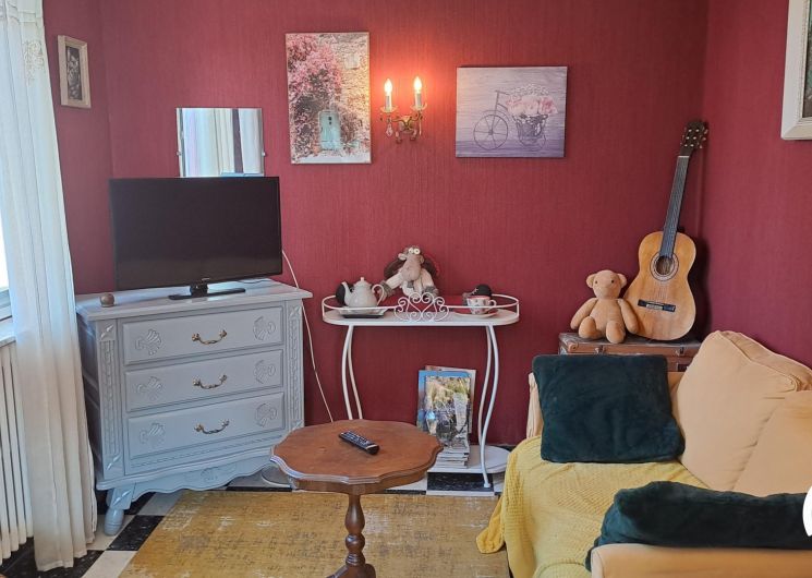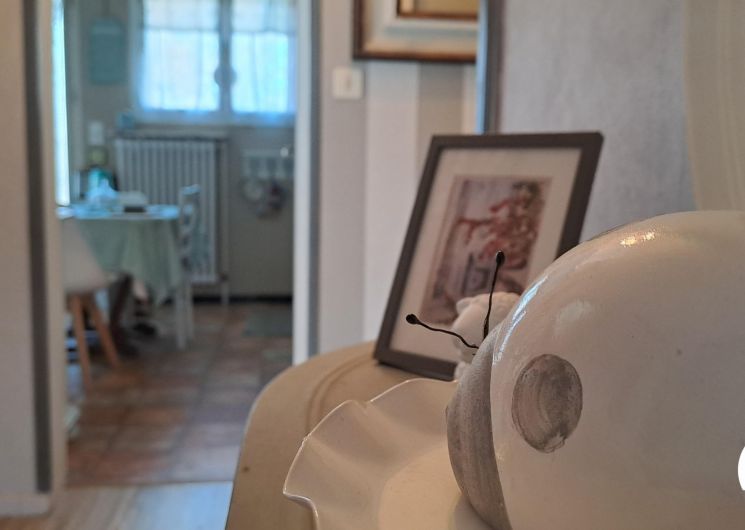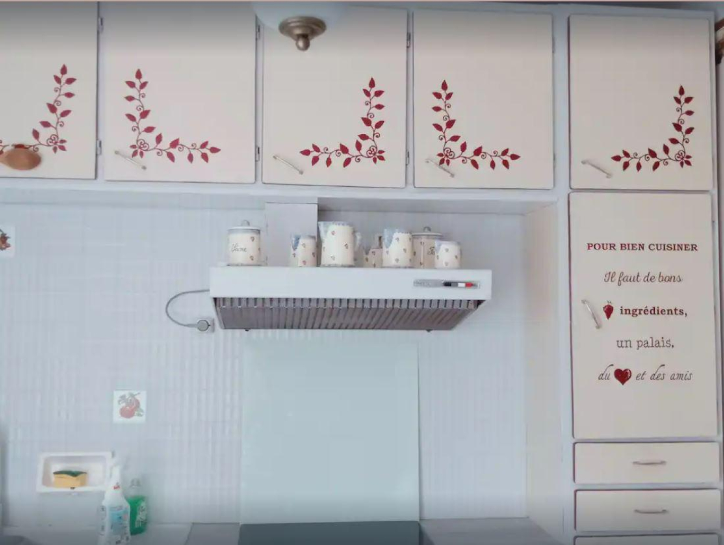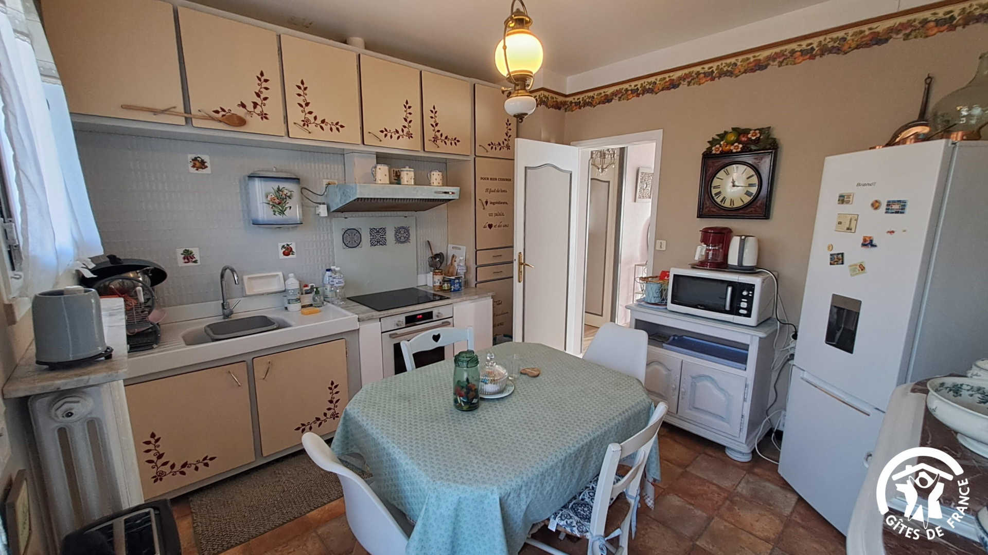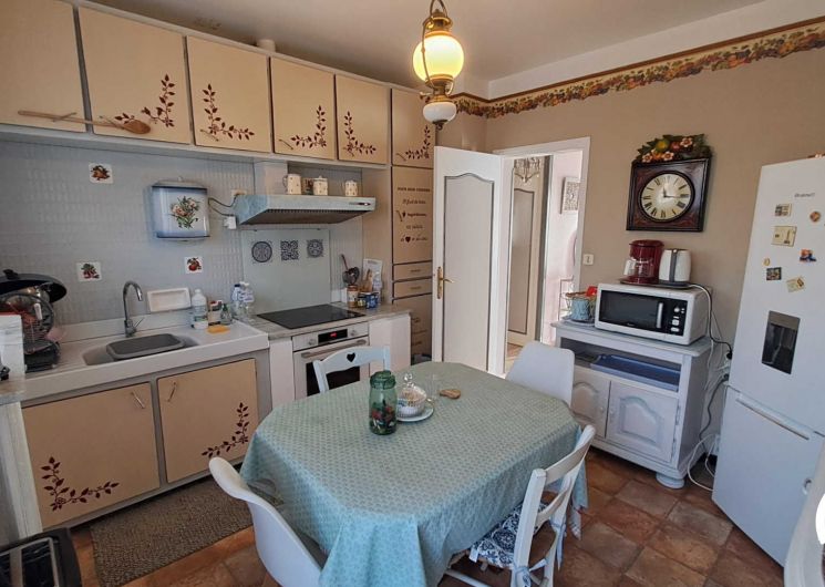 – Cuisine séparée équipée : four, plaque à induction, micro-ondes, grille-pain, bouilloire, cafetière à filtre, frigo, crêpière. Depuis la cuisine, une porte donne sur l’arrière de la maison avec un escalier extérieur.