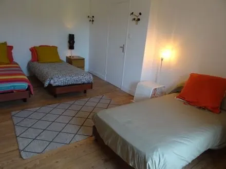 A l’étage, deux chambres pour des nuits paisibles : une chambre parentale avec un lit Queen size et une seconde au grand volume avec 3 lits simples (2 lits peuvent se jumeler pour faire un Queen size) et disposant d’un balcon avec vue sur le jardin .