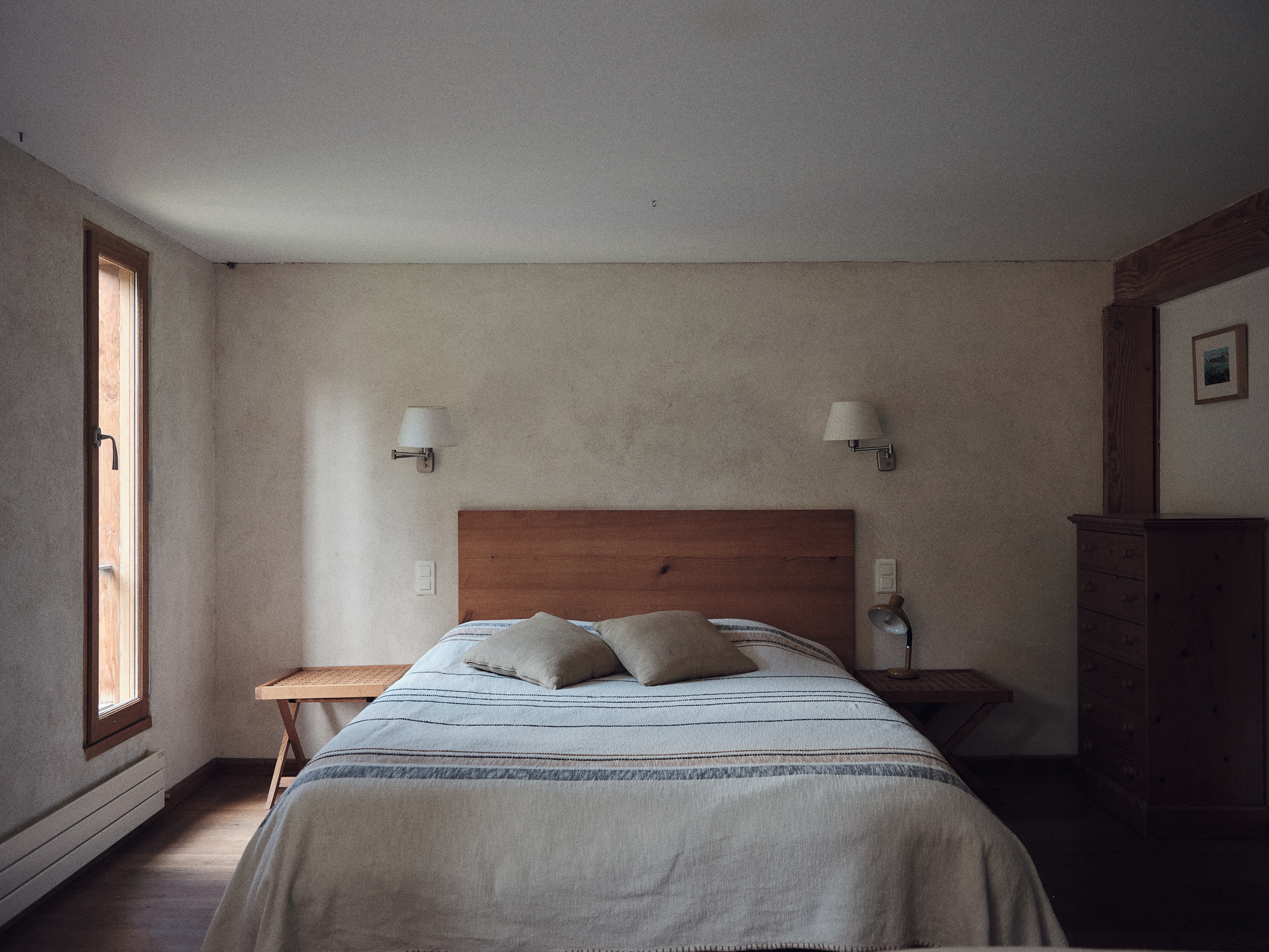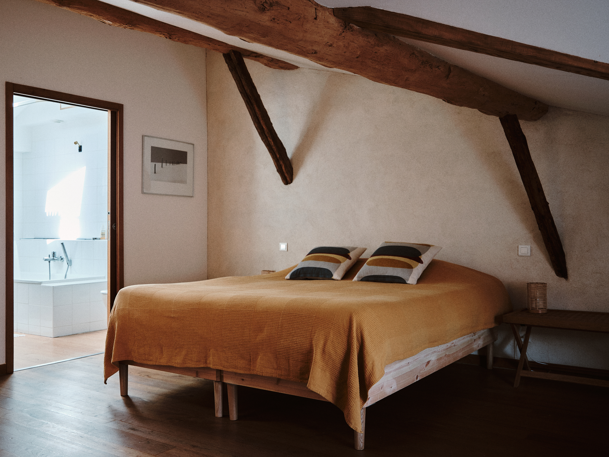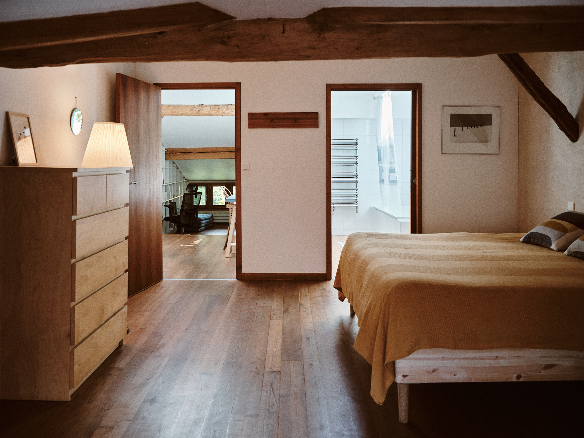 Dos bonitas habitaciones abuhardilladas componen la planta superior. Una zona infantil con biblioteca, TV y dos camas individuales se abre a una zona de estudio. Una habitación independiente con 4 camas individuales (que pueden organizarse en una cama king-size (180 cm) y 2 camas individuales) da acceso a un segundo cuarto de baño y wc.