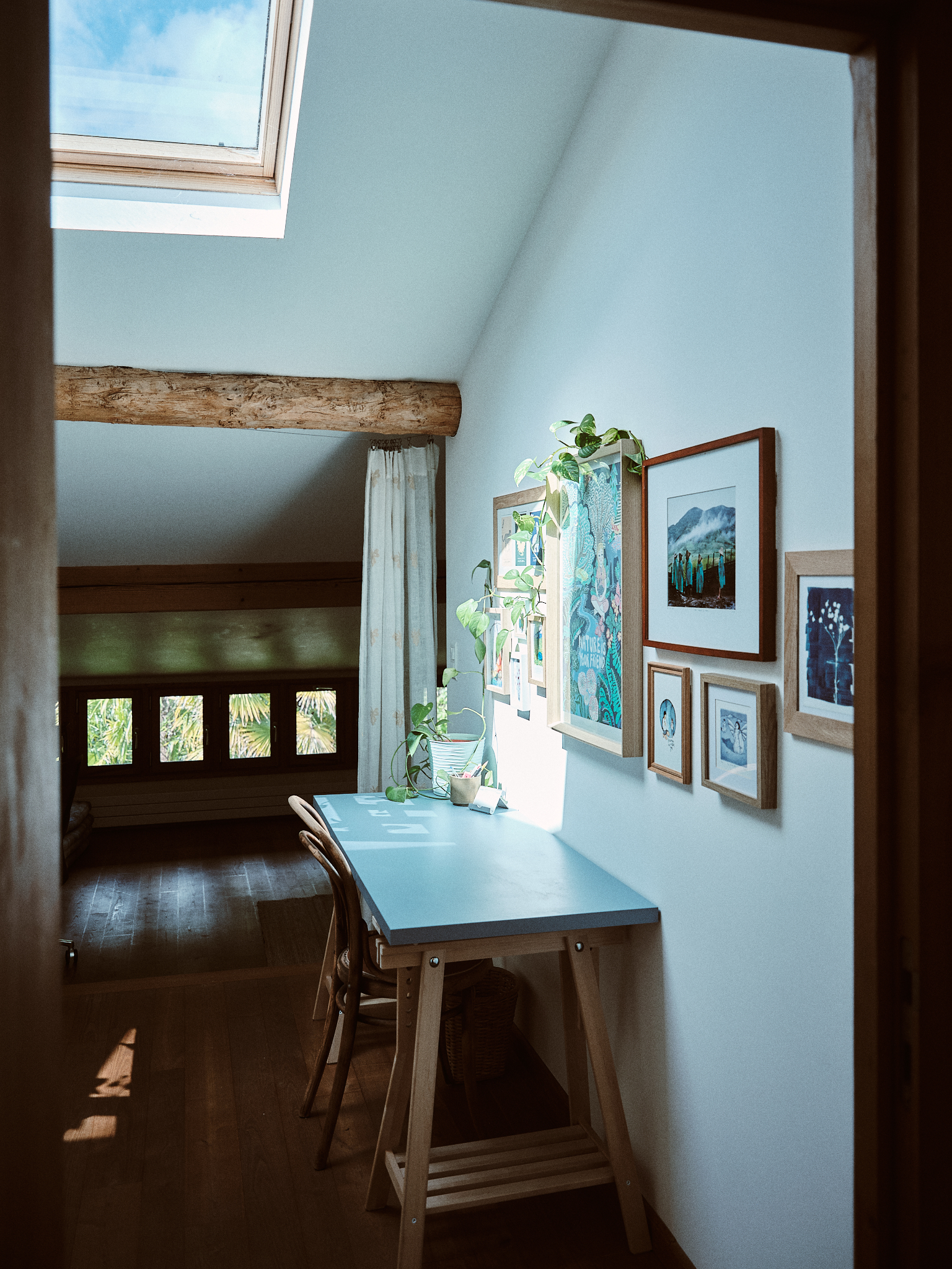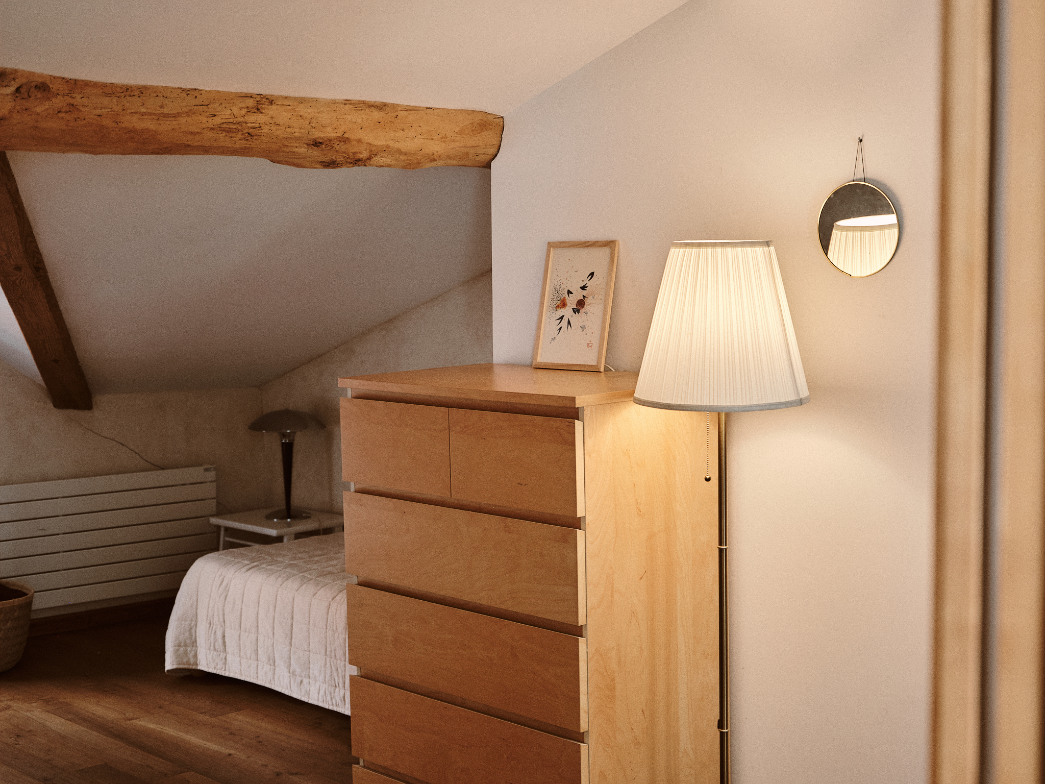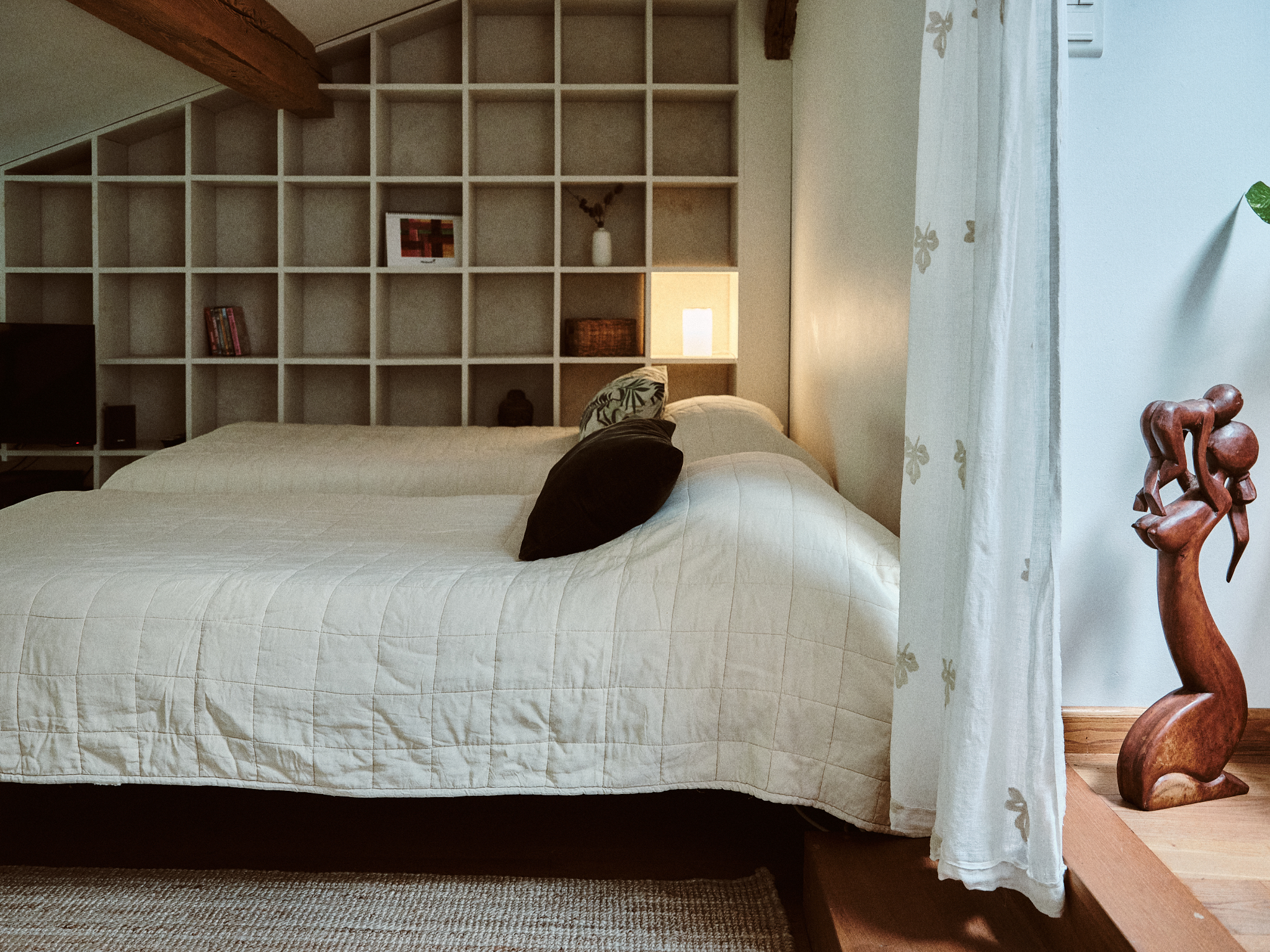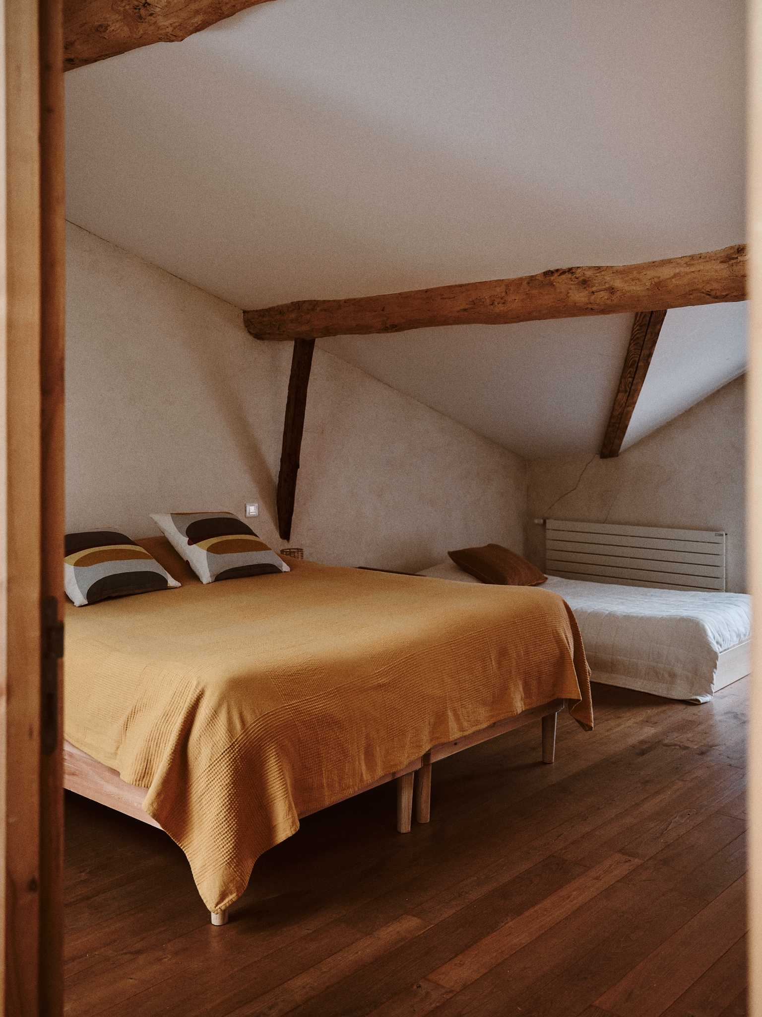 Dos bonitas habitaciones abuhardilladas componen la planta superior. Una zona infantil con biblioteca, TV y dos camas individuales se abre a una zona de estudio. Una habitación independiente con 4 camas individuales (que pueden organizarse en una cama king-size (180 cm) y 2 camas individuales) da acceso a un segundo cuarto de baño y wc.