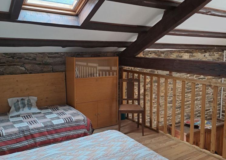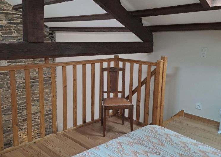 Le coin nuit se trouve en mezzanine de 16 m2 accessible par un escalier en bois, sous une charpente chaleureuse :