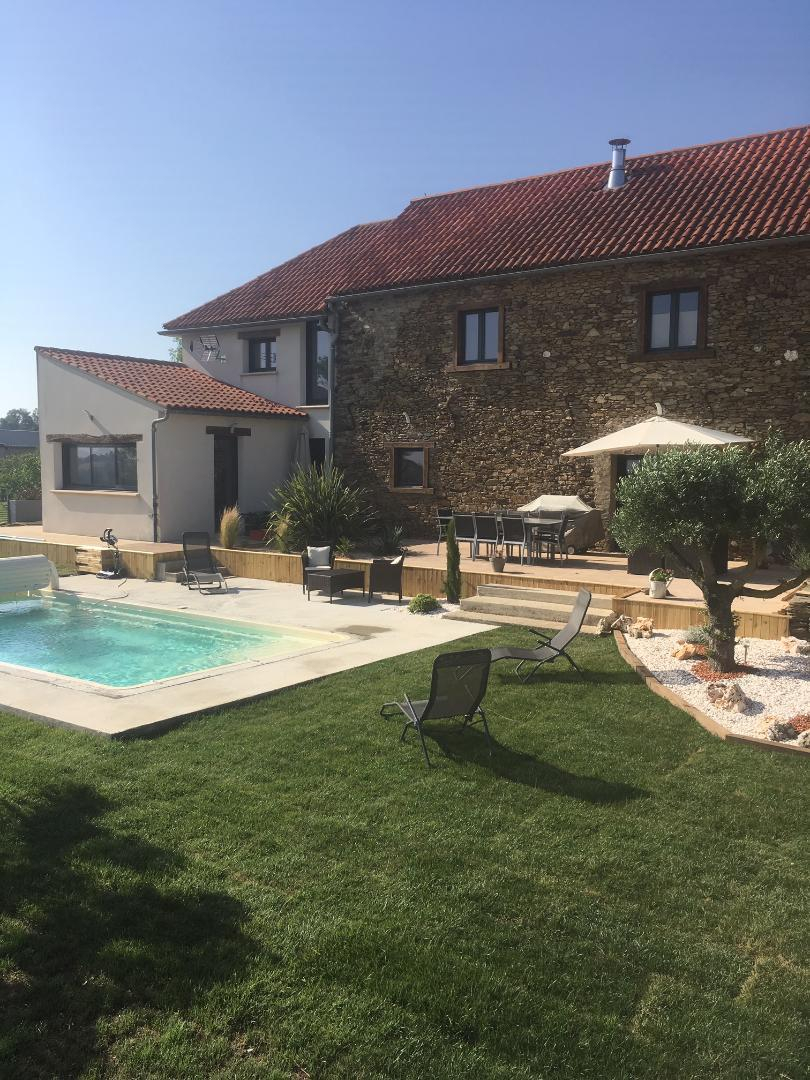 Les extérieurs : un peu plus de 1500m² de jardin devant la maison avec terrain de pétanque à côté de l’enclos des moutons (qui appartiennent aux propriétaires). Une belle piscine privative et chauffée de mai à octobre (ther