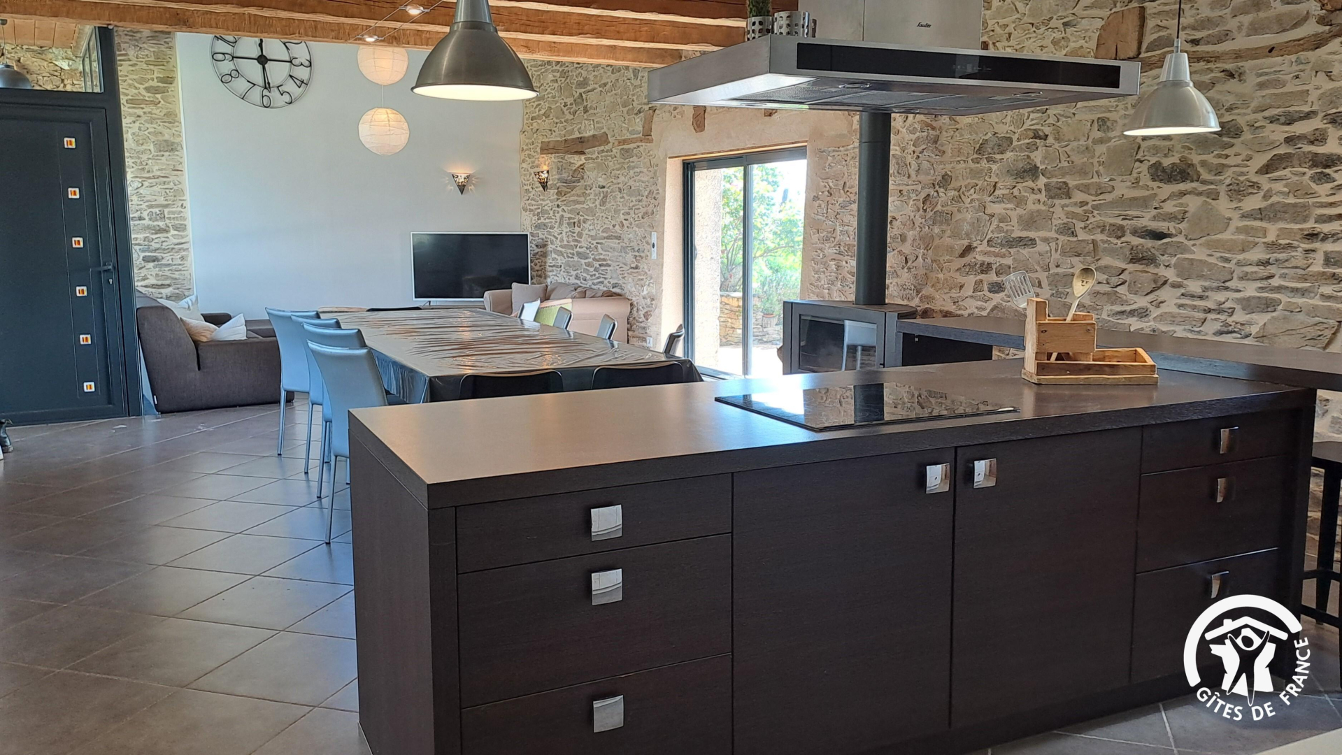 – cuisine ouverte toute équipée avec une salle à manger et salon. Cuisine équipée d’un lave-vaisselle, four, grille-pain, bouilloire, micro-ondes, cafetière à filtre et à dosettes Tassimo®. Réfrigérateur avec congélateur dans le cellier derrière la cuisine, ainsi que lave-linge.