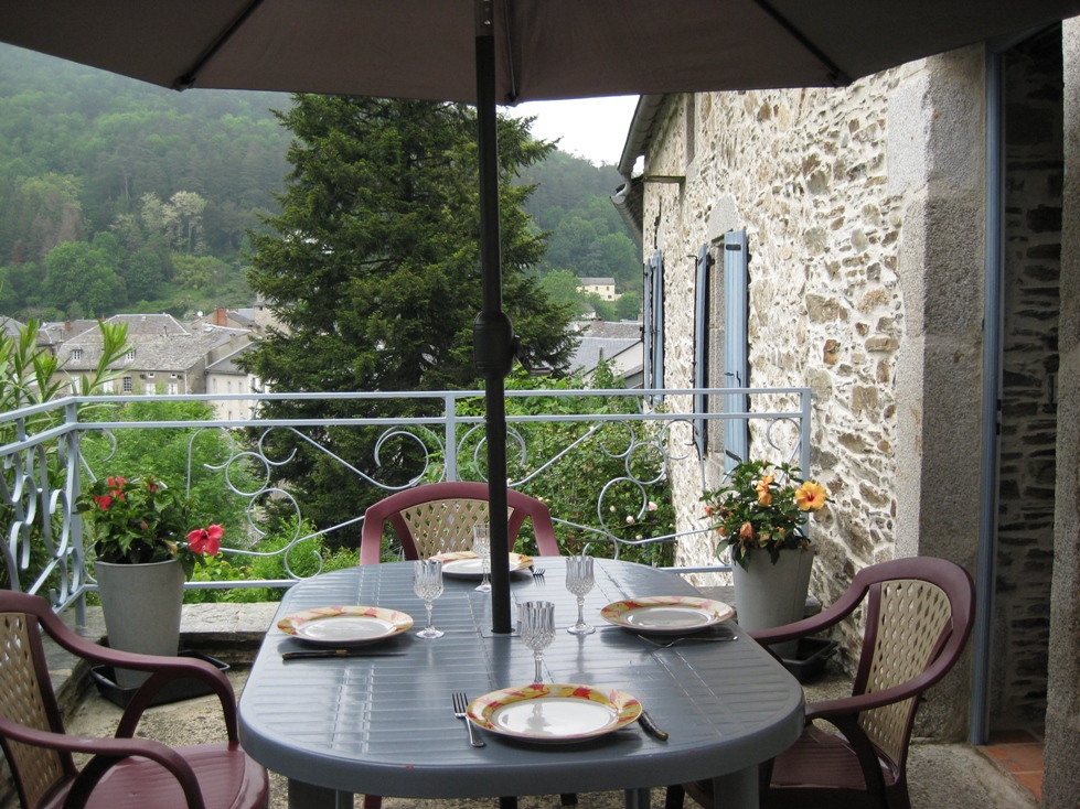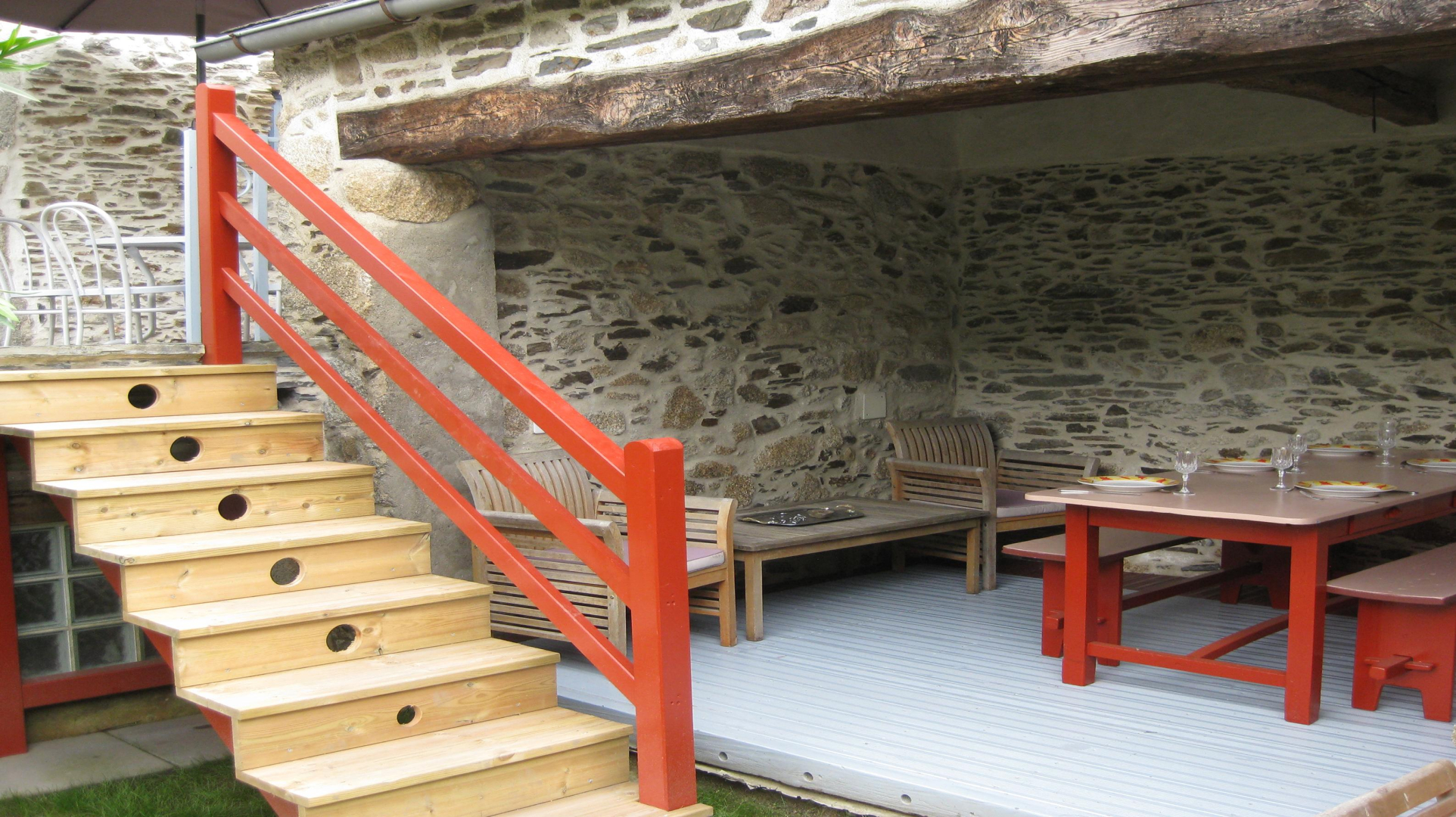 – Terrasse privative de 15m² avec hamac, transats, table ronde, chaises et parasol. Cette terrasse surplombe le jardin du propriétaire et offre une vue dégagée sur le village. Accès à la cuisine d’été et son espace vert par escaliers extérieurs.