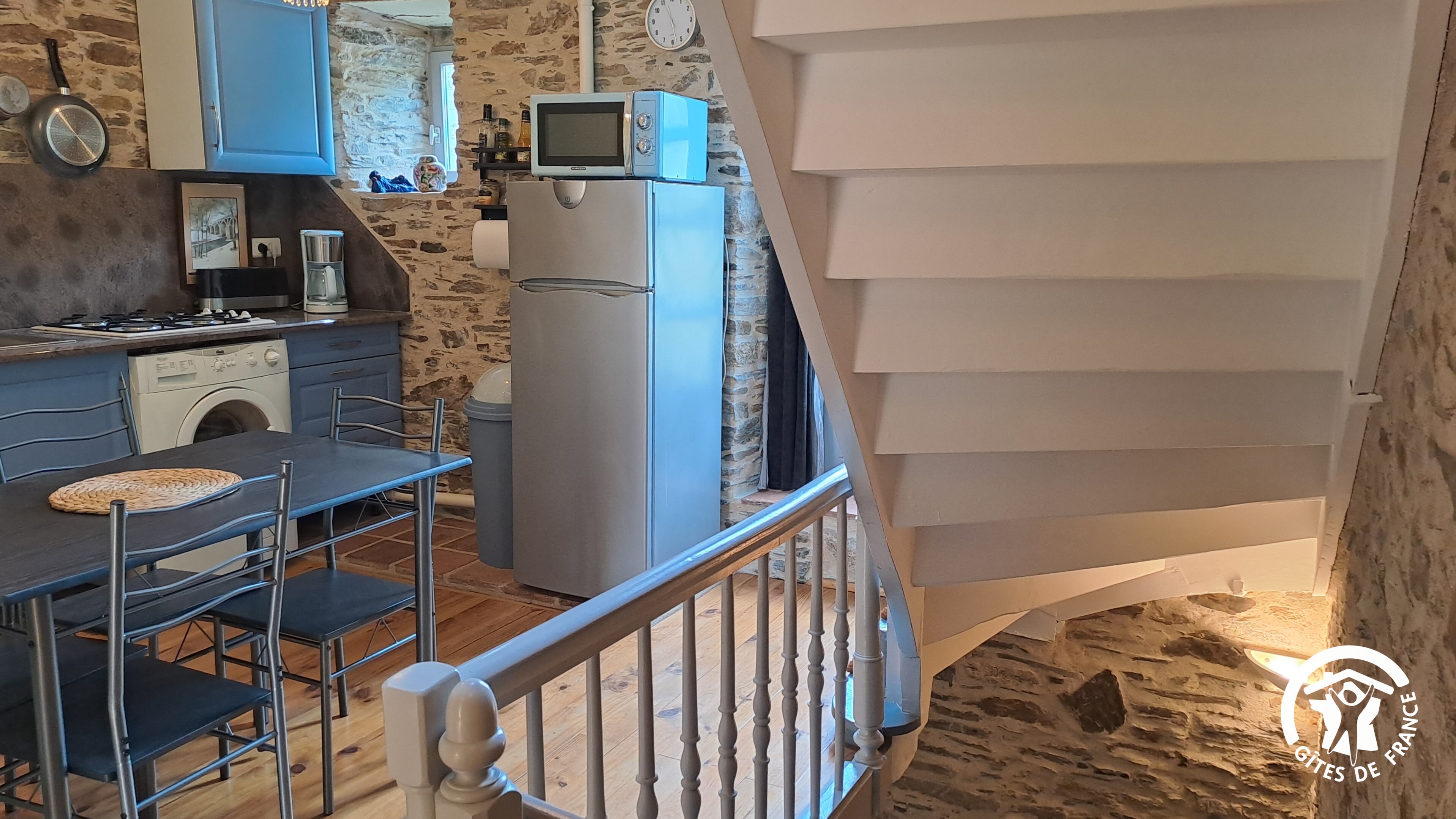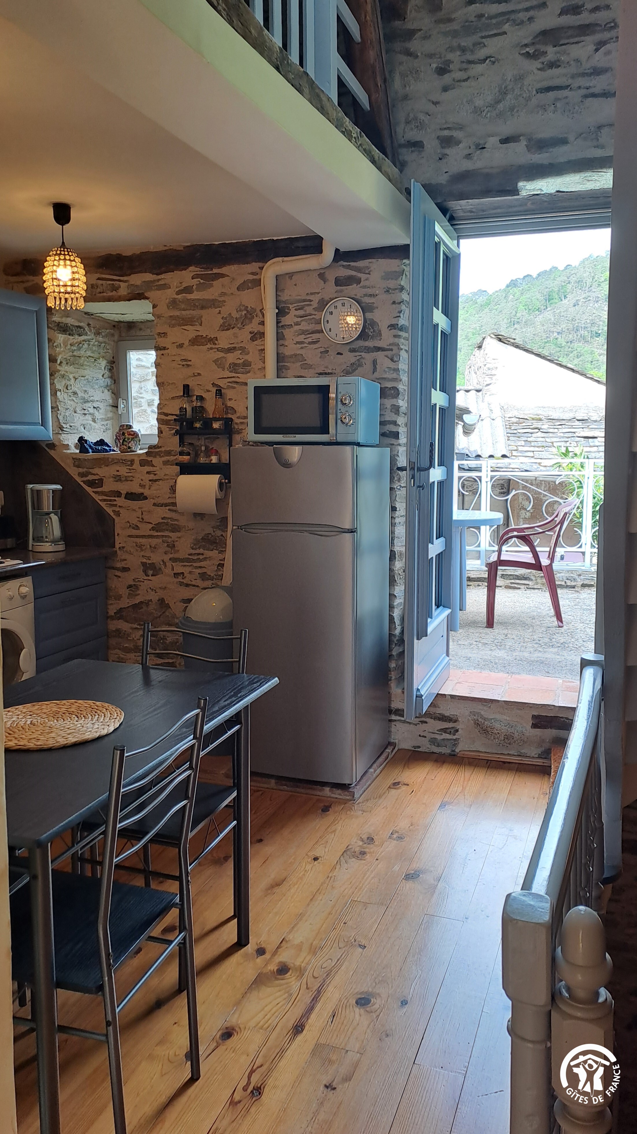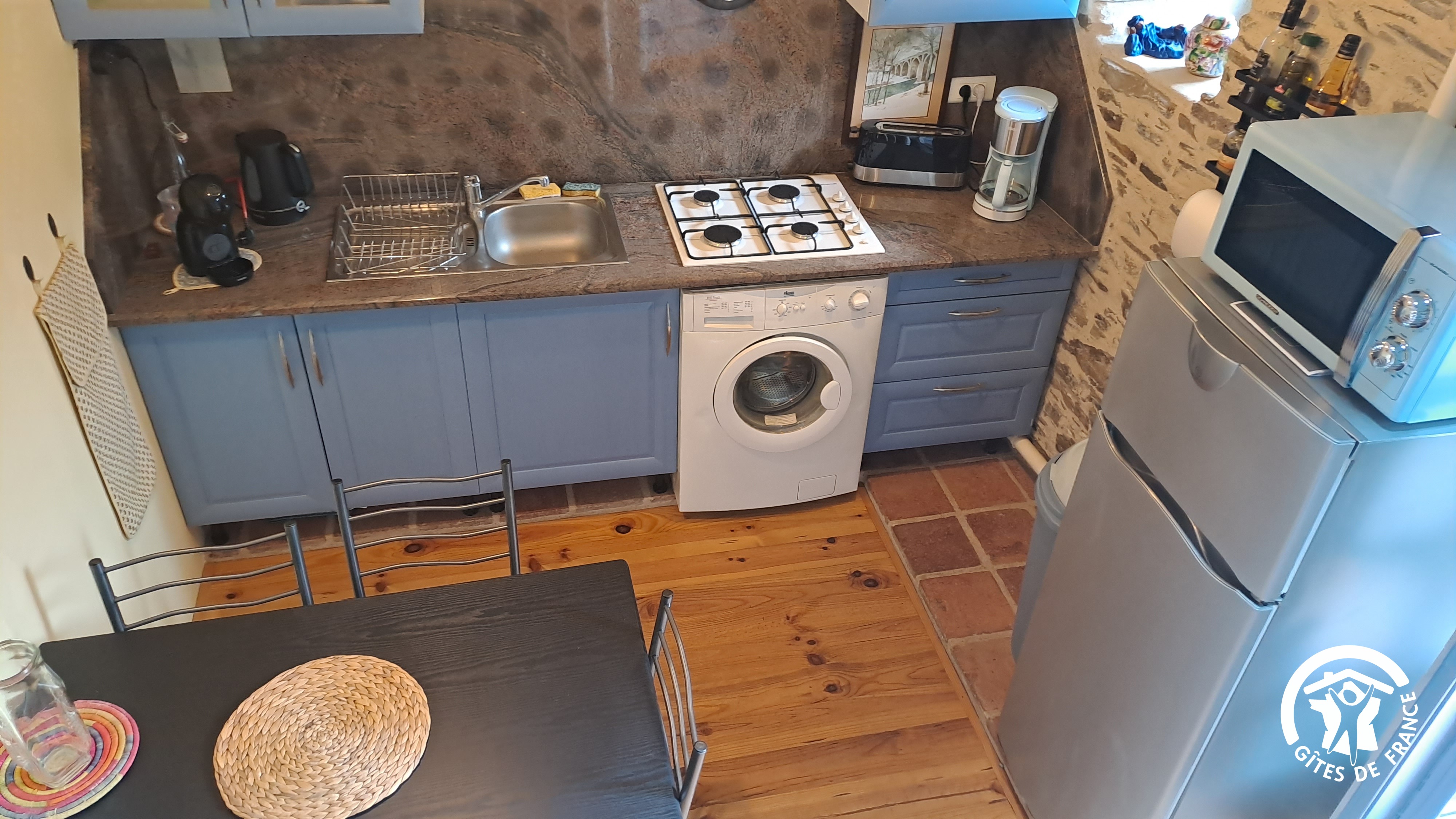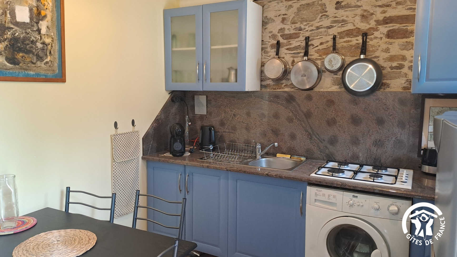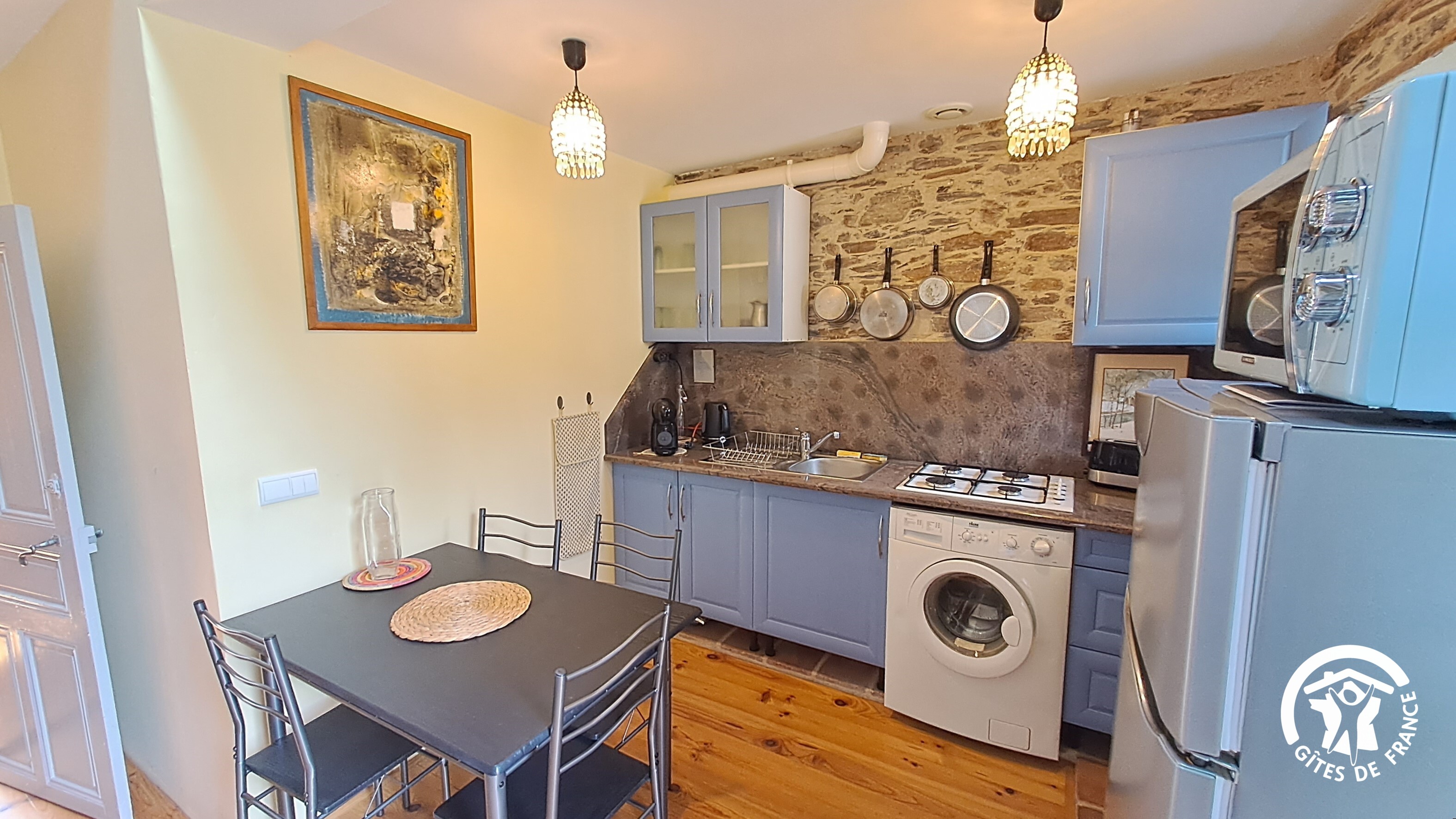 – Cuisine avec table à manger : micro-ondes, cafetière à filtre et à dosettes Dolce Gusto, bouilloire, réfrigérateur avec compartiment freezer, lave-linge (pas de four). Accès sur terrasse.