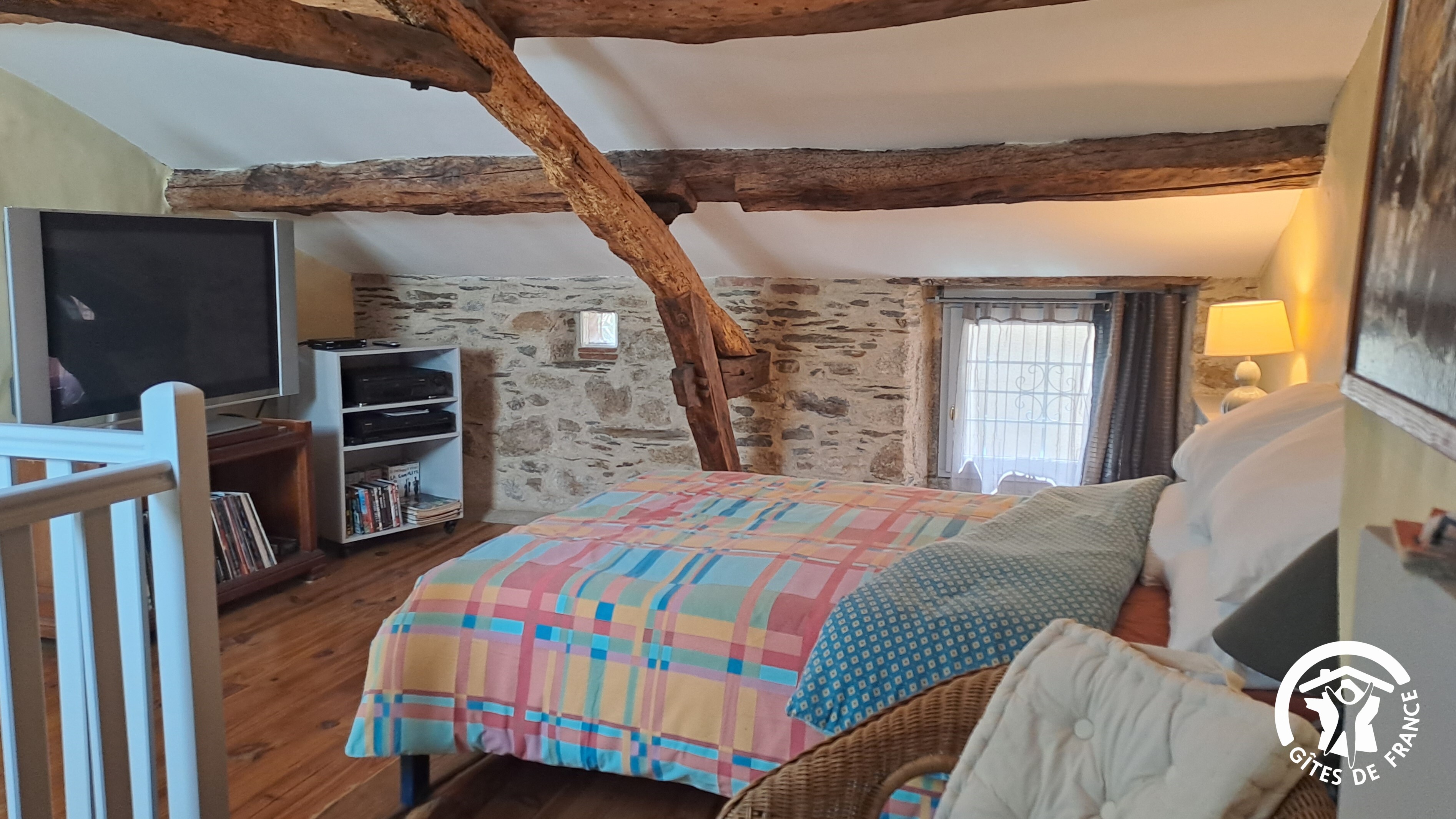 – Chambre en mezzanine avec lit en 140x190cm, salon d’appoint, climatiseur mobile, TV et lecteurs multimédia. La chambre en mezzanine est ouverte sur la cuisine/salle à manger.