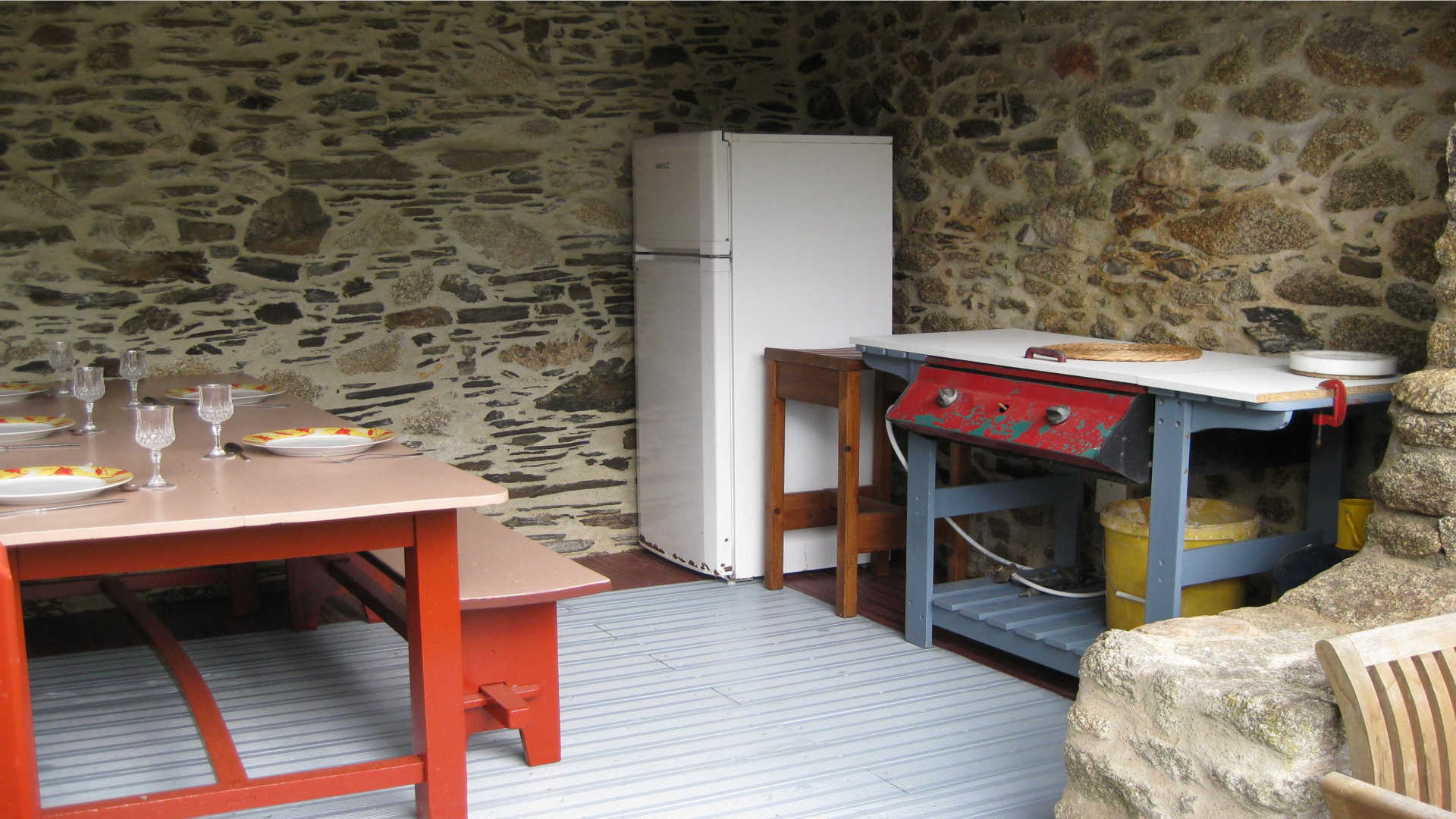 Extérieur : – Cuisine d’été équipée d’une grande table (6 personnes), 2 bancs, fauteuils, réfrigérateur avec compartiment freezer. Devant, un petit espace vert avec un barbecue, fauteuil d’extérieur et place pour les transats.