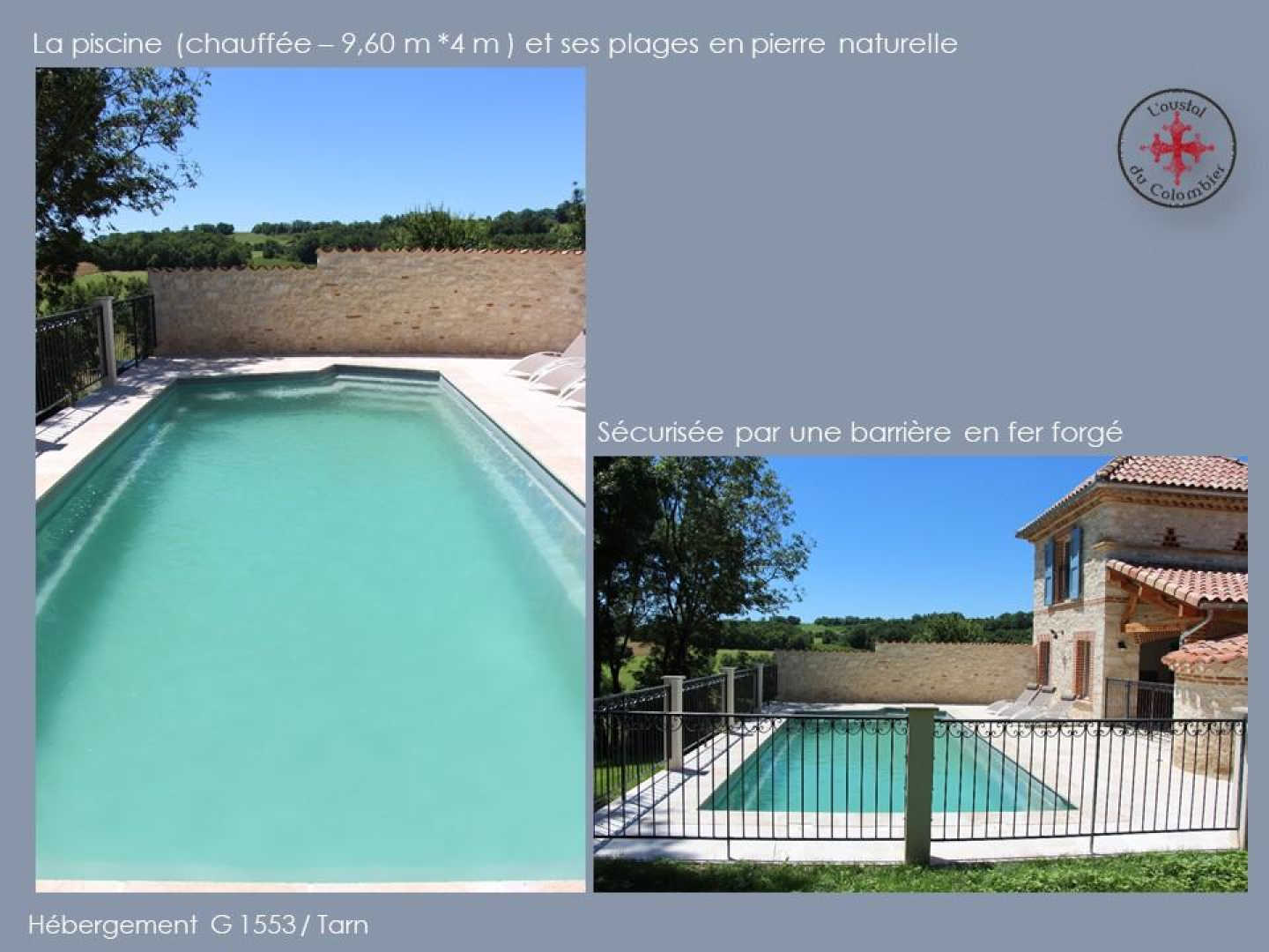Gîte indépendant, avec piscine privative chauffée et sécurisée, au sel, régulateur de PH, dimensions 9.60x4m, fond plat profondeur 1.50 m. Deux terrasses, dont une couverte, transats, cuisine d’été à côté de la piscine au rez-de-chaussée du Colombier.