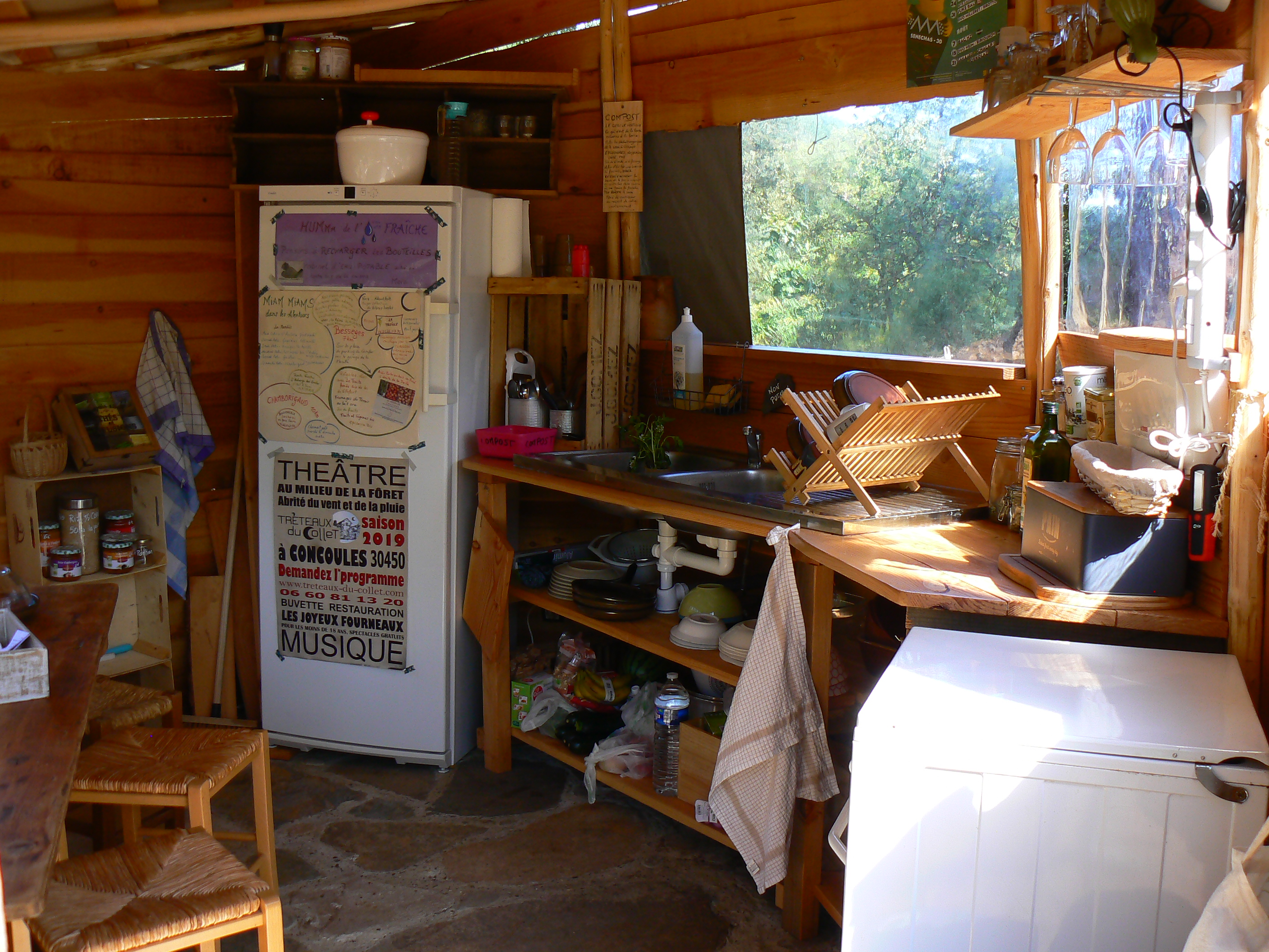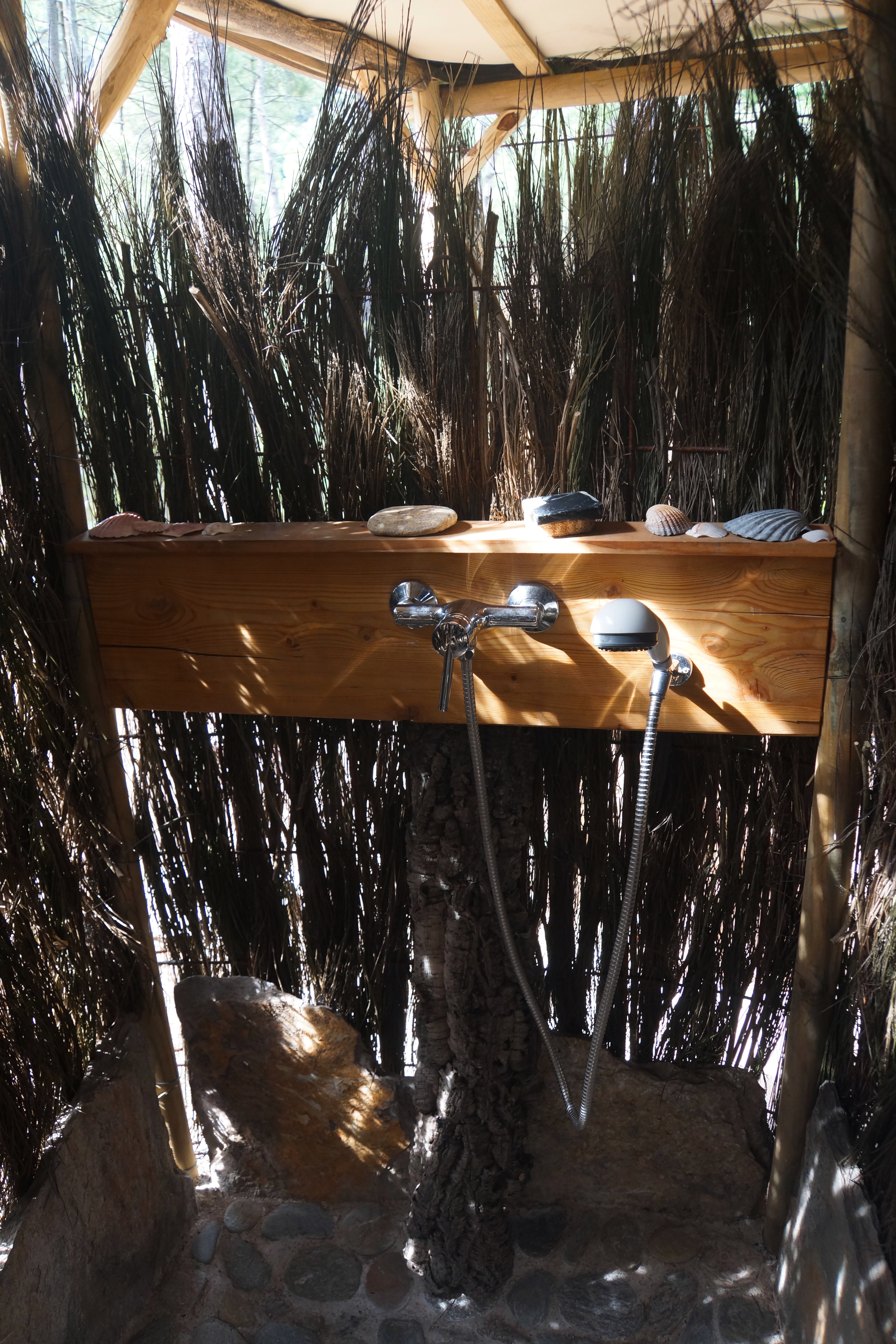 Tentes et cabanes ont accès à la douche extérieure commune, ainsi qu’à la cuisine équipée partagée par 6 personnes maximum.