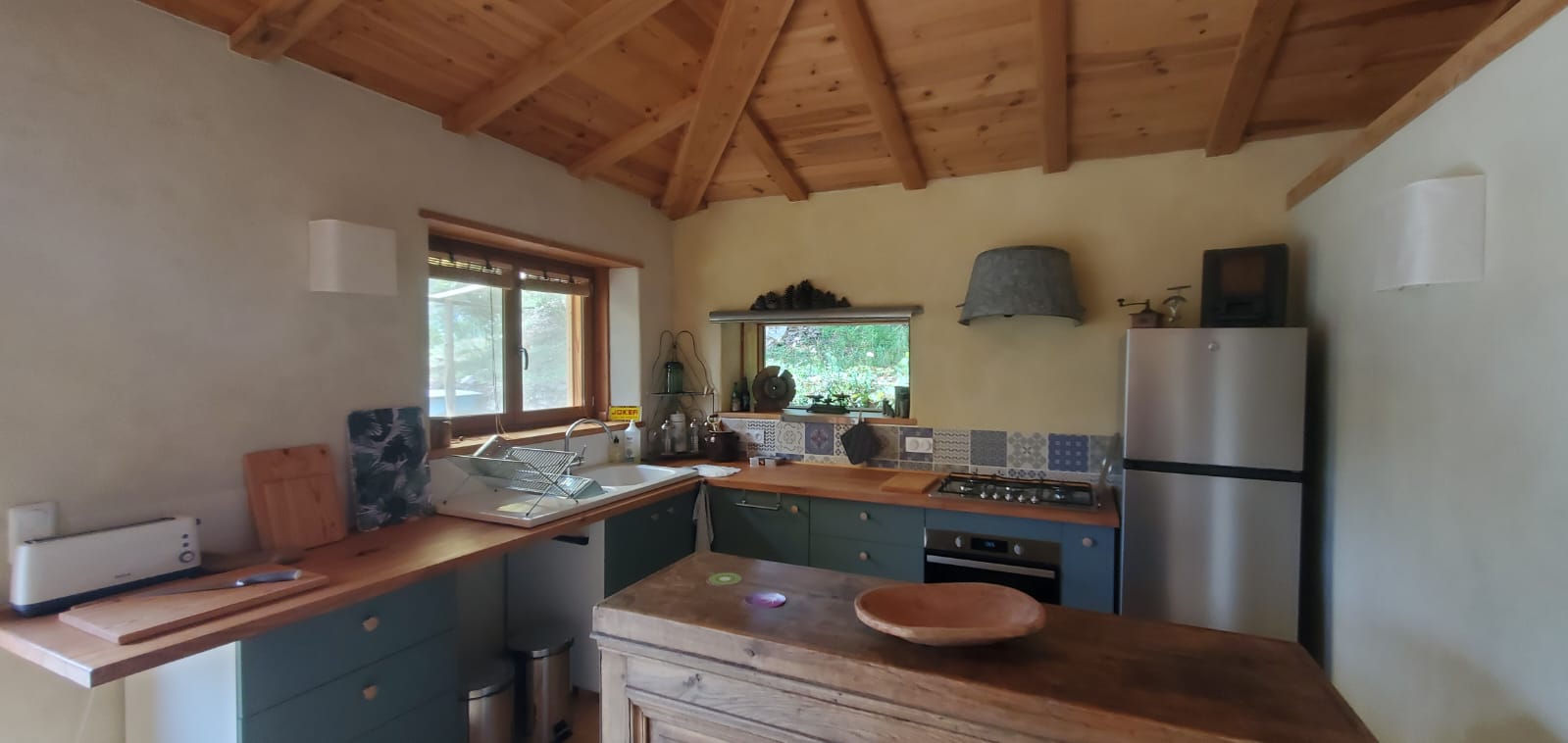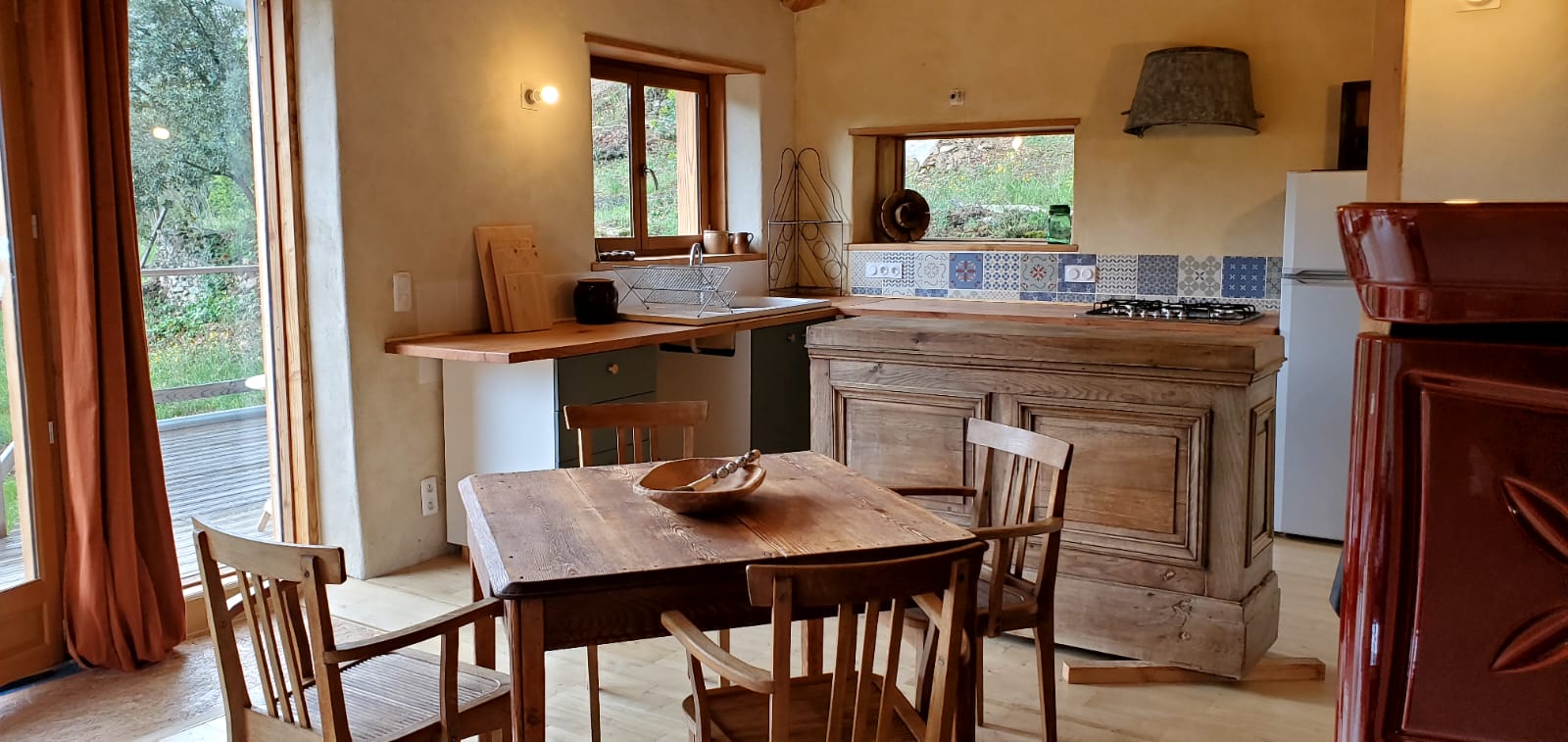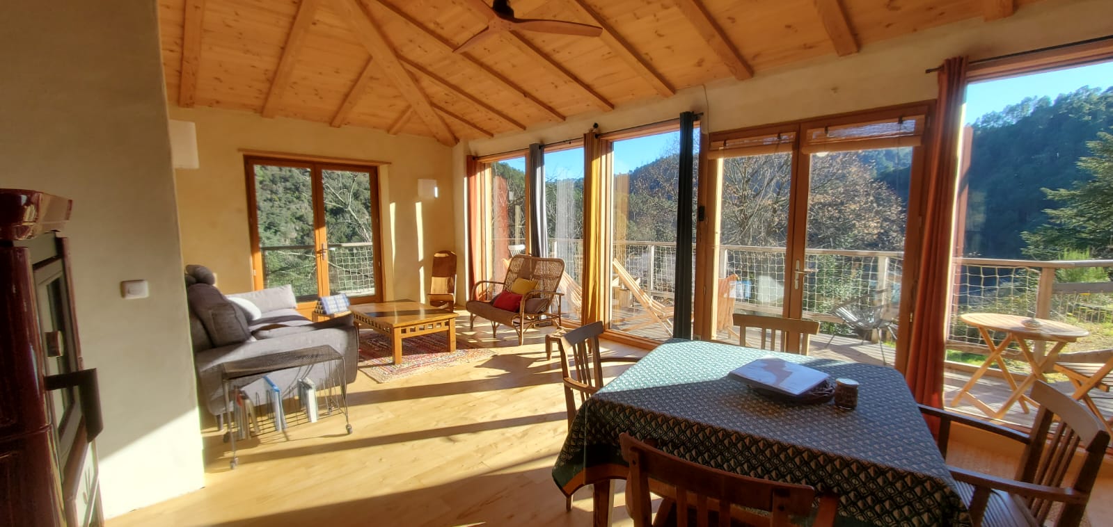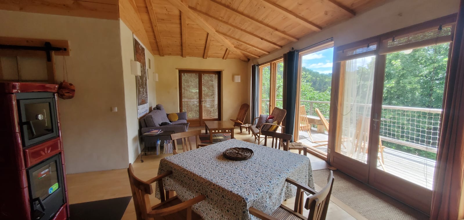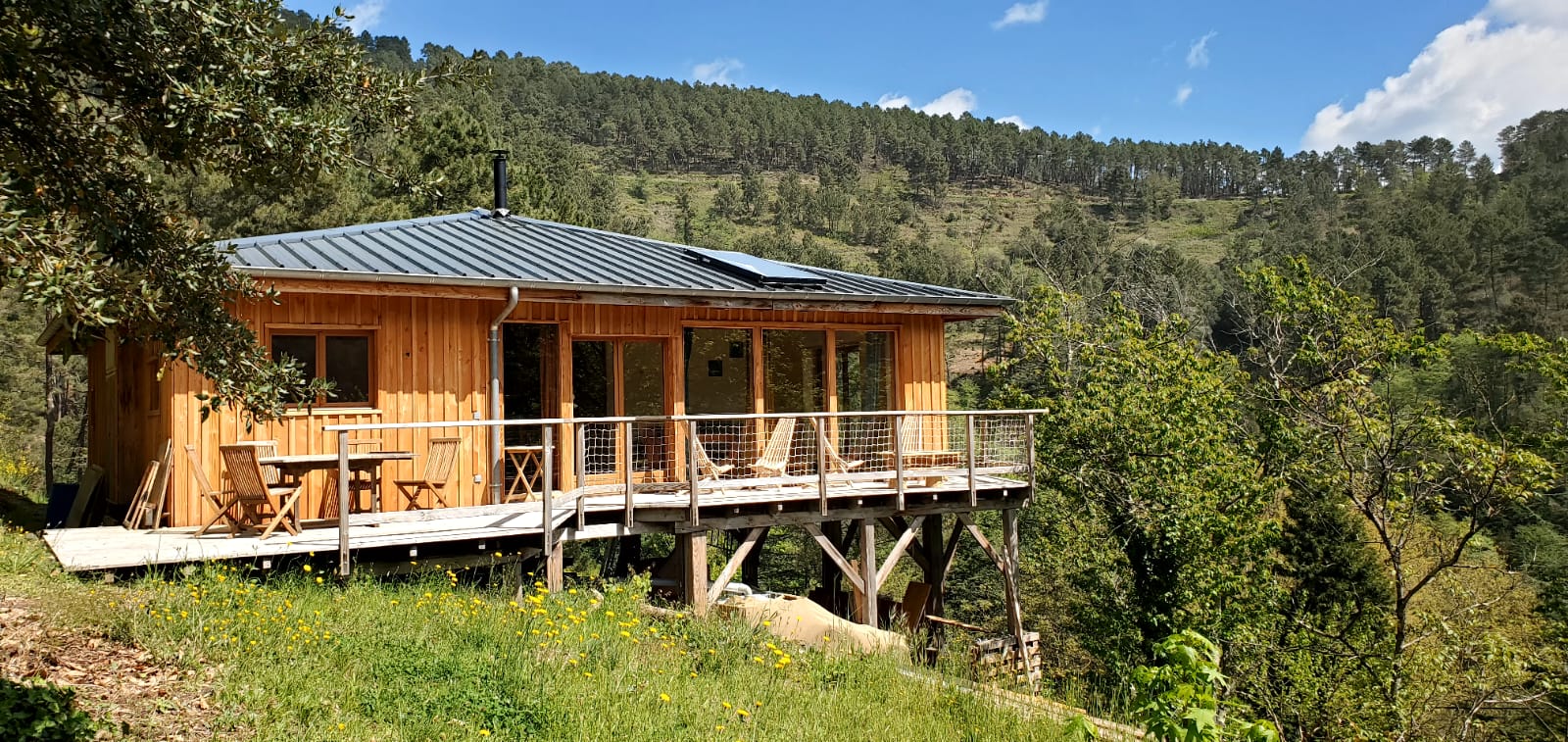 – La maison bioclimatique sur pilotis, qui accueille jusqu’à 5 personnes, avec une très belle vue sur la vallée. 2 chambres, beaucoup d’espace, cuisine pratique.