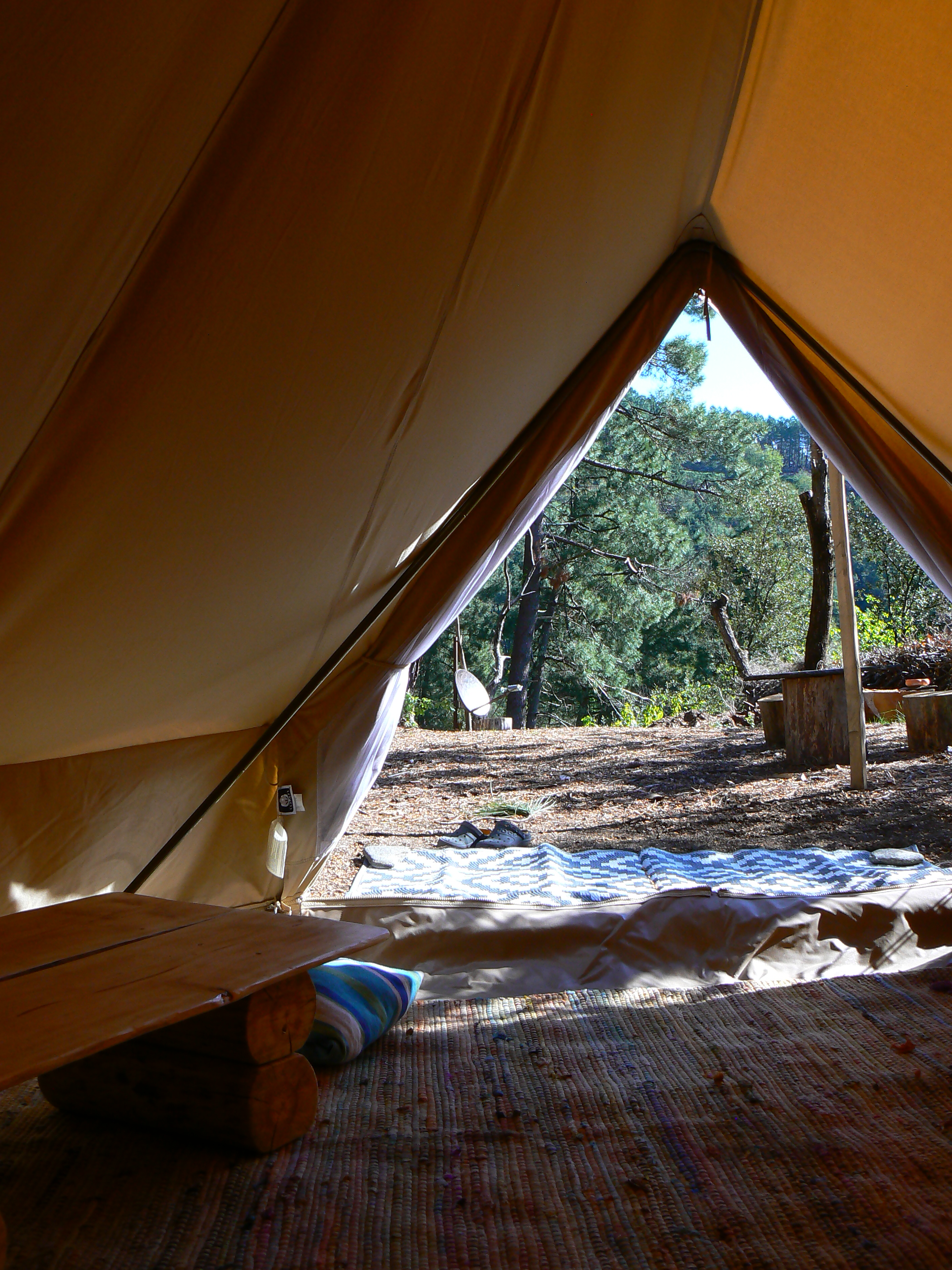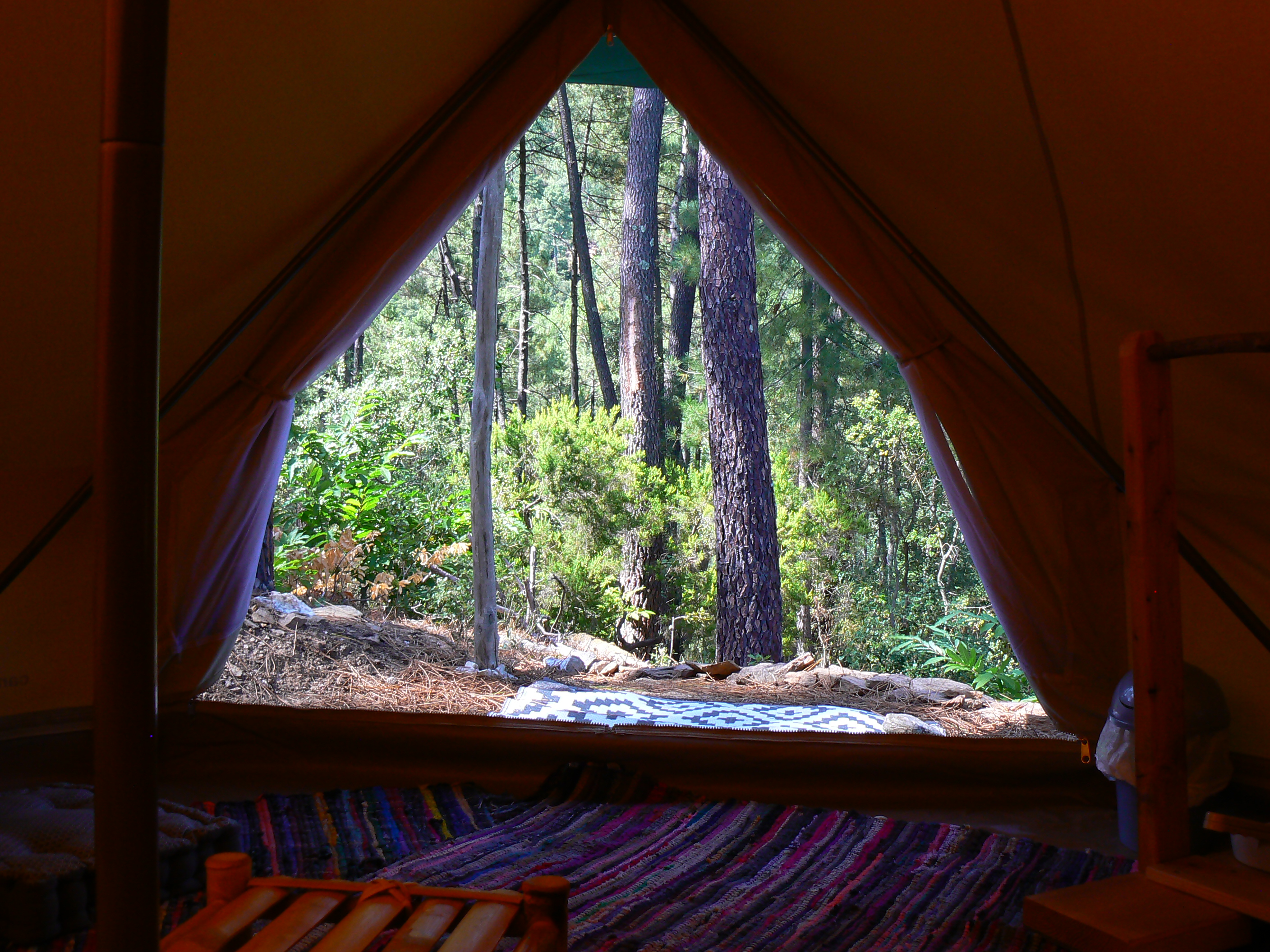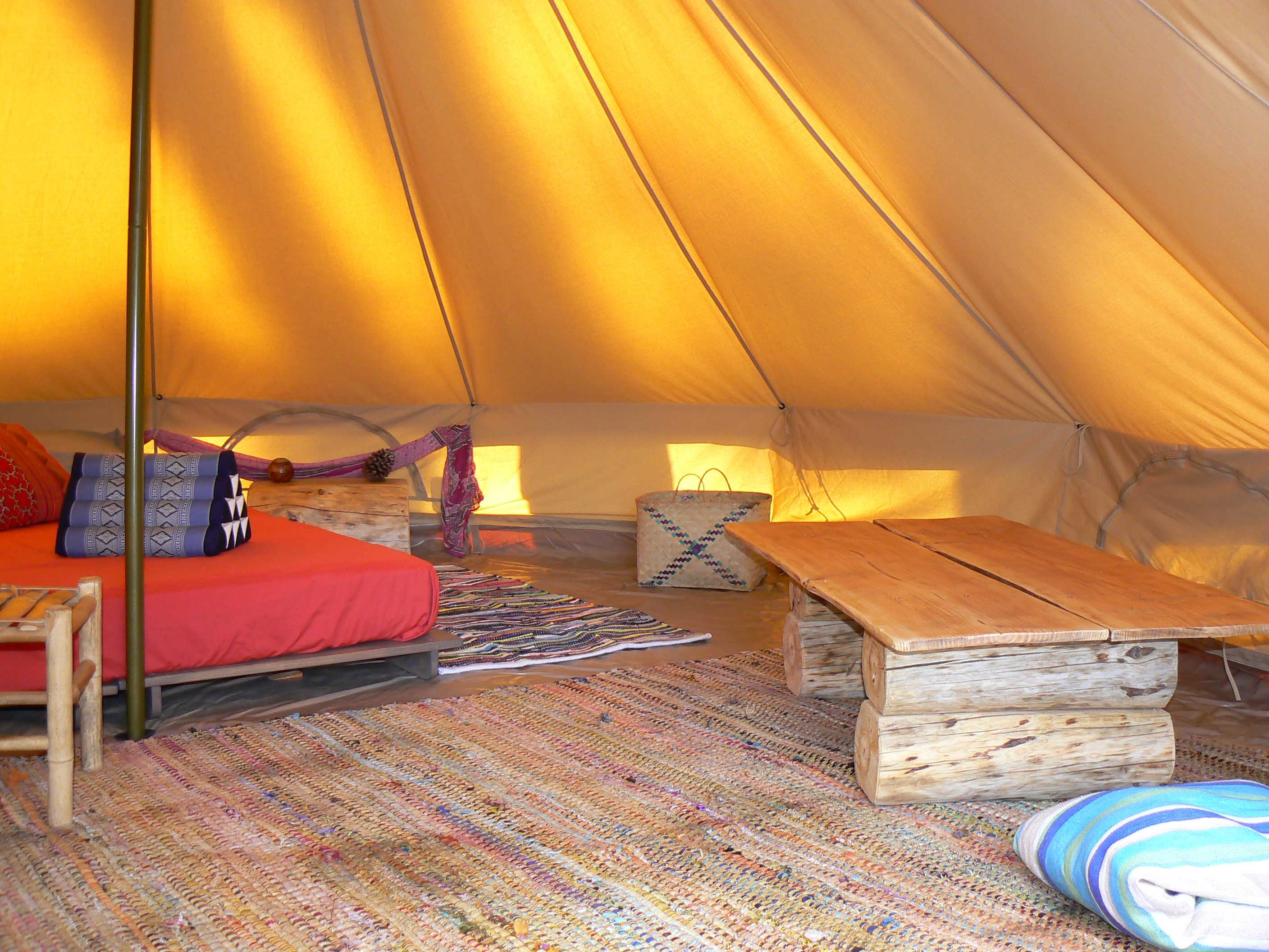 – Une des 2 tentes aménagées, 12 ou 15 m2, avec matelas 140 cm, petit mobilier fabriqué avec les matériaux locaux.