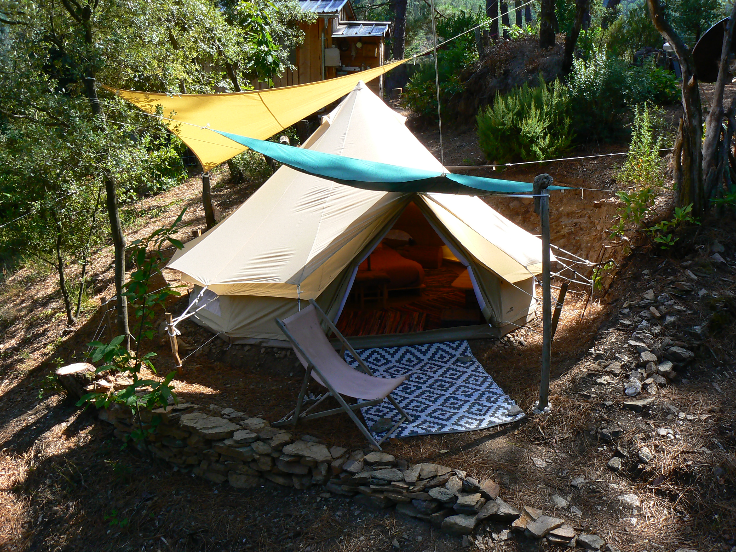 Eco-lieu pour des vacances sobres mais bien vivantes à 5mn de marche de la rivière. 4 hébergements : une maison bioclimatique sur pilotis pour des vacances en toute indépendance ; Une cabane sur pilotis et 2 tentes aménagées avec cuisine partagée.